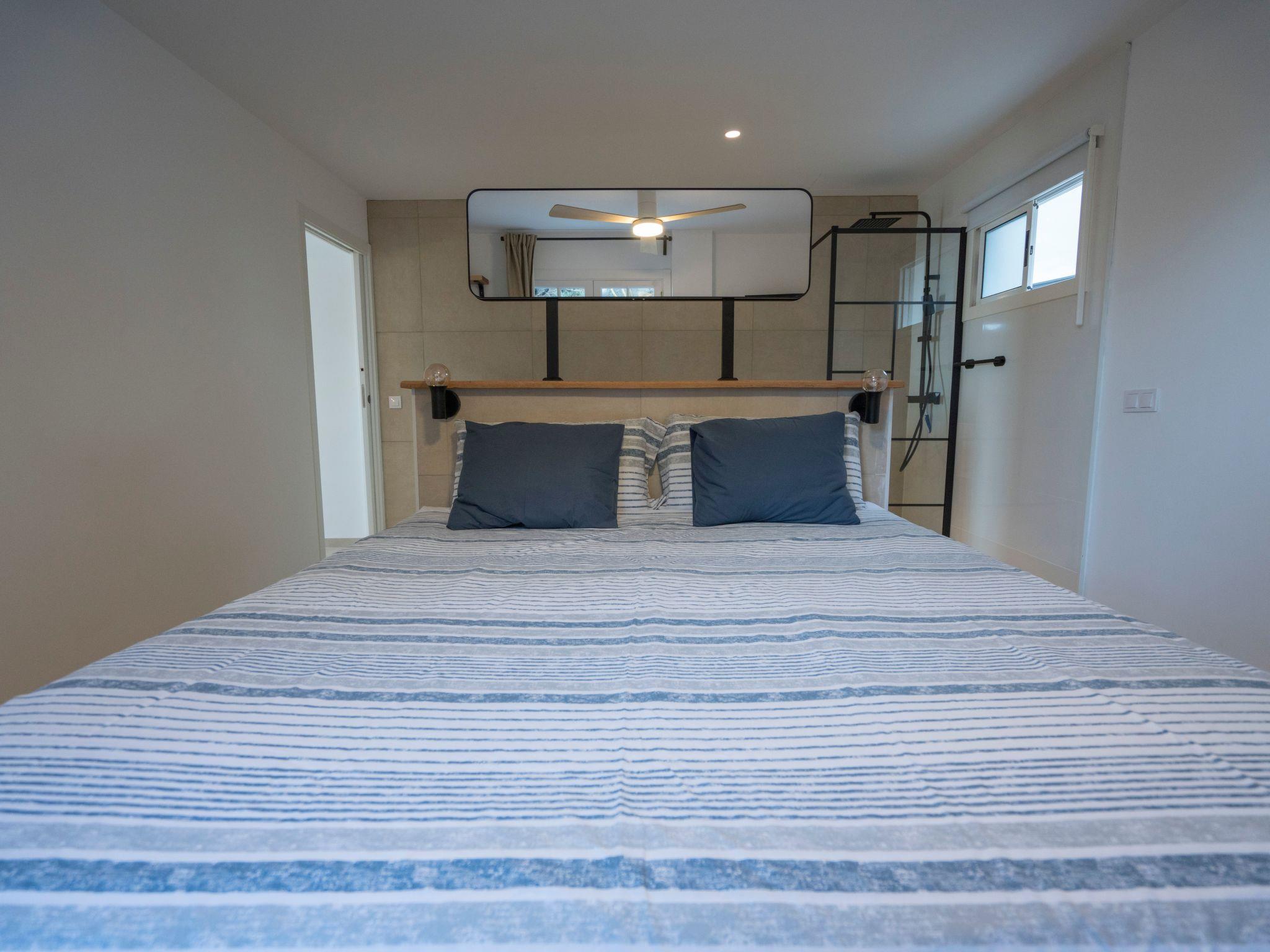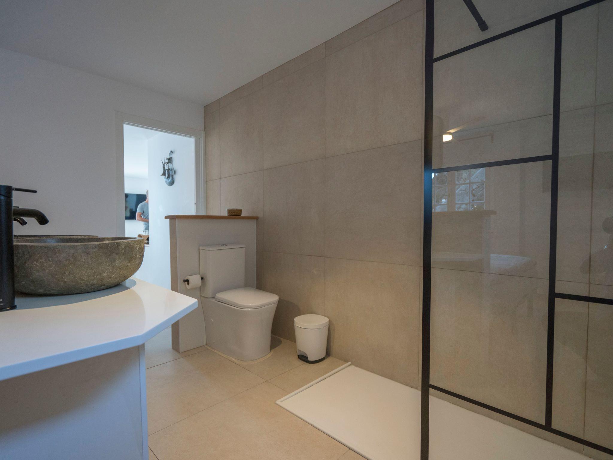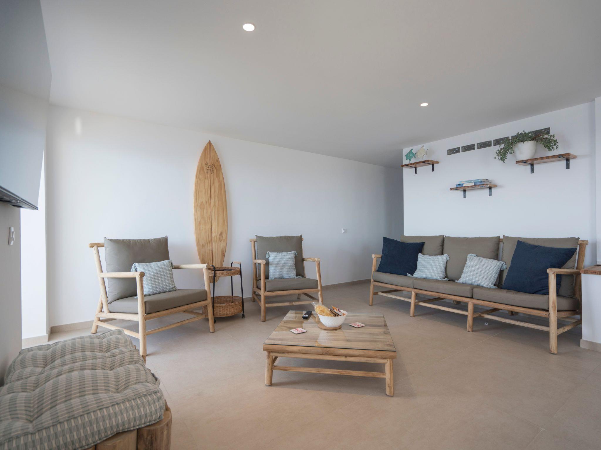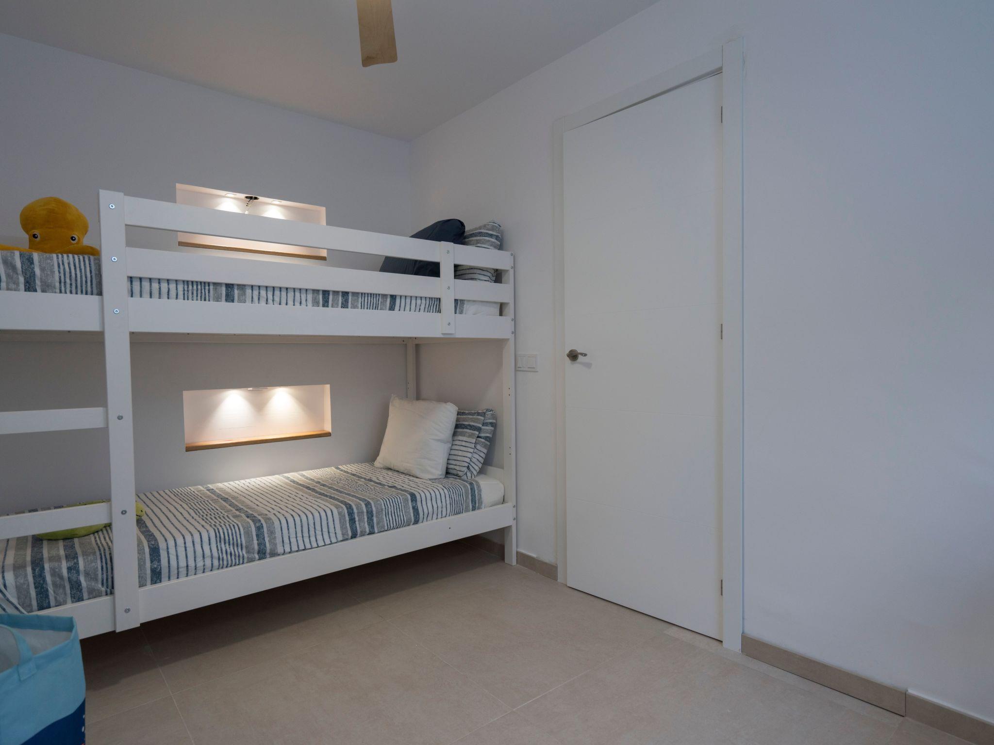 The small residential complex is located right between the small fisherman’s town of Bocacangrejo and the beautiful playa la nea with its black sand, it has its private parking. Already on the parking you get amazed by the great sea views that you have. From the parking you can either take the stairs or the lift to go up one floor. There you find your large 3-bedroom apartment. First there is a private patio on the back of the apartment and then you can enter. The first room is a room with a bunkbed (200cm*90cm) and a desk for remote working. There is a roof ventilator as well. Next to this room there is the first bathroom decorated with a natural stone sink and a rain shower.