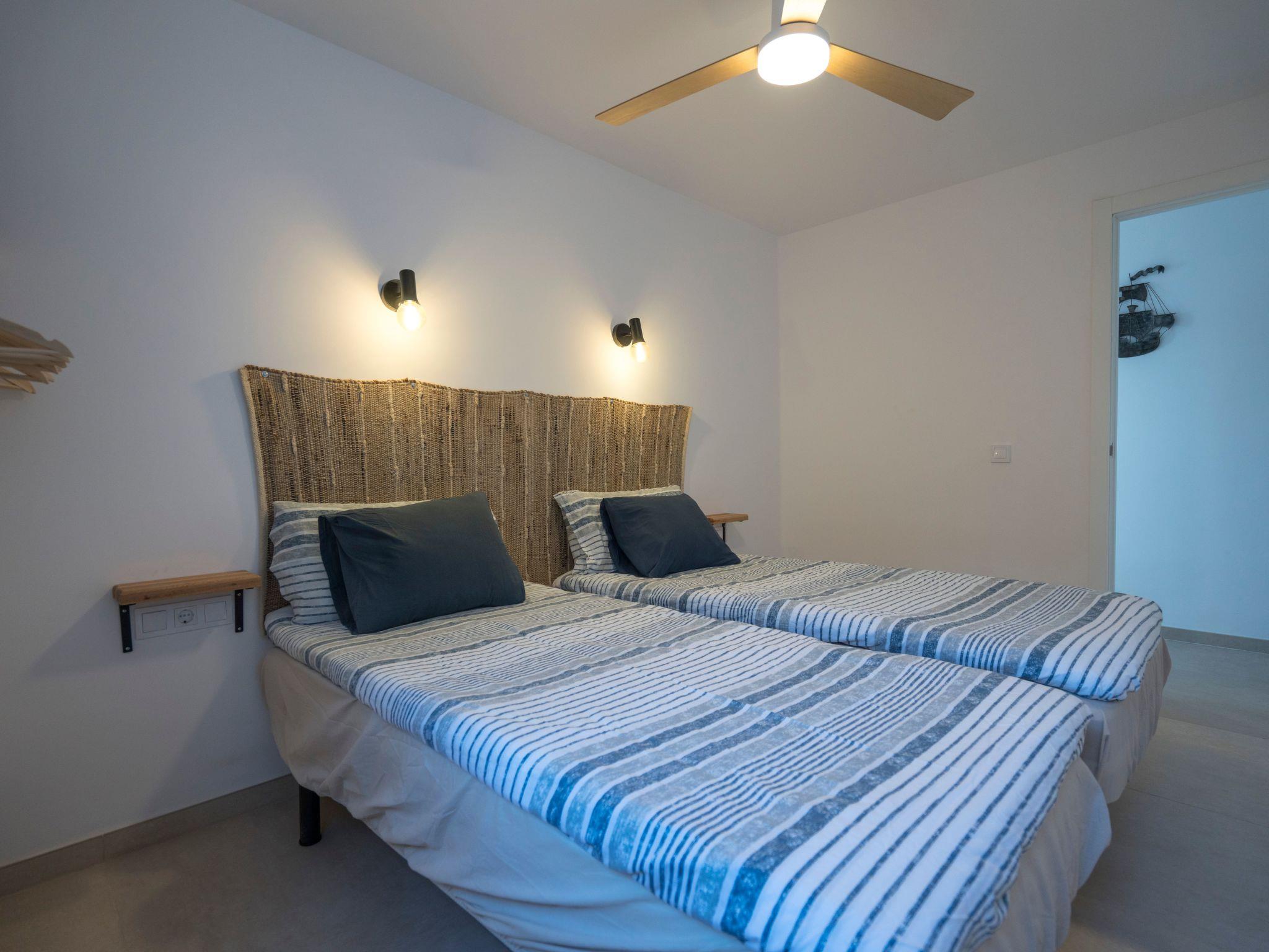 Next to the living room is the second bedroom that is nicely decorated and has two beds (190cm*90cm) that can be used separate or as a comfortable double bed. In this room you have the comfort of a roof ventilator as well. And then you get to the astonishing master bedroom that would not mis stand as a luxury hotel room. You have a king-size bed (200cm*180cm) in an open setting with a design bathroom that is separated by the sleeping part by two big mirrors. Off course you have a walk-in rain shower and again two unique natural stone sinks that refer to the volcanic rocks that you can see from your bedroom window. To top it of there is a roof ventilator and a TV so you can enjoy your precious holiday nights to the fullest!