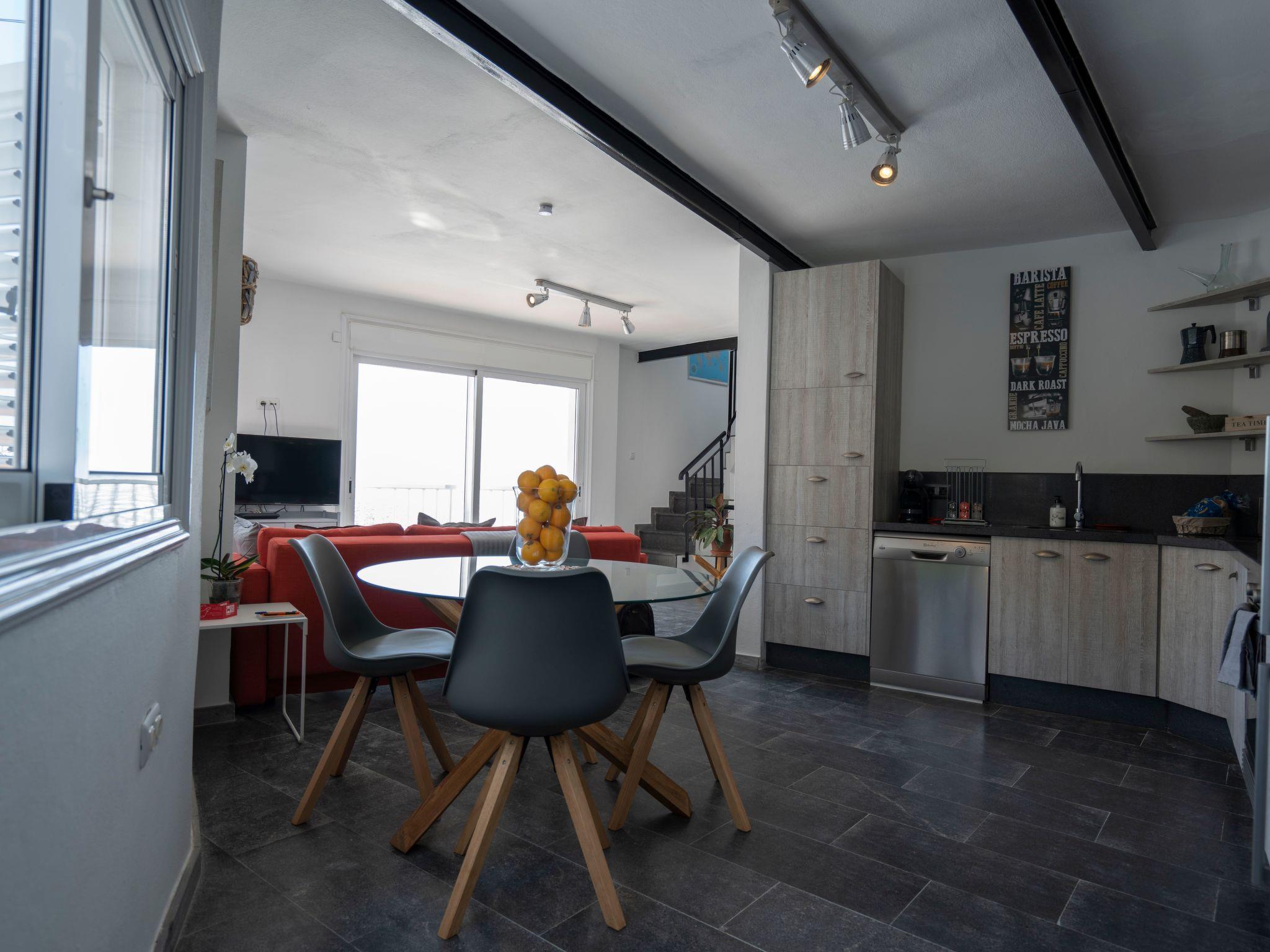 You enter the house in the beautiful kitchen/Livingroom. This room has two large sliding windows of almost 3 meters. From here you have the same magnificent view of the sea as on the roof terrace, this gives you the feeling of being outdoors while you are inside. The kitchen is very spacious and well equipped with all modern conveniences. You dispose of a dishwasher, oven, ceramic hob with 4 burners, microwave and a large fridge-freezer. You have access to a DolceGusto coffee machine and the kitchen is equipped with pepper, salt, oil, vinegar and spices. Also, there are pots, pans, crockery, cutlery and everything you need. The salon is furnished with a round dining table with 4 chairs, a sofa bed for 2 persons and a smart TV with an international satellite connection. The property has an internet connection via fibreoptic so that you have a fast connection. The living room also has a separate toilet where you can also find the washing machine (9 kg). The property is designed open-plan which means that there are no doors between the different rooms (with the exception of the bathrooms). Going down the stairs you get to the bedroom which has an en-suite bathroom with shower, toilet and double sink. Furthermore you will find a spacious double bed and a build in wardrobe. On the top floor is the very spacious terrace with an outdoor kitchen with sink, a large dining table with chairs and a sitting are next to the window.