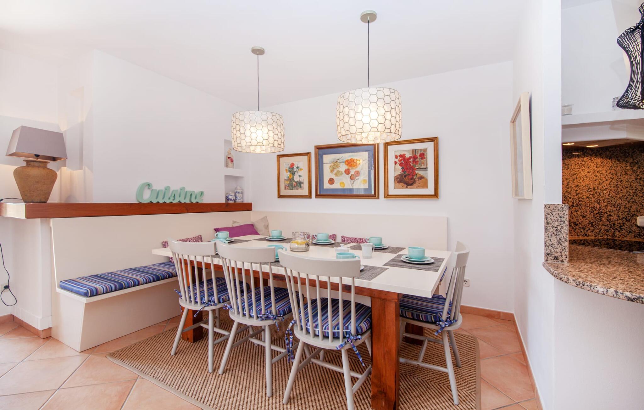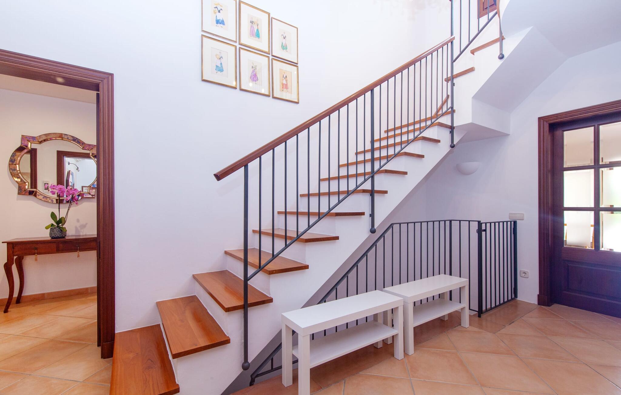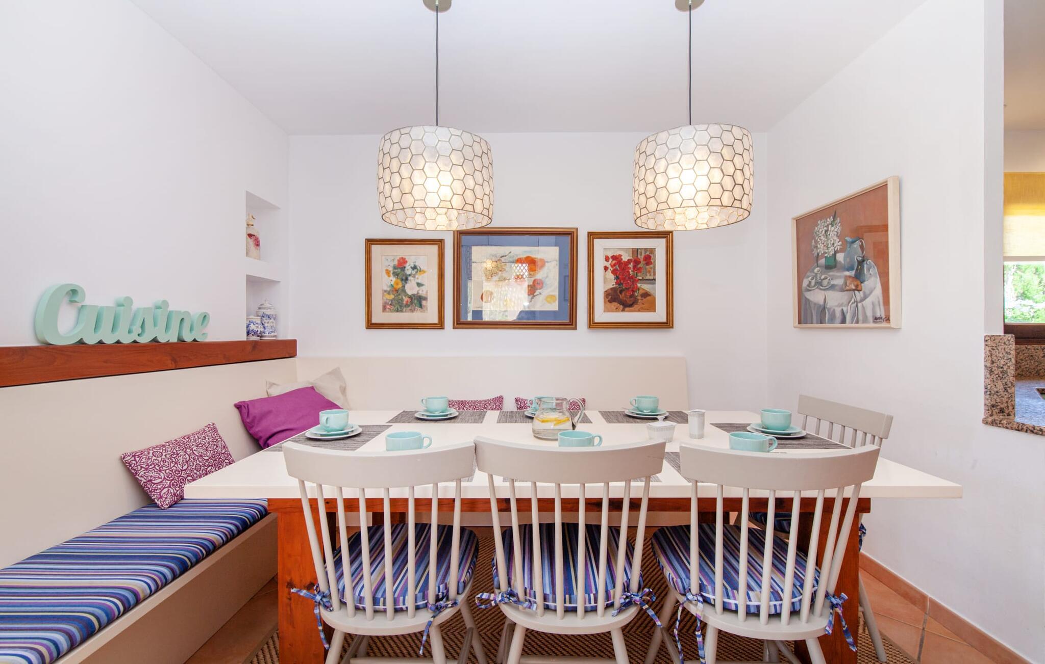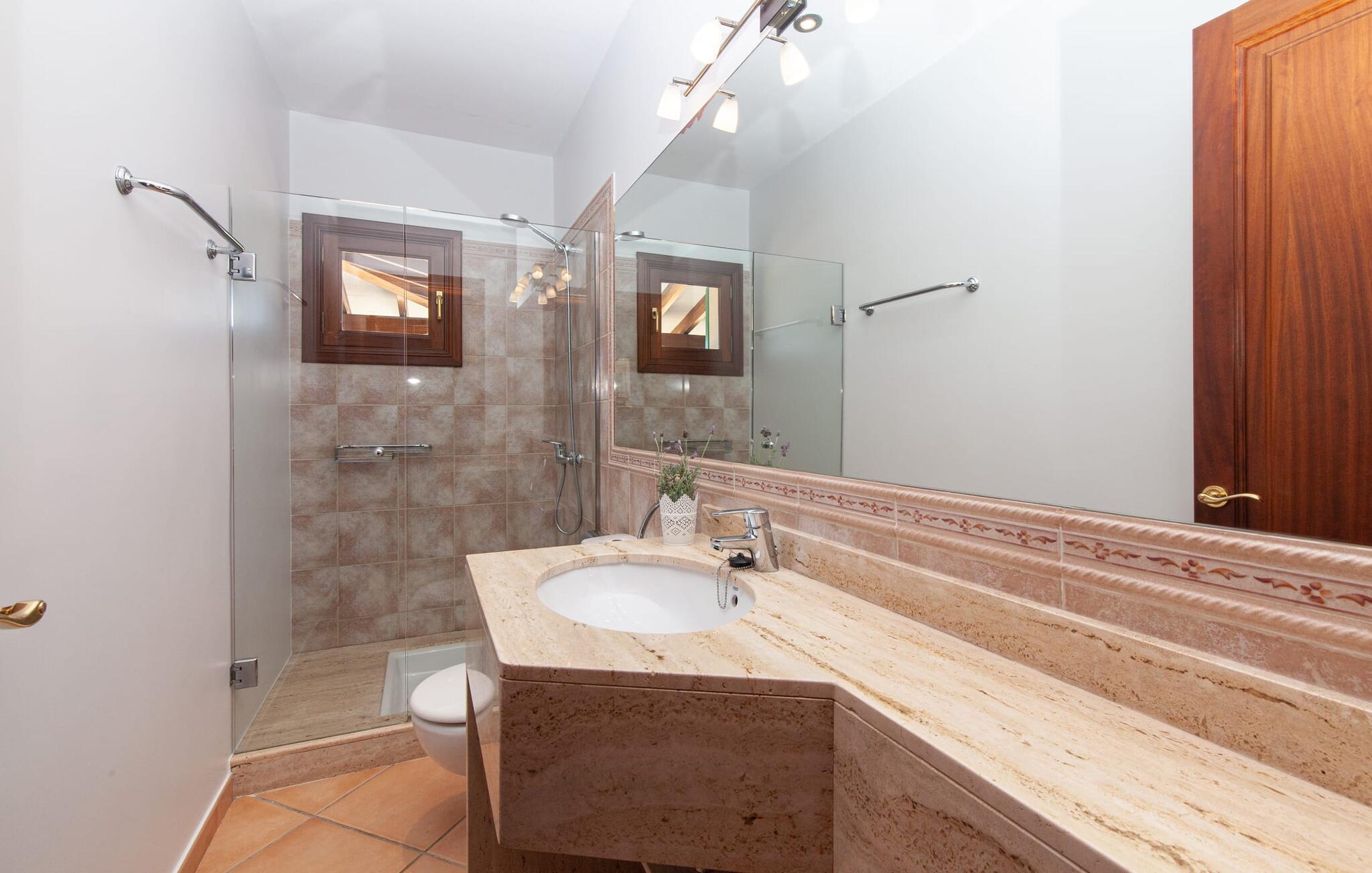 Inne i villaen mangler det ingenting. Fra den stilfulle stuen, som er utstyrt med flatskjerm-TV, en moderne peis og en sofa som innbyr til avslapping, kommer du inn i spisestuen, som går over i det åpne kjøkkenet. Fargene på tremøblene harmonerer med de lyse, rene linjene og gir deg en følelse av at du har funnet ditt perfekte midlertidige hjem. De store arbeidsflatene på kjøkkenet gir deg nok plass til å tilberede større retter uten å gå tom for plass. I tillegg til gjestetoalettet finner du også tre av soverommene og to bad (hvorav det ene er en-suite) i første etasje, som ligger på baksiden av huset. Arkitektene har latt rausheten råde på badene, også når det gjelder materialbruk. Tre- og marmorelementer smelter vakkert sammen og levner ingen tvil om at du her har valgt et førsteklasses hjem. En het kandidat til favorittplassen din finner du via trappen til toppetasjen: Her går soverom og bad direkte over i hverandre. Fra takterrassen kan du nyte den imponerende utsikten, det ideelle stedet for koselige sammenkomster og planlegging av utflukter til den vakre østlige delen av øya.