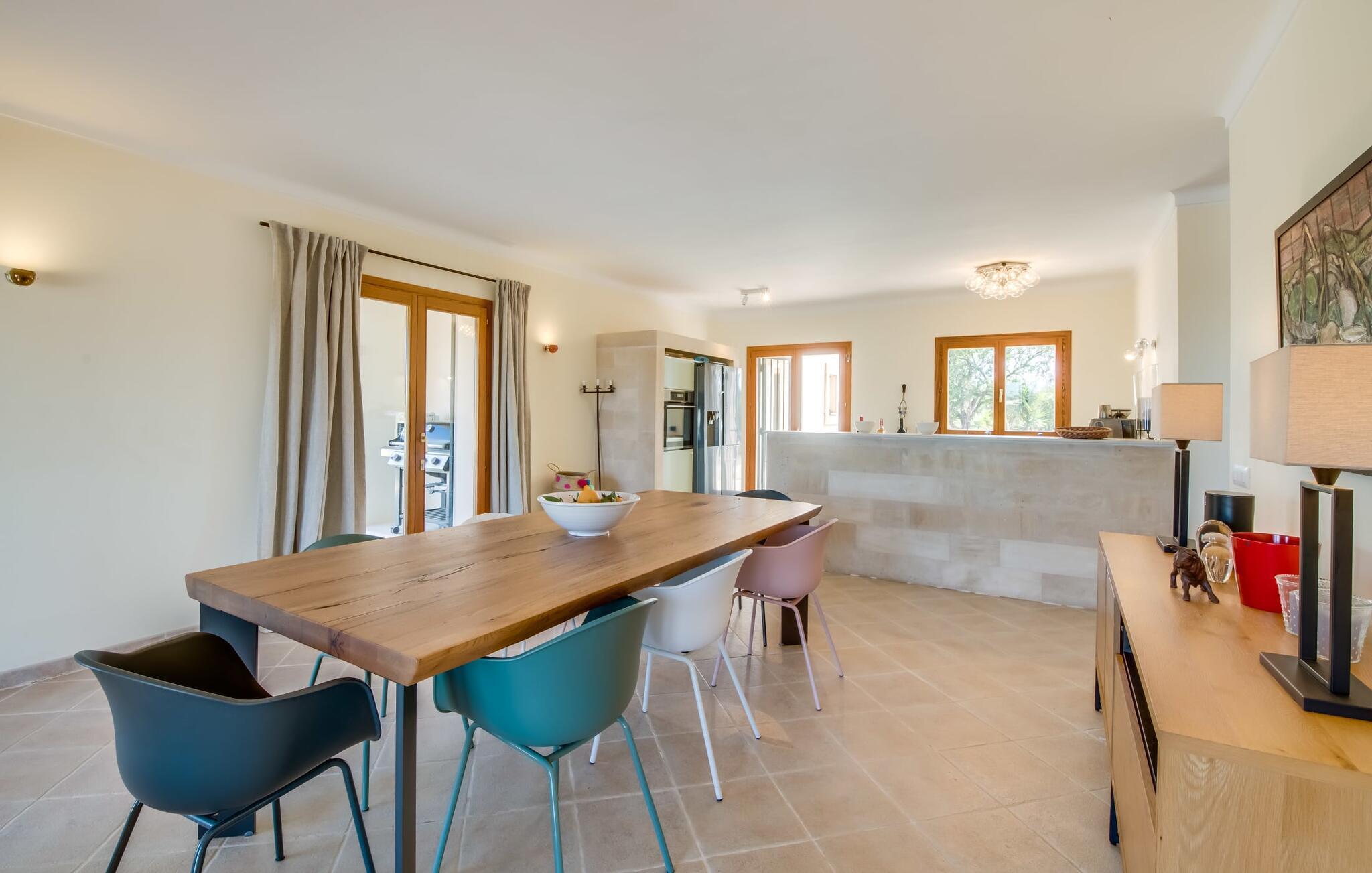 Velkommen til sør på Mallorca og til den smakfulle kvalitetsgården Roca del Rey nær kysten med vakre sandstrender med utmerket vannkvalitet og vakre byer som Santanyí og Felanitx, dvs. i en eksponert beliggenhet. Naturskjønnheter som Mondragó naturpark eller saltmarkene er uovertruffen. Dette feriehuset med en allé av palmer kan bookes hele året og er ideelt for 1-2 familier. På uteområdet kan dette allerede sees fra det inngjerdede bassenget med sin imponerende størrelse. Hele terrasseområdet er anlagt med natursteinsflater, inngjerdet av grønne hekker og beskyttet mot nysgjerrige blikk. Perfekt for å slappe av etter bassengtiden under den seiloverbygde sittegruppen eller på området to trappetrinn nedenfor med mursteinsbenker - ren luksus! Du kan velge andre favorittplasser på de åpne eller overbygde terrassene foran og bak huset, som også gir mulighet for utendørssport med det medfølgende treningsutstyret. Hvis du ikke ønsker å være aktiv, kan du slappe av i hengekøyen eller ta deg god tid til å tilberede måltider ved hjelp av den moderne grillen i hagen.