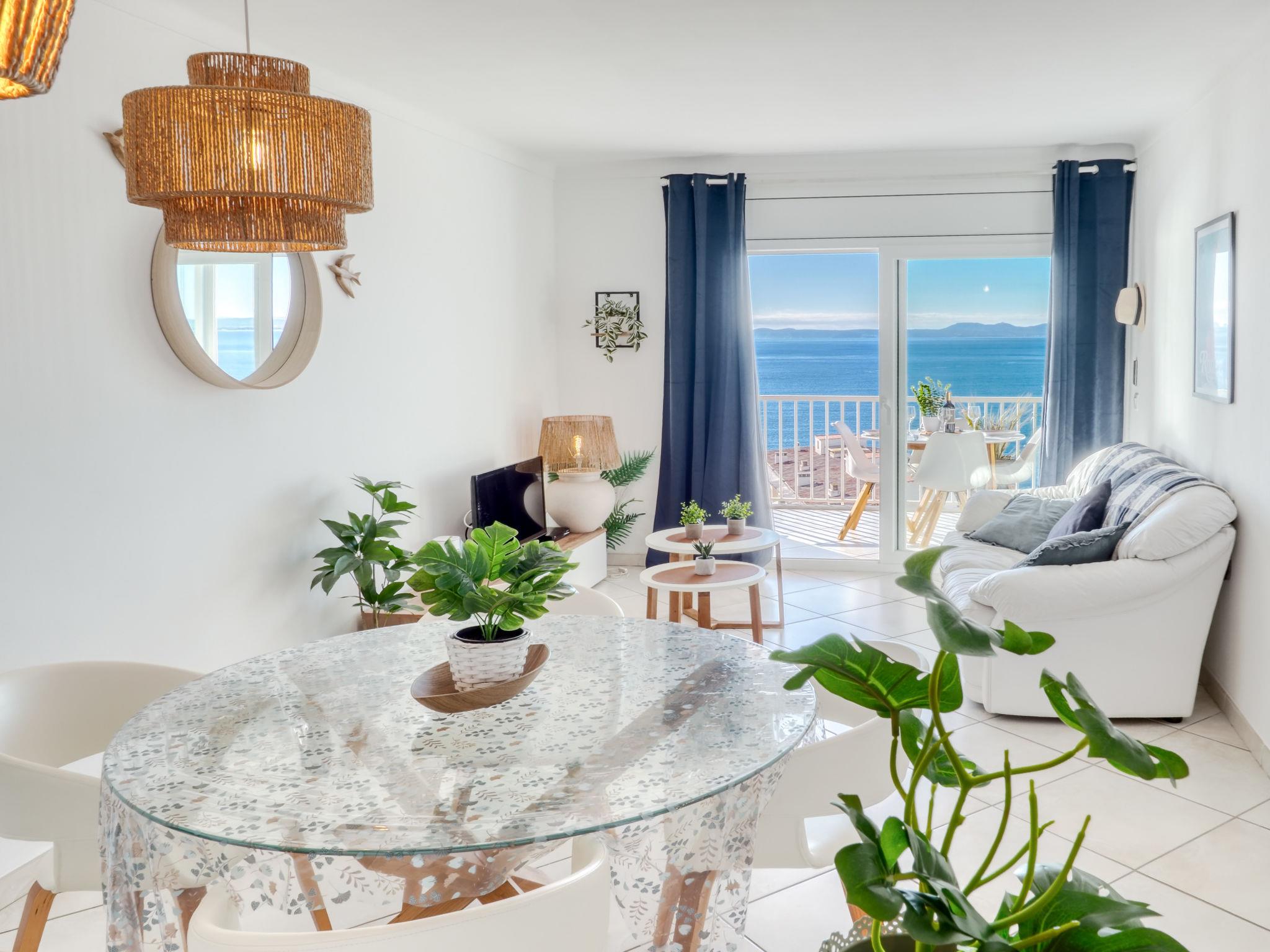 3-room apartment 65 m2. Bright, comfortable and modern furnishings: living/dining room with dining table and satellite TV. Exit to the terrace, south facing position and west facing position. 1 room with 1 french bed (160 cm, length 190 cm). Exit to the terrace. 1 room with 2 beds (90 cm, length 190 cm). Kitchen (oven, 3 ceramic glass hob hotplates, toaster, kettle, microwave, freezer, electric coffee machine) with hatch. Shower, sep. WC. Terrace. Terrace furniture. Marvellous panoramic view of the sea. Facilities: washing machine, iron. Internet (WiFi, free). Please note: non-smokers only. TV only FR, DE. No lift. HUTG-074788 // Reg. Nr.: ESFCTU0000170190001558250000000000000000HUTG074788851