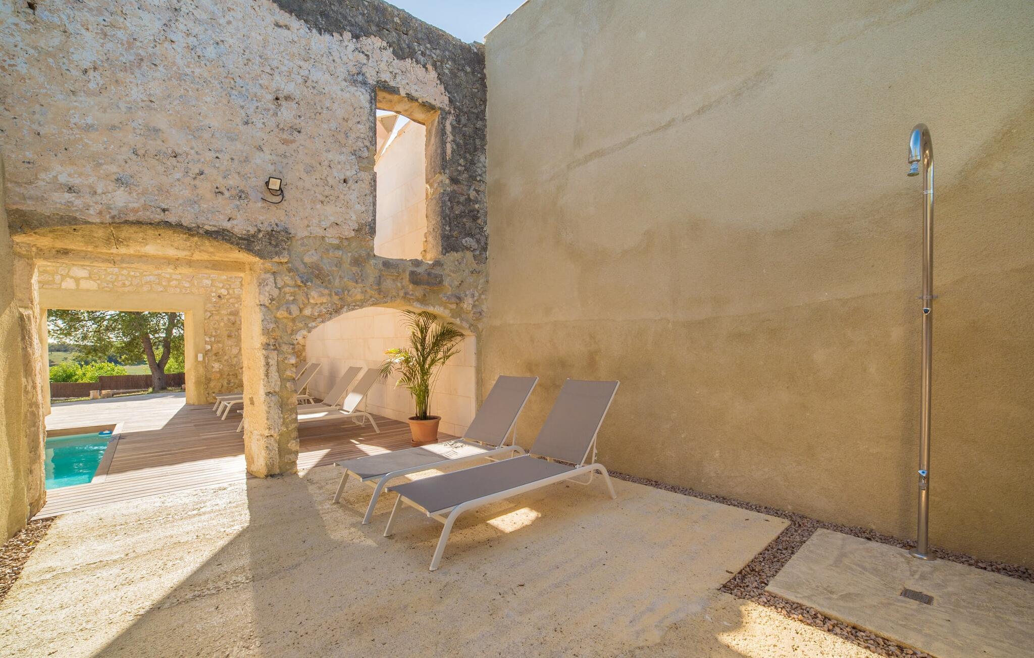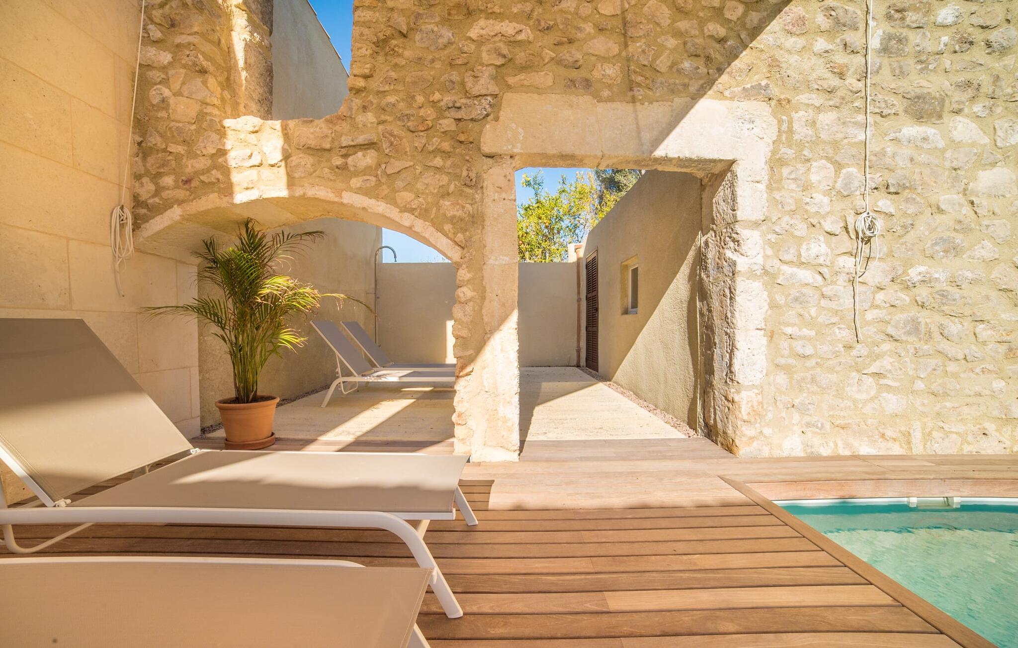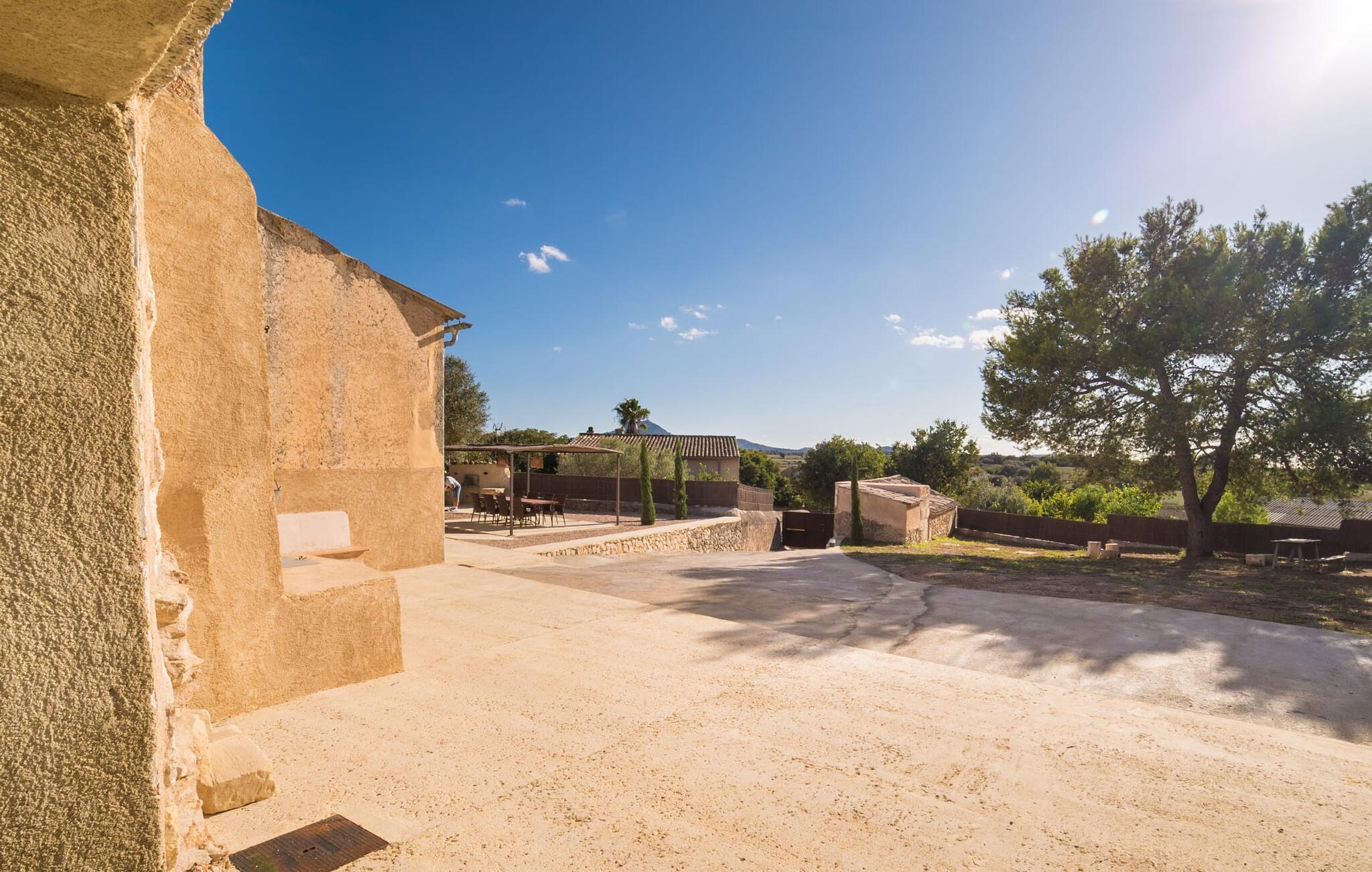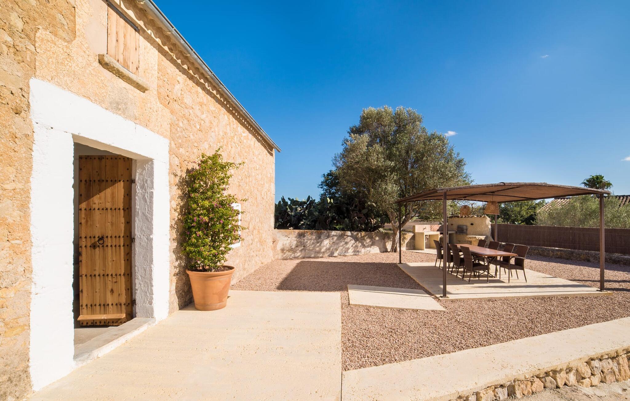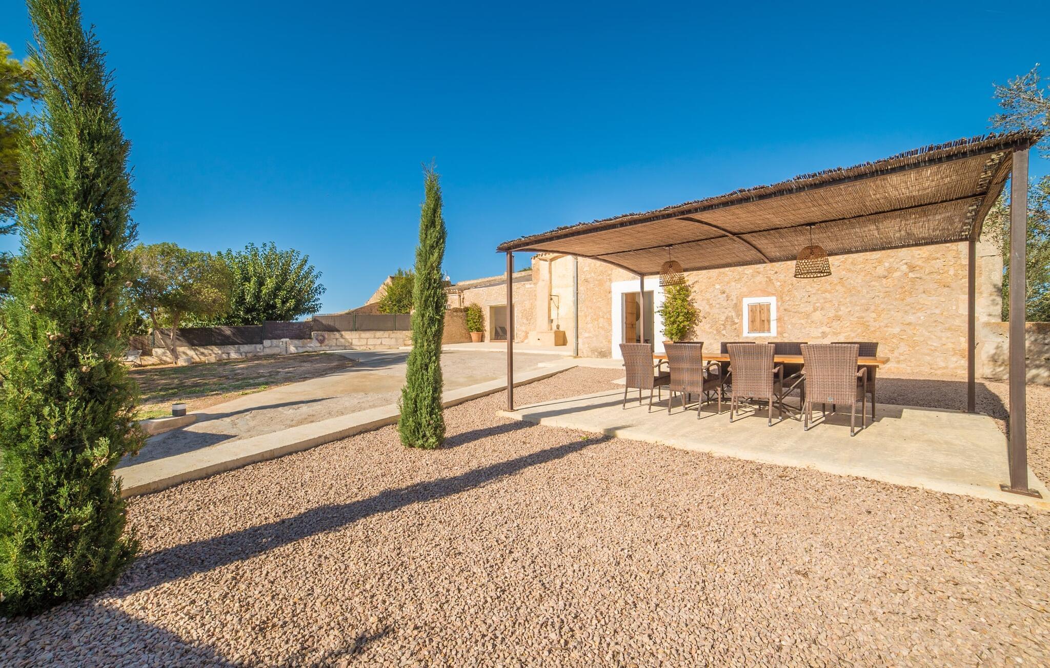Den vakre feriefincaen Son Granada ligger i det idylliske landskapet på den østlige delen av Mallorca. Her møter tradisjonell mallorcinsk arkitektur et elegant iscenesatt uteområde. Slapp av i det nøye utformede bassengområdet, som er skjermet for vinden og omgitt av høye sandsteinsmurer. Tregulv, stilfulle markiser, overdådige solsenger og en innbydende utedusj skaper en atmosfære som inviterer til total avslapning. Hagen er anlagt som en romslig terrasse: Naturstein og grus harmonerer med bygningens lyse naturstein. I midten av terrassen, som er smakfullt overbygd, er det en herlig spiseplass med tilstøtende utekjøkken og kullgrill - det perfekte stedet å nyte de varme sommerkveldene ved Middelhavet med venner og familie.