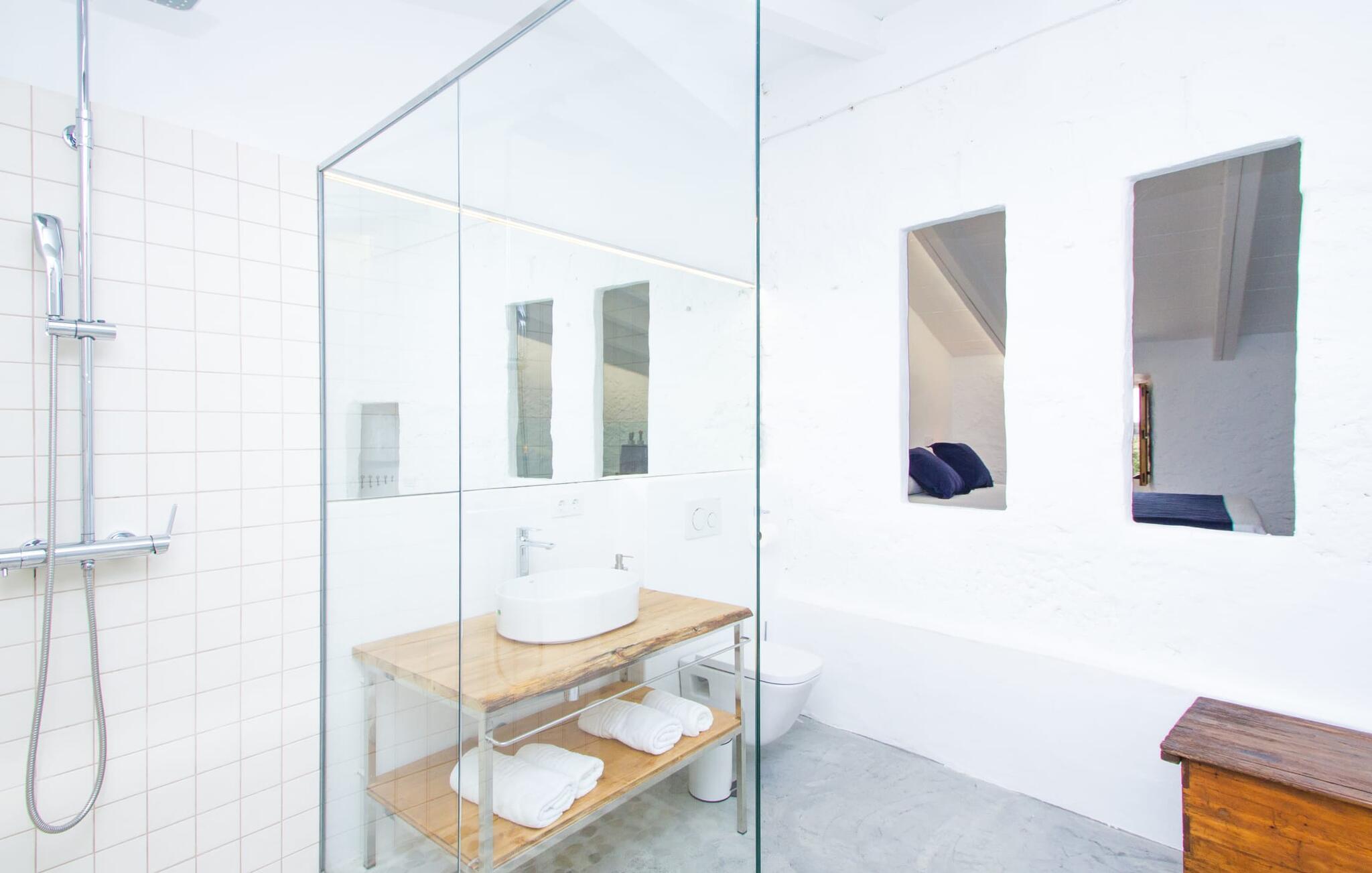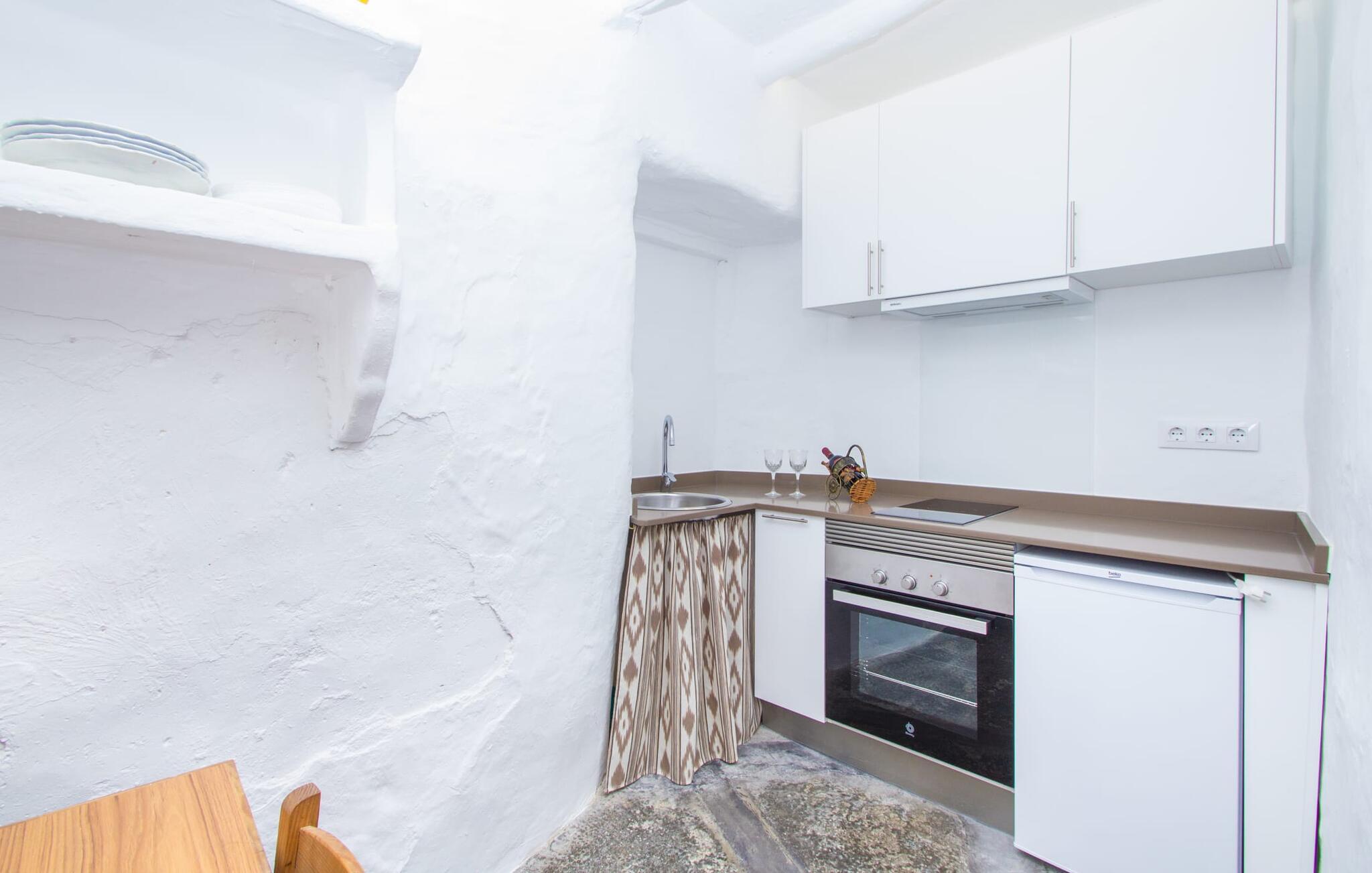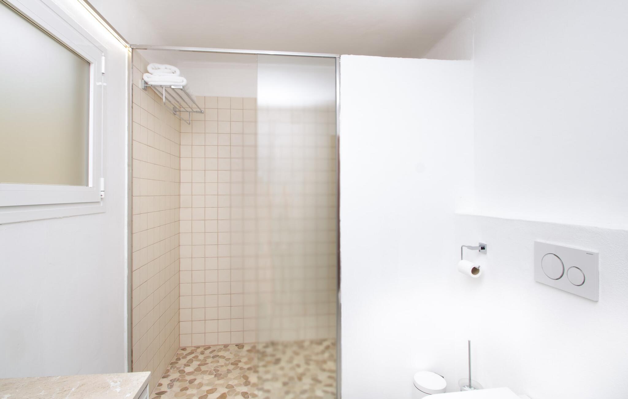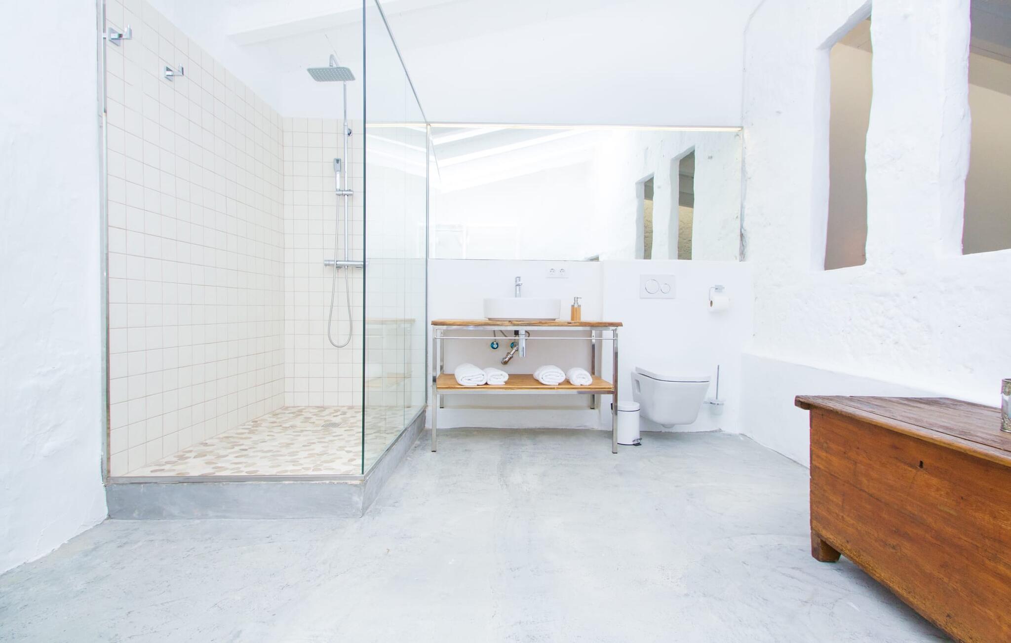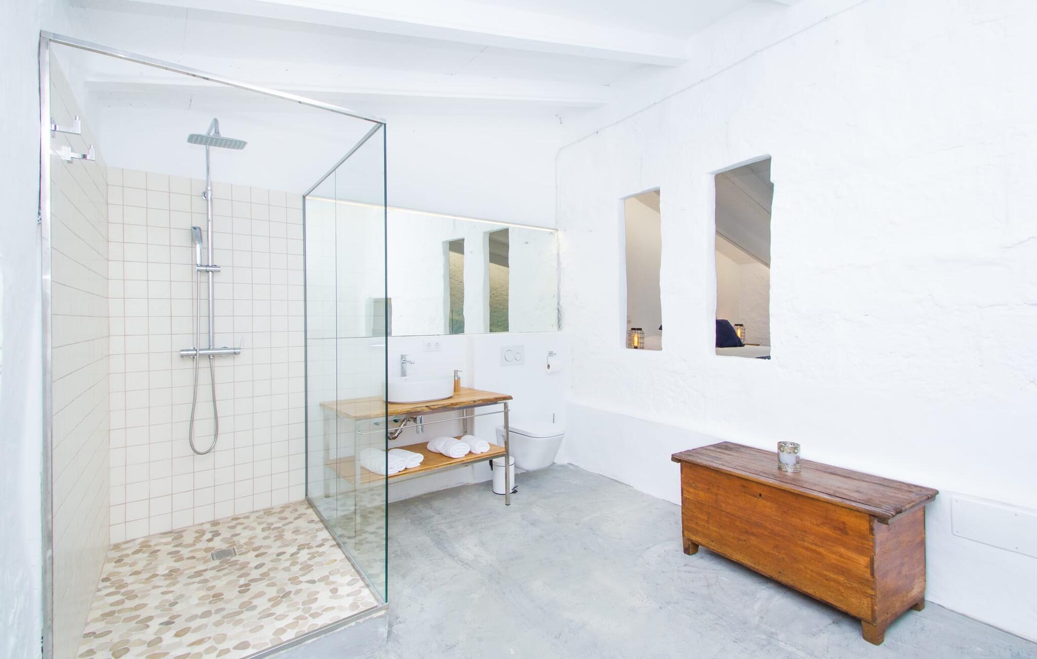 Det 215 m² store interiøret i gårdshuset, som ble bygget i 1850, er preget av en vellykket kombinasjon av originale elementer og moderne komfort. Rommene er behagelig kjølige selv ved høye temperaturer, og man har tilgang til dem via to separate innganger. I første etasje er det, i tillegg til oppholdsrommet med flere sittegrupper, en spiseplass med bord og to kjøkken, hvorav det ene har enda et spisebord. Fire av de fem soverommene ligger på bakkeplan, og på et galleri i øverste etasje er det ytterligere et soverom for to gjester med eget bad. På høyre side av huset er det to soverom for to personer hver, mens det på venstre side er et dobbeltrom og et enkeltrom. I begge områdene er det integrert moderne bad med store dusjkabinetter. Ett av rommene har en liten privat terrasse. Feriehuset er utstyrt med WLAN og stabilt mobildekning.