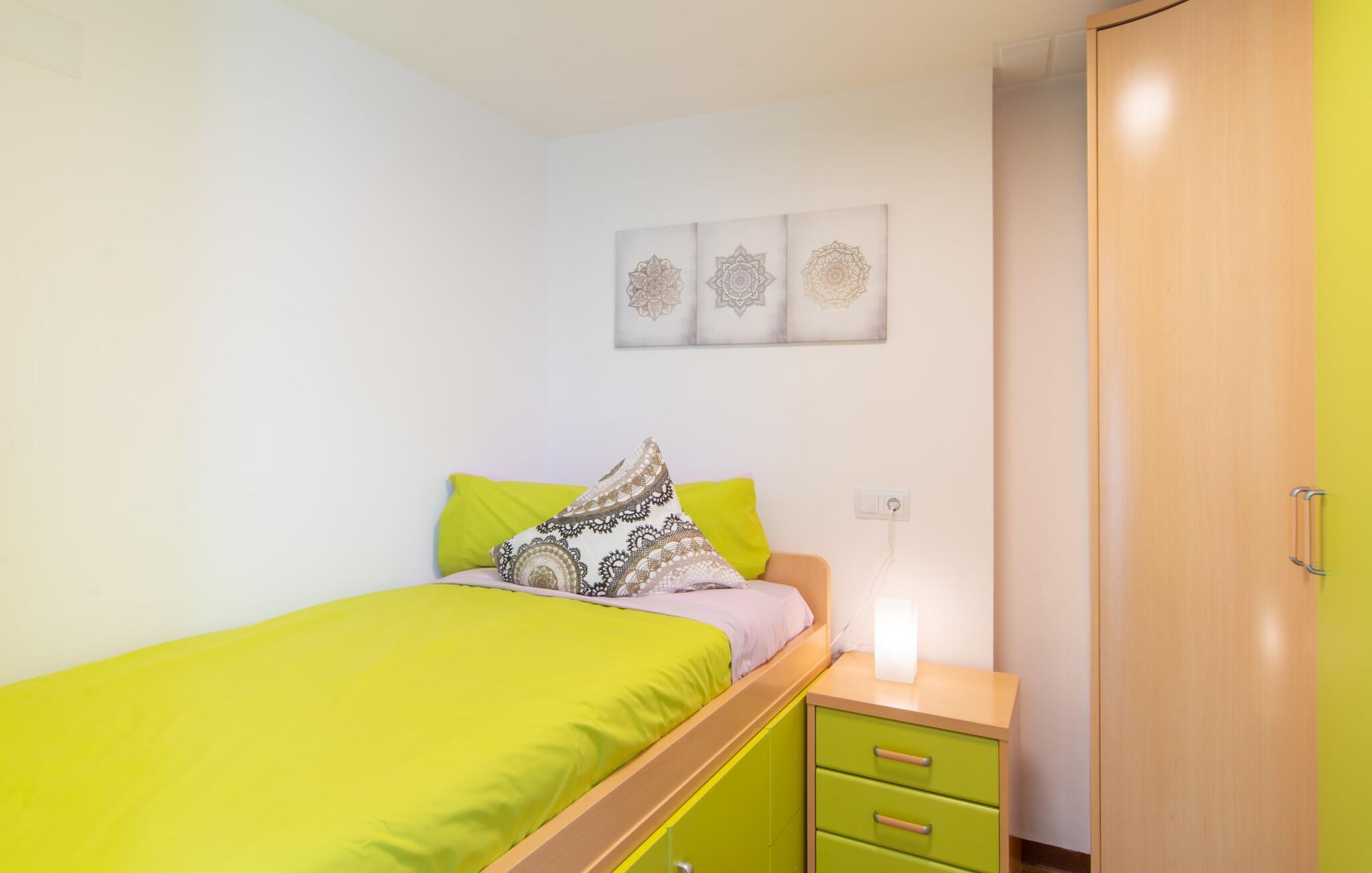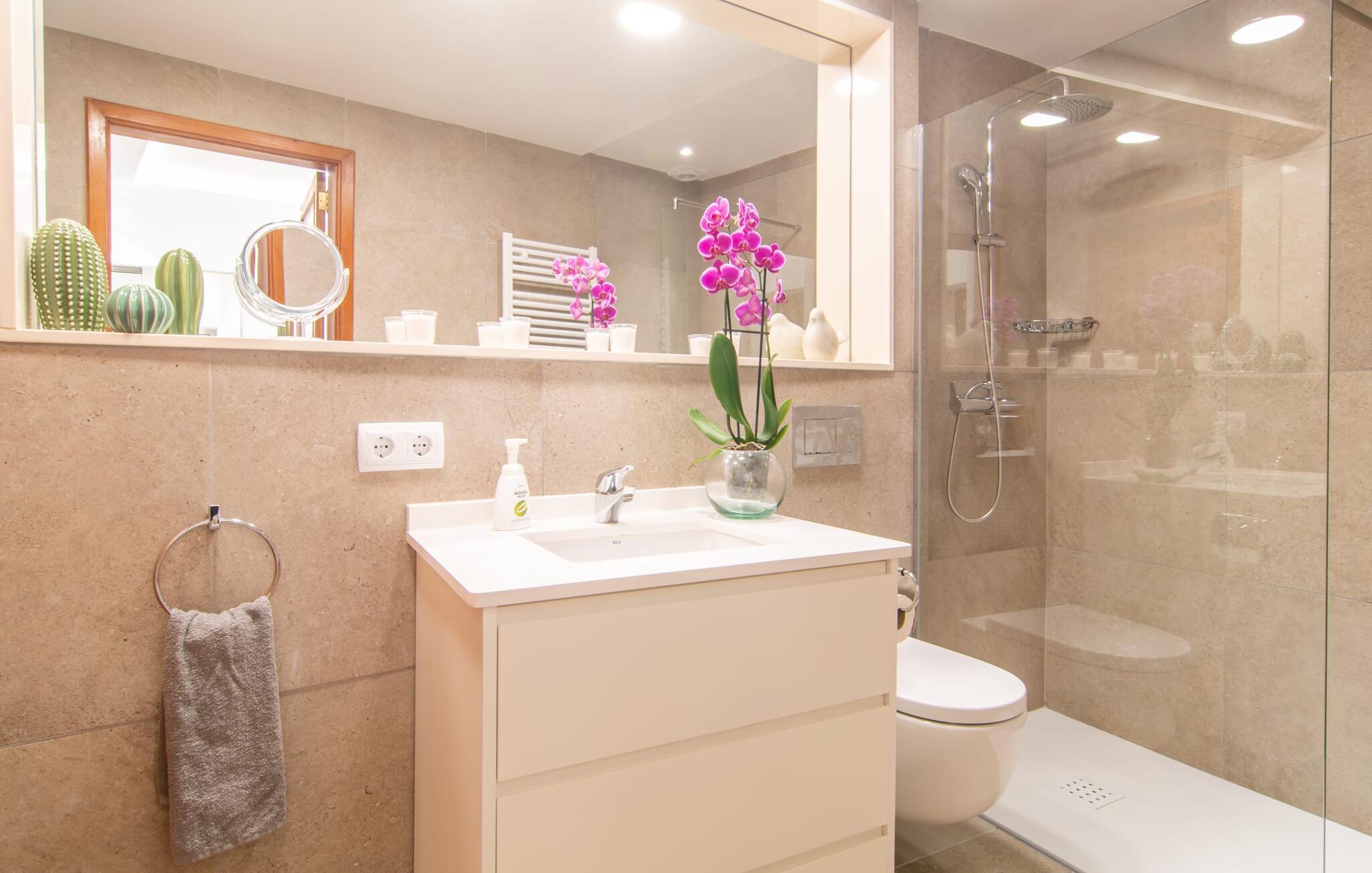 Interiøret i det lille huset imponerer med en oversiktlig, lys og luftig rominndeling: Det velutstyrte kjøkkenet og den tilstøtende spisestuen med en rustikk, dekorativ innendørs fontene er midtpunktet for dine kulinariske oppdagelsesreiser. Det moderne glassbordet gir nok plass til alle gjestene. Og hvis du har gjester i villaen, er det rikelig med ekstra stoler tilgjengelig. De lyse fargene og det smarte belysningskonseptet skaper en ryddig atmosfære, noe som også merkes i stuen med den komfortable sofaen og flatskjerm-TV-en. Selv om peisen for øyeblikket ikke kan brukes, bidrar den likevel til å gjøre boligen ekstra koselig. I tillegg til et bad som er tilgjengelig for alle, har ett av de tre soverommene den ekstra luksusen at det har eget bad. To av rommene er innredet med to enkeltsenger hver, mens det tredje, litt mindre rommet tilbyr én reisende en god natts søvn. I et annet rom rett ved inngangen til huset finner du en garderobe og to lenestoler, slik at huset tilbyr nok plass til å trekke seg tilbake til selv når det er fullt belagt.