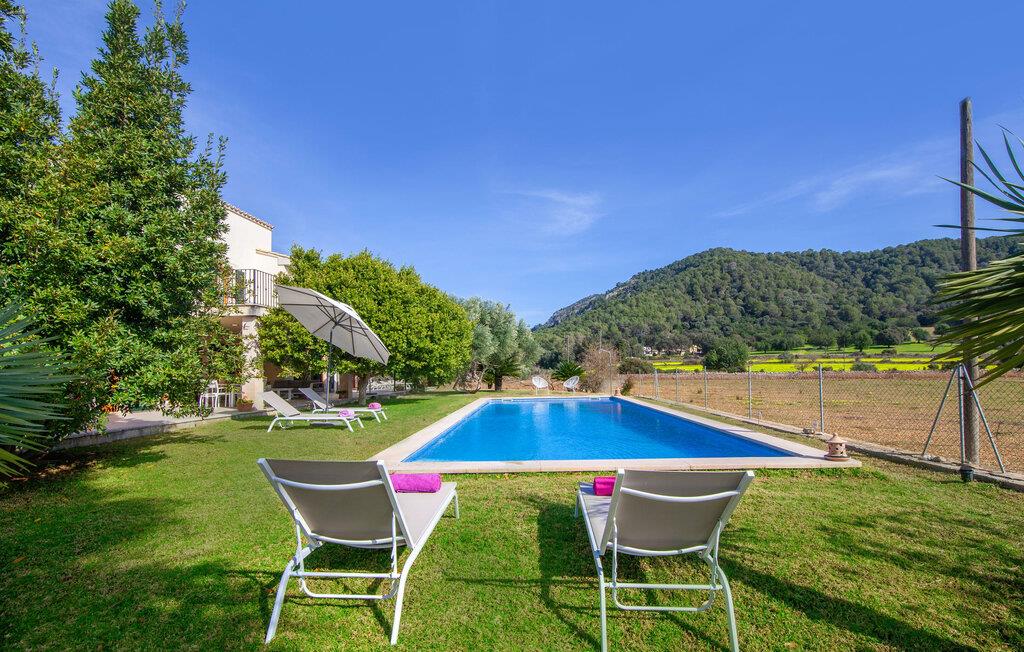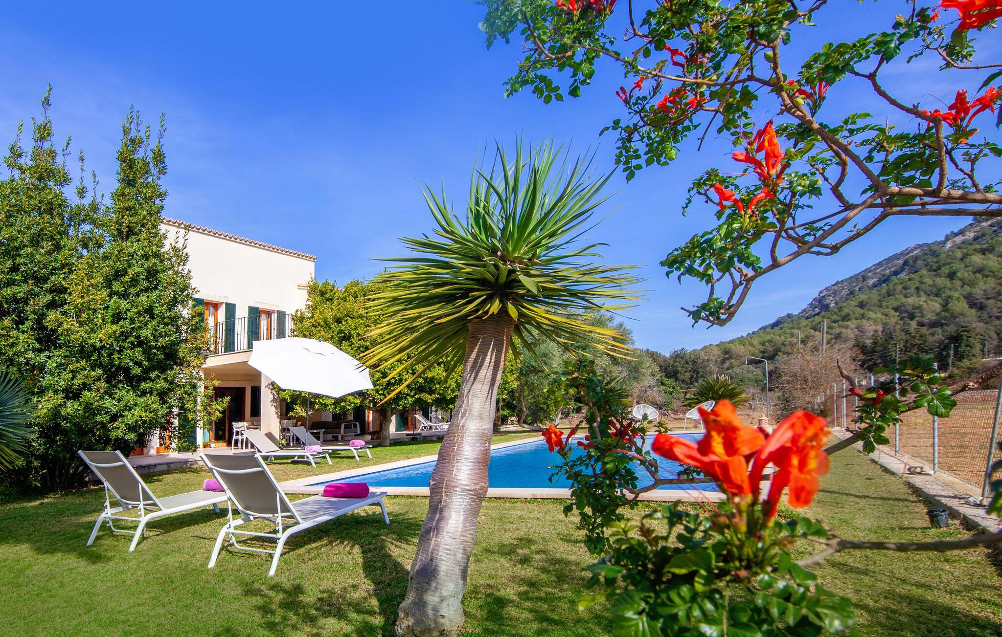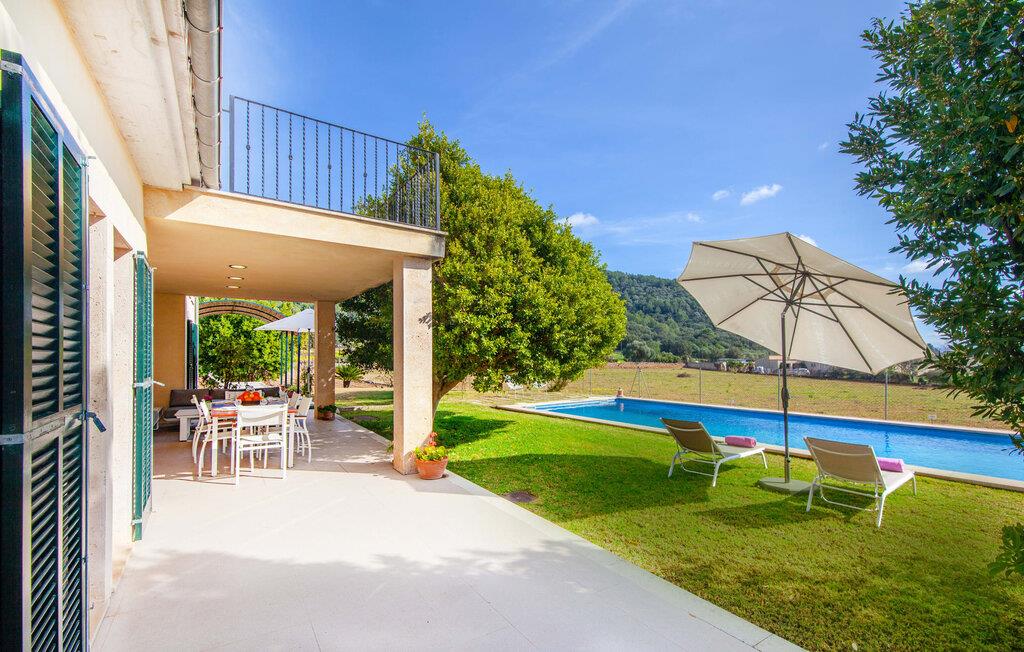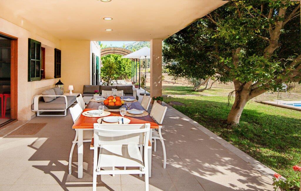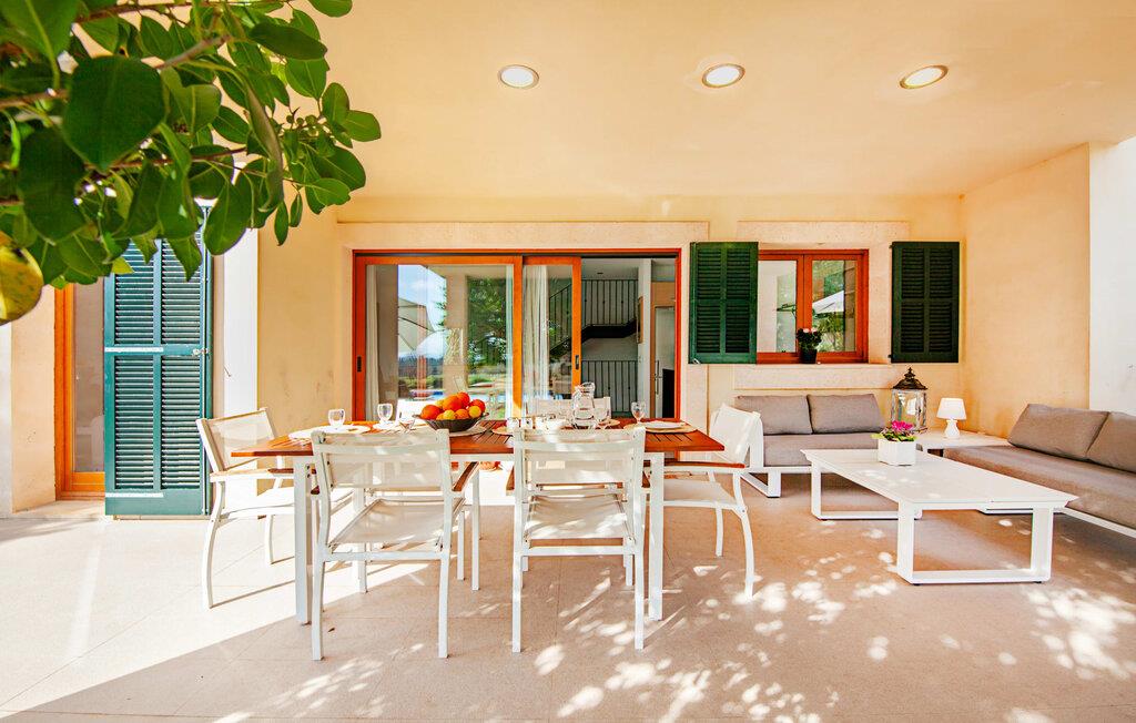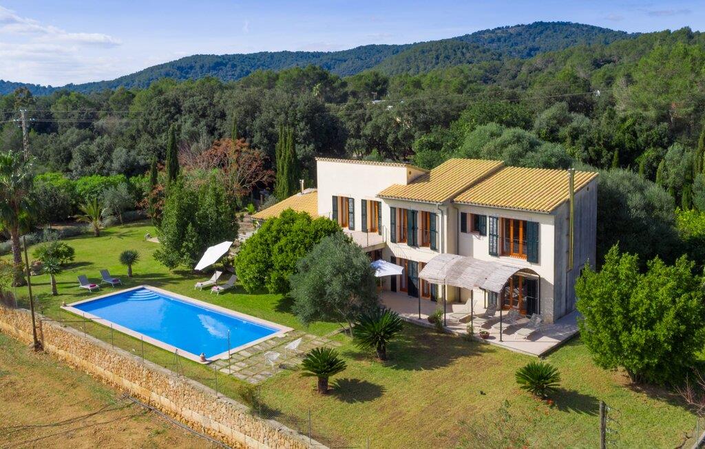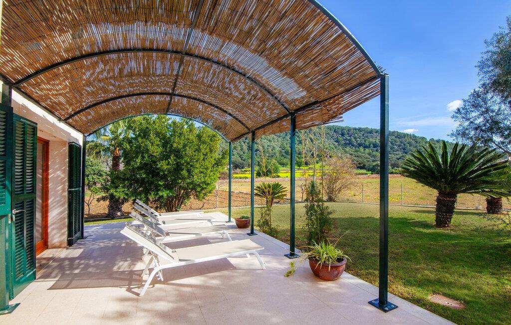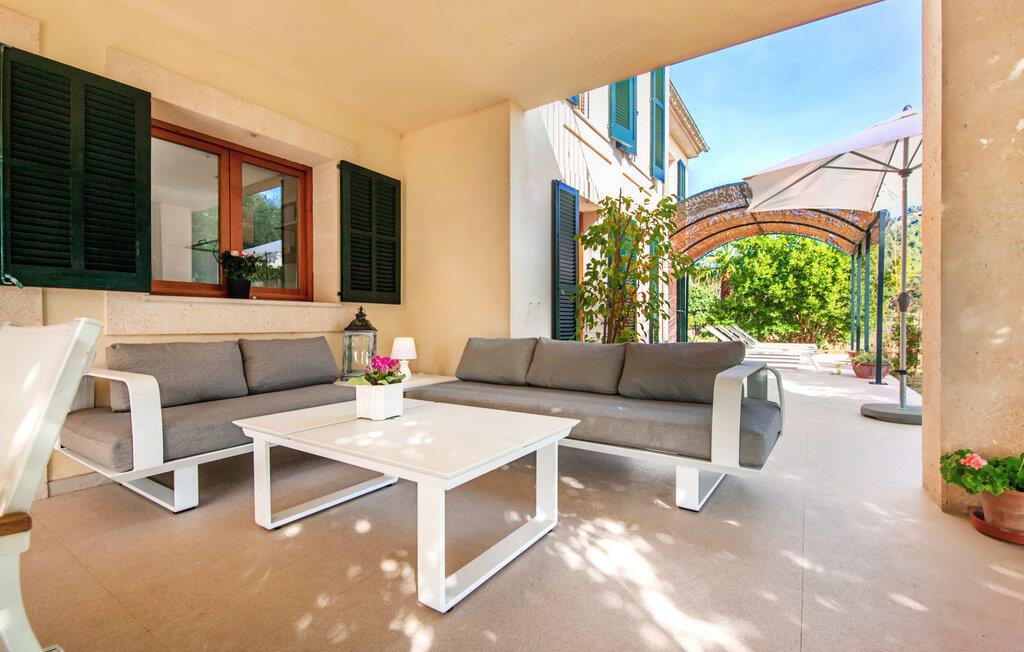 Dette vakre feriehuset på Mallorca er omgitt av frodige trær, og utsikten over det omkringliggende landskapet fra forsiden kan knapt bli mer fortryllende. Ved siden av det høye palmetreet får du straks lyst til å slå leir og nyte en bok og favorittdrinken din på en av de komfortable solsengene. Kjør videre! På plenen er det god plass til mange timers avslapping, og barna som har kommet med, vil garantert nyte plassen til å løpe rundt! På varme dager er det selvsagt ingen grunn til å stoppe for en forfriskning, og det lange bassenget innbyr til å ta noen lengder eller plaske rundt. Bassenget er veldig lett å nå via en hjørnetrapp og skråner deretter svakt nedover. Svømming med fjellutsikt! De stilfullt møblerte, åpne eller overbygde terrasseområdene inviterer deg til å slappe av rett ved siden av huset. Her er avstandene til kjøkken & co. korte, uten at det går på bekostning av utsikten over det grønne.