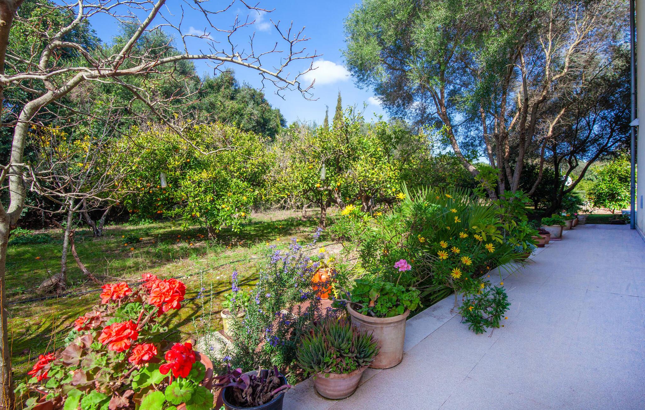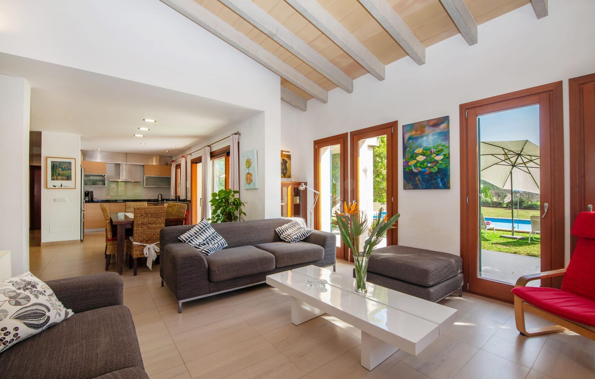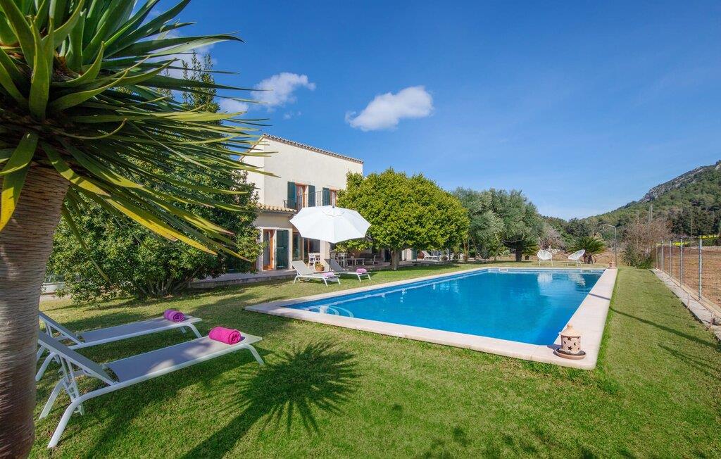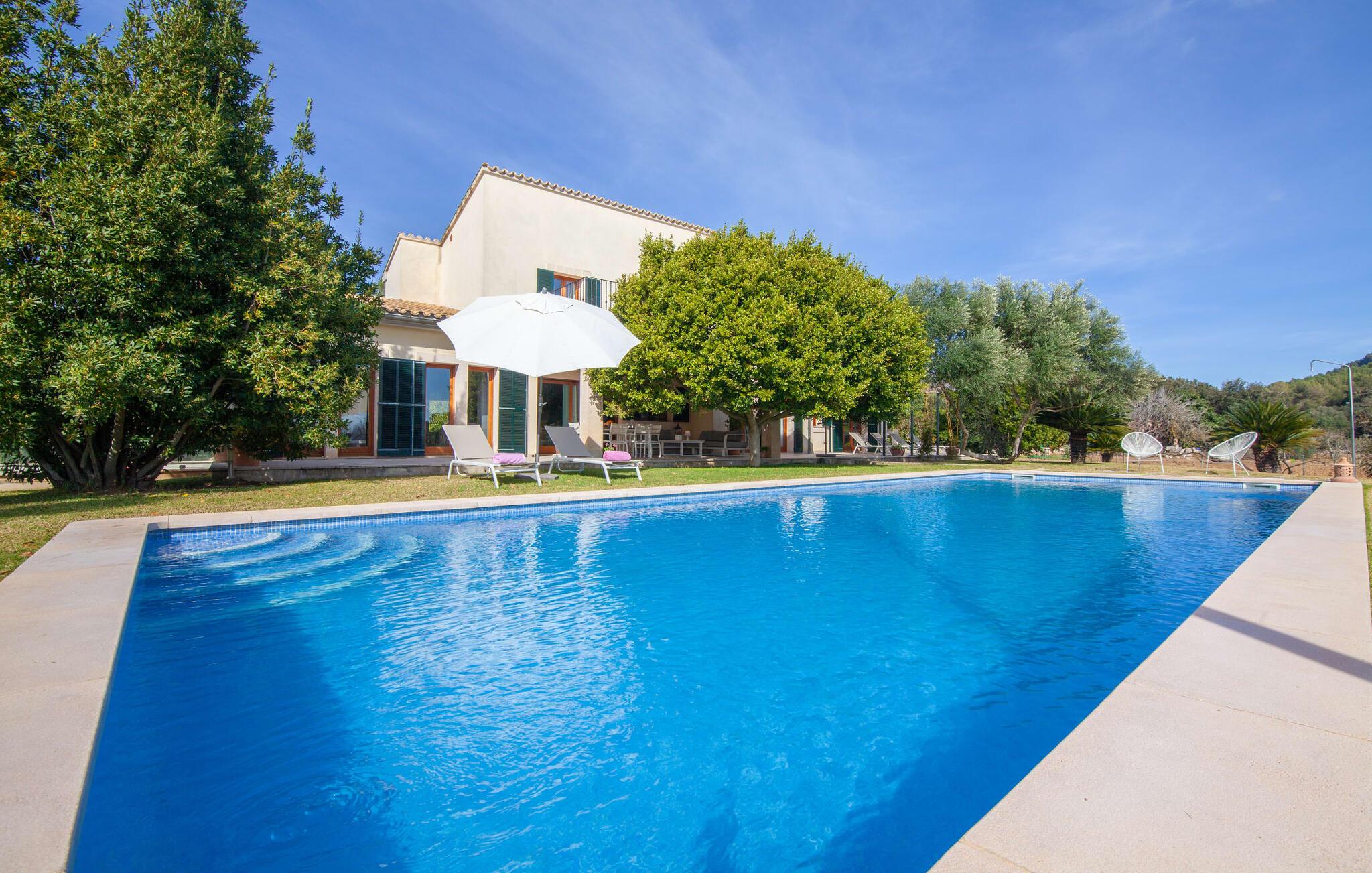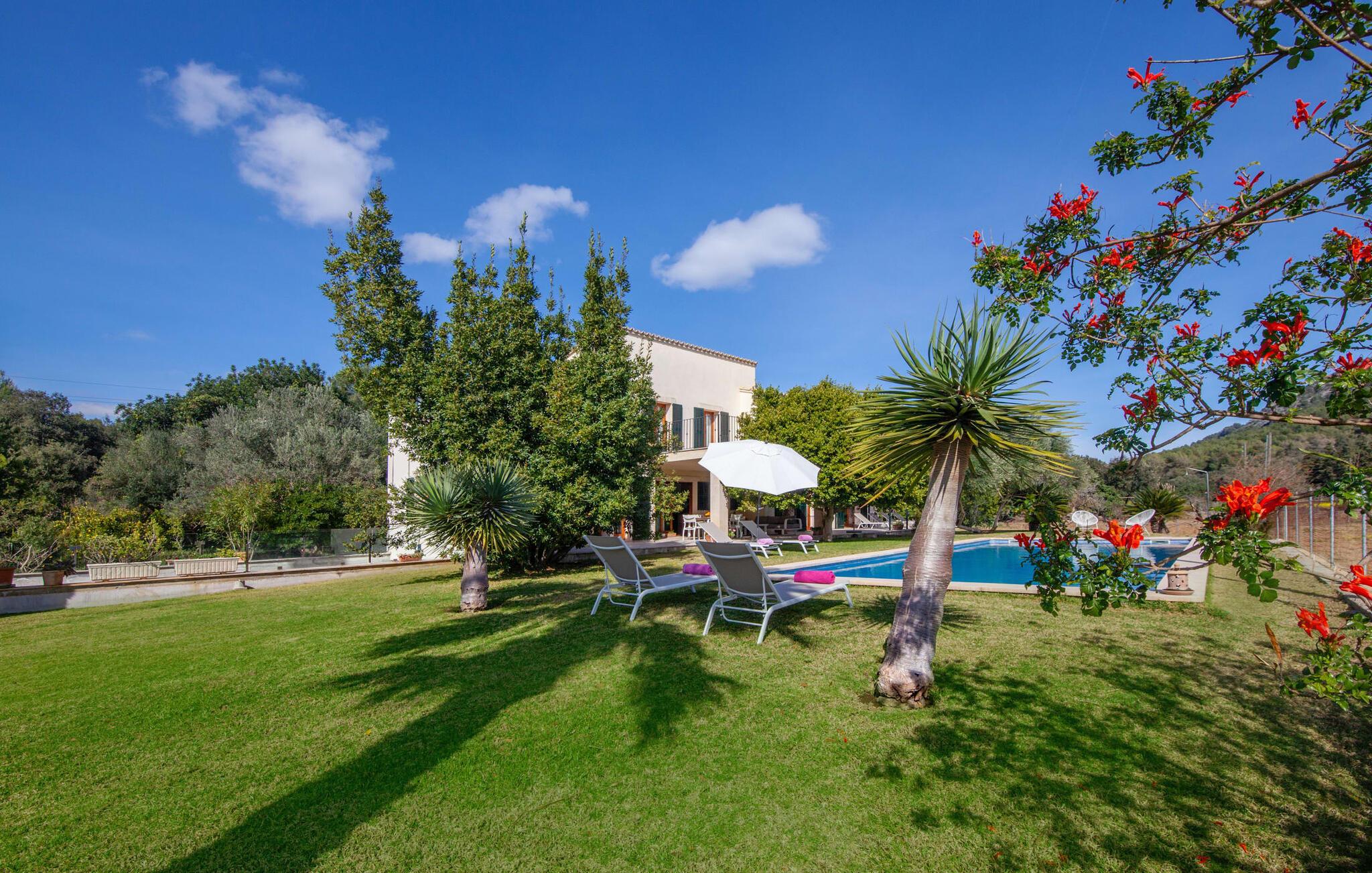 Dette vakre feriehuset på Mallorca er omgitt av frodige trær, og utsikten over det omkringliggende landskapet fra forsiden kan knapt bli mer fortryllende. Ved siden av det høye palmetreet får du straks lyst til å slå leir og nyte en bok og favorittdrinken din på en av de komfortable solsengene. Kjør videre! På plenen er det god plass til mange timers avslapping, og barna som har kommet med, vil garantert nyte plassen til å løpe rundt! På varme dager er det selvsagt ingen grunn til å stoppe for en forfriskning, og det lange bassenget innbyr til å ta noen lengder eller plaske rundt. Bassenget er veldig lett å nå via en hjørnetrapp og skråner deretter svakt nedover. Svømming med fjellutsikt! De stilfullt møblerte, åpne eller overbygde terrasseområdene inviterer deg til å slappe av rett ved siden av huset. Her er avstandene til kjøkken & co. korte, uten at det går på bekostning av utsikten over det grønne.