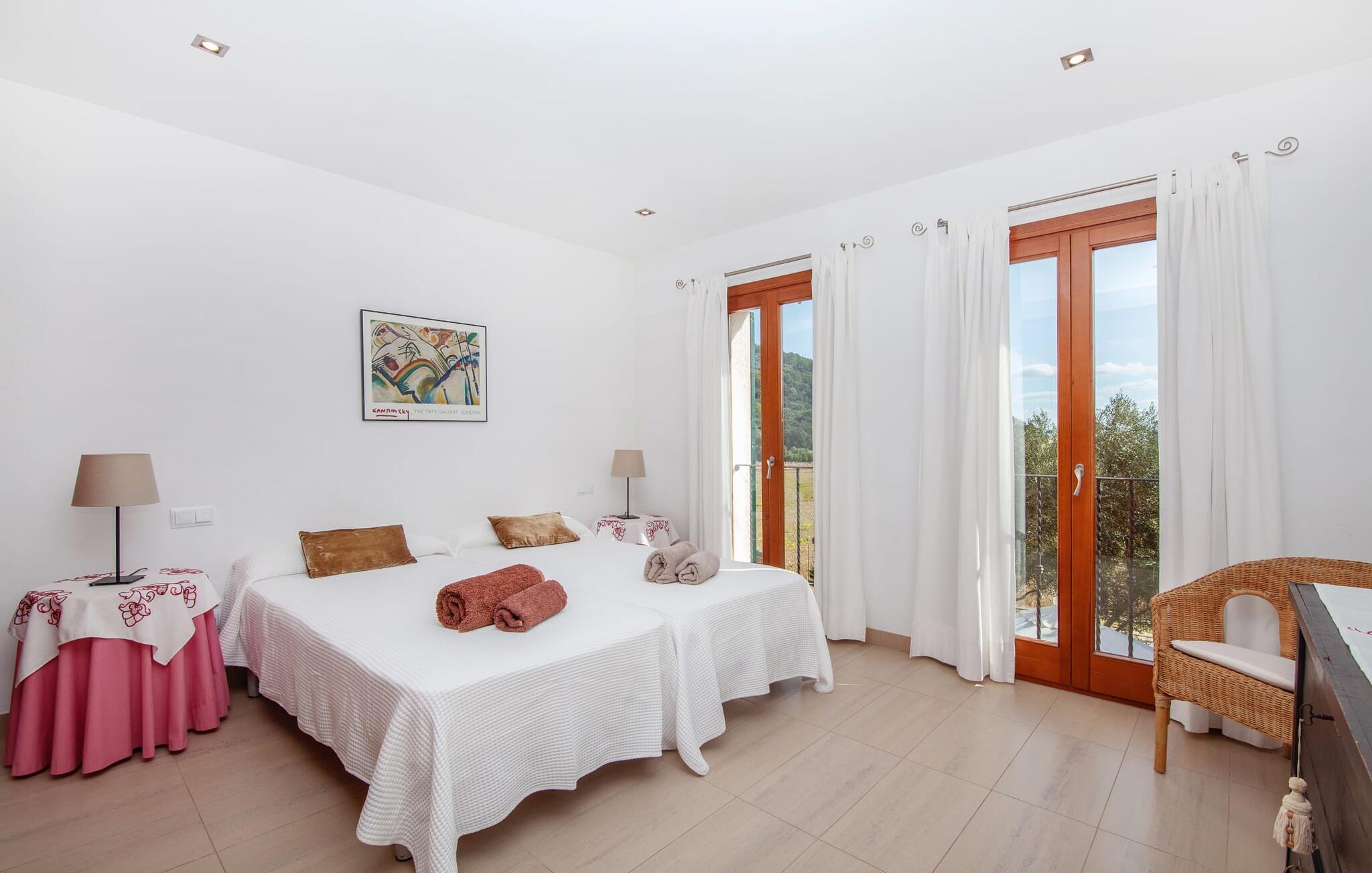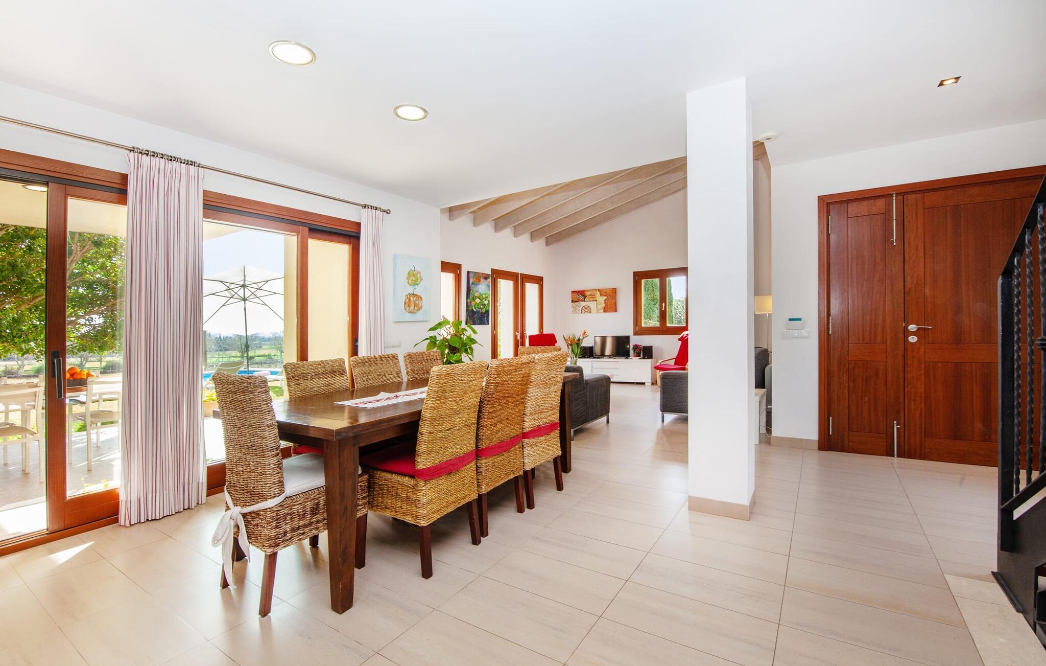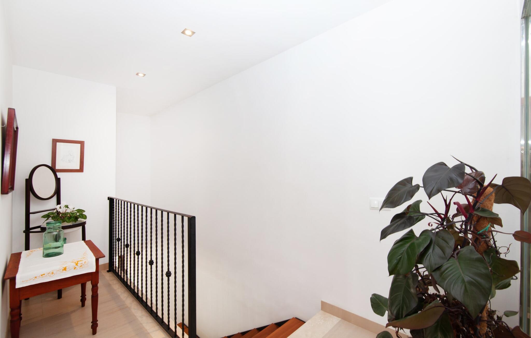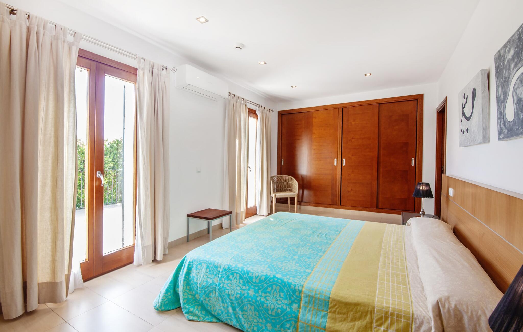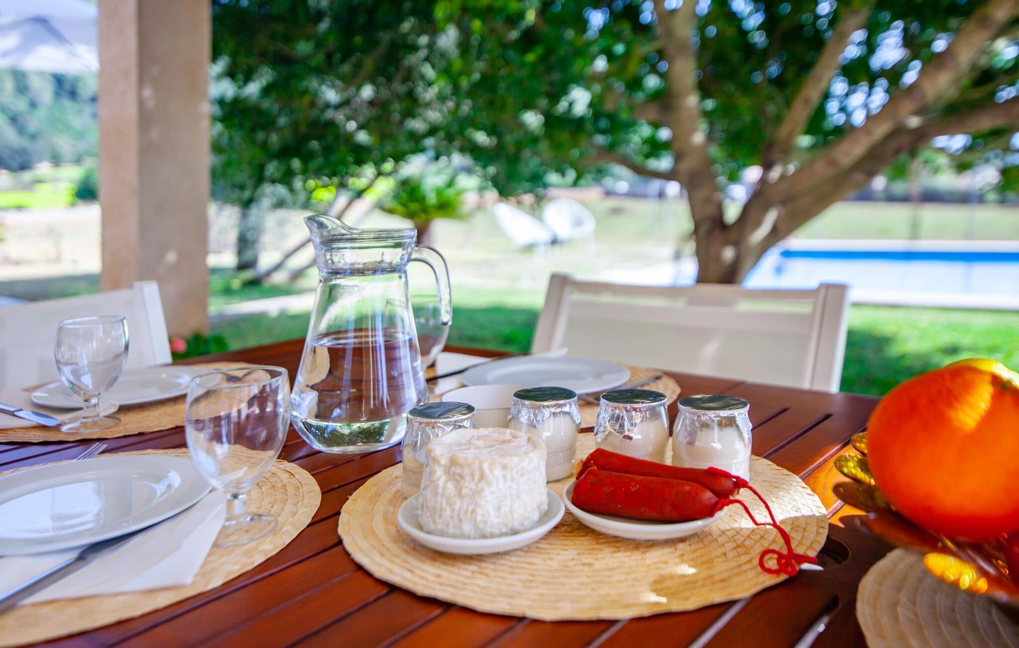 Dette vakre feriehuset på Mallorca er omgitt av frodige trær, og utsikten over det omkringliggende landskapet fra forsiden kan knapt bli mer fortryllende. Ved siden av det høye palmetreet får du straks lyst til å slå leir og nyte en bok og favorittdrinken din på en av de komfortable solsengene. Kjør videre! På plenen er det god plass til mange timers avslapping, og barna som har kommet med, vil garantert nyte plassen til å løpe rundt! På varme dager er det selvsagt ingen grunn til å stoppe for en forfriskning, og det lange bassenget innbyr til å ta noen lengder eller plaske rundt. Bassenget er veldig lett å nå via en hjørnetrapp og skråner deretter svakt nedover. Svømming med fjellutsikt! De stilfullt møblerte, åpne eller overbygde terrasseområdene inviterer deg til å slappe av rett ved siden av huset. Her er avstandene til kjøkken & co. korte, uten at det går på bekostning av utsikten over det grønne.