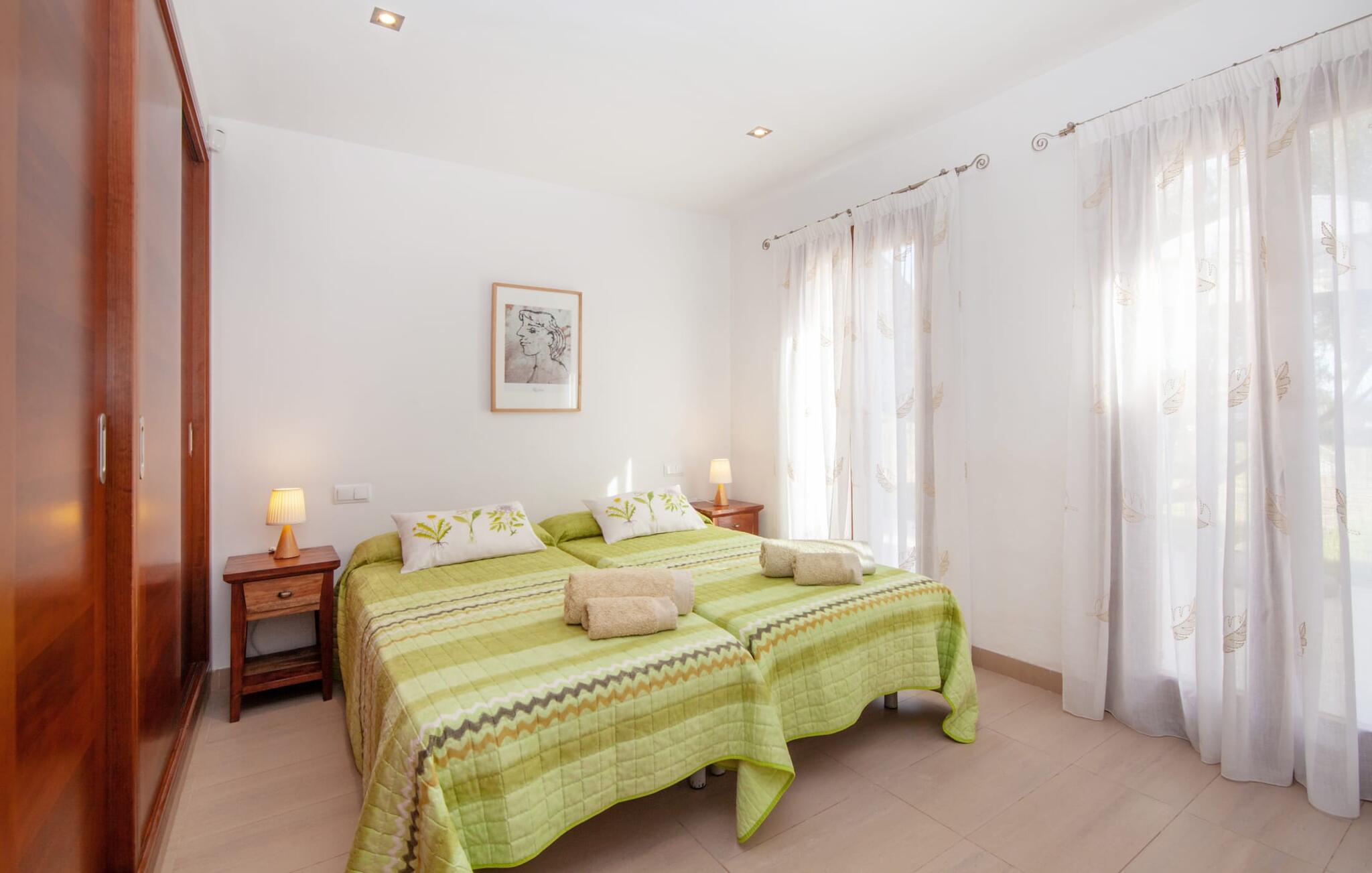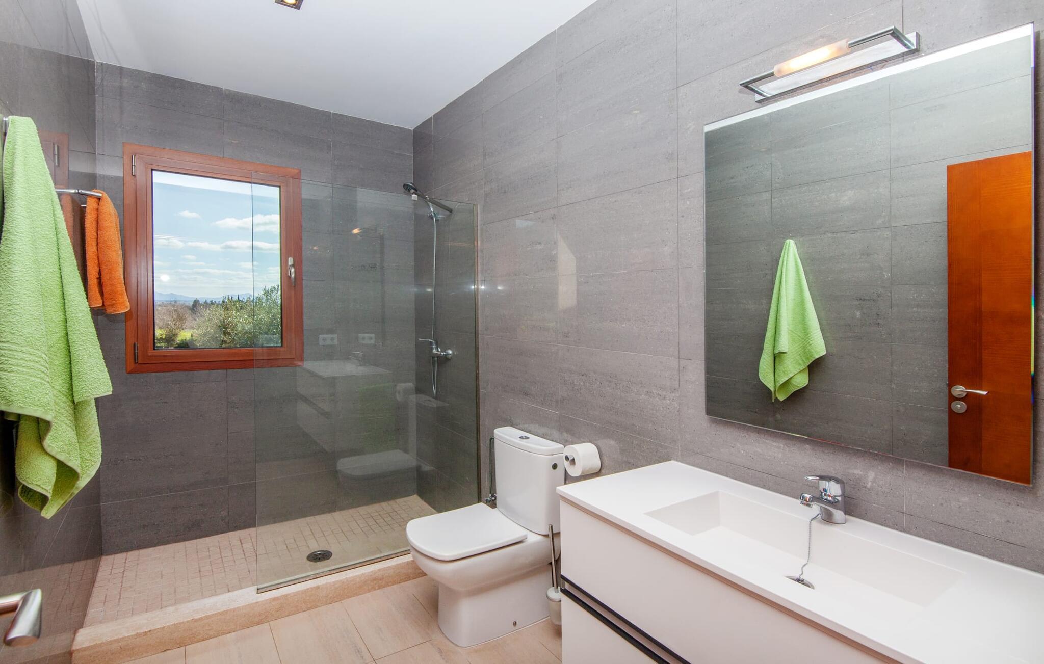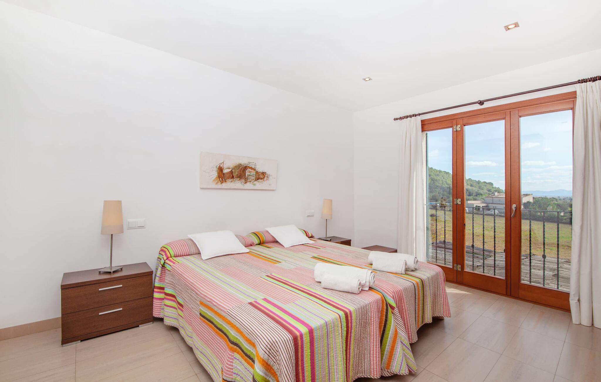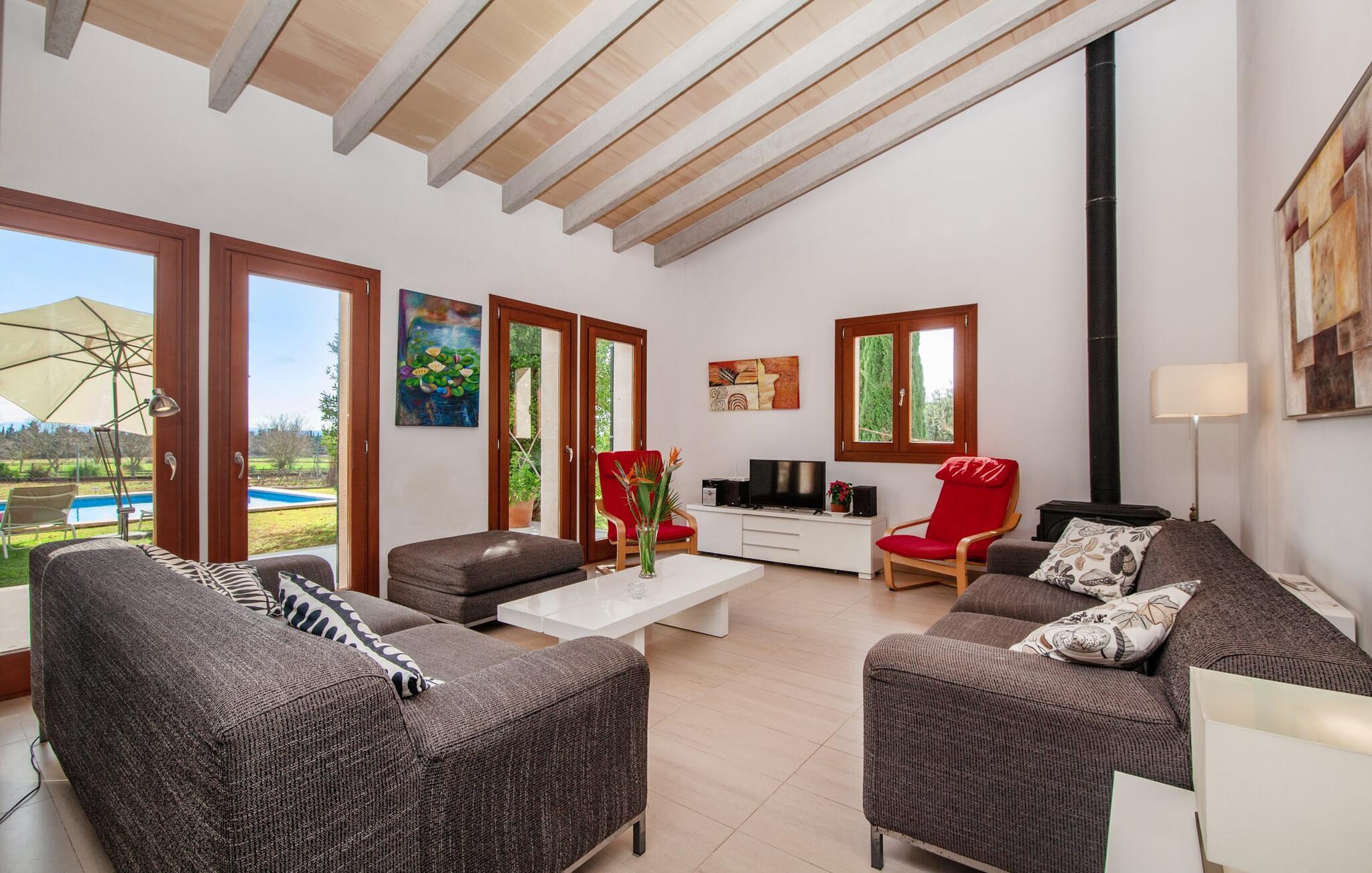 Dette vakre feriehuset på Mallorca er omgitt av frodige trær, og utsikten over det omkringliggende landskapet fra forsiden kan knapt bli mer fortryllende. Ved siden av det høye palmetreet får du straks lyst til å slå leir og nyte en bok og favorittdrinken din på en av de komfortable solsengene. Kjør videre! På plenen er det god plass til mange timers avslapping, og barna som har kommet med, vil garantert nyte plassen til å løpe rundt! På varme dager er det selvsagt ingen grunn til å stoppe for en forfriskning, og det lange bassenget innbyr til å ta noen lengder eller plaske rundt. Bassenget er veldig lett å nå via en hjørnetrapp og skråner deretter svakt nedover. Svømming med fjellutsikt! De stilfullt møblerte, åpne eller overbygde terrasseområdene inviterer deg til å slappe av rett ved siden av huset. Her er avstandene til kjøkken & co. korte, uten at det går på bekostning av utsikten over det grønne.