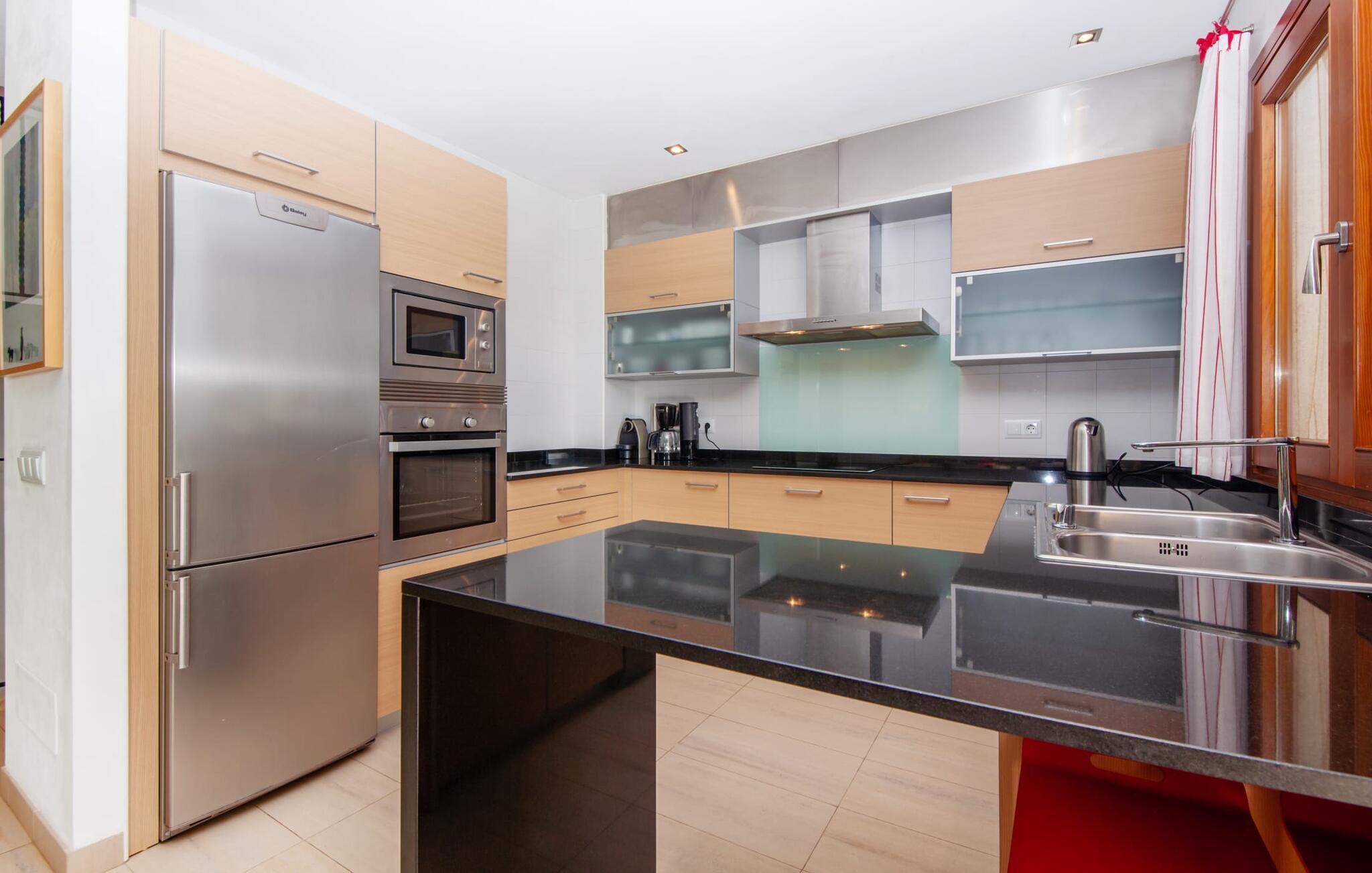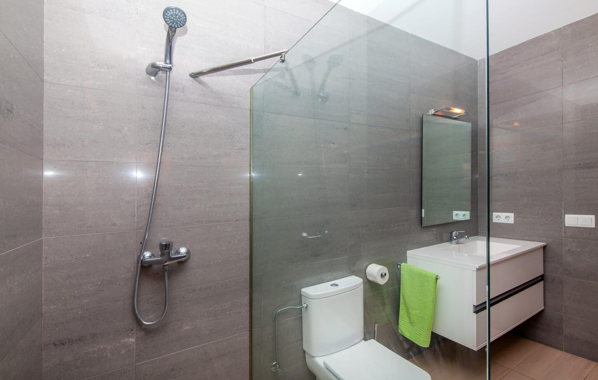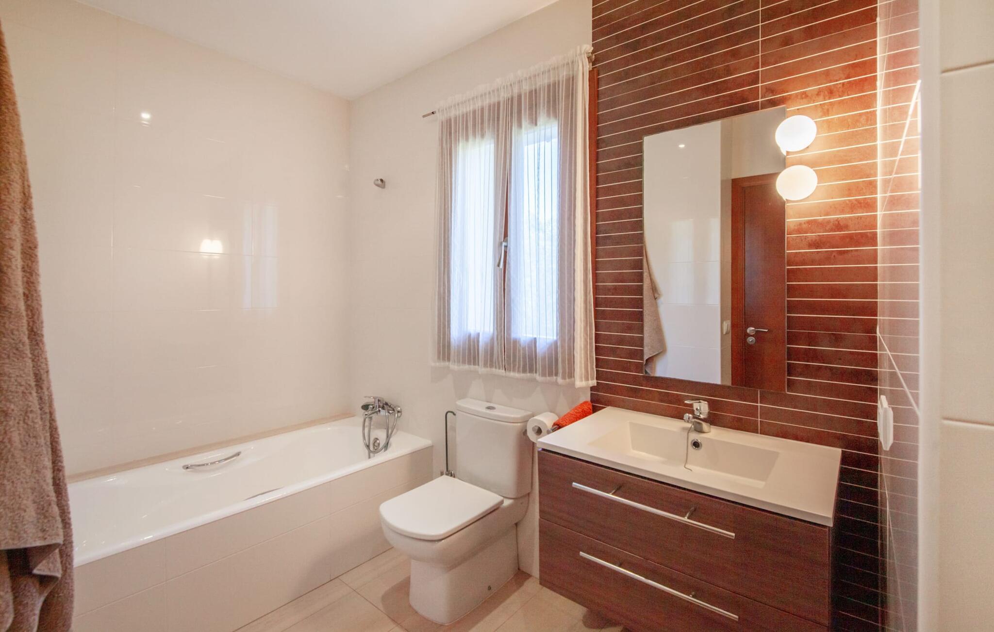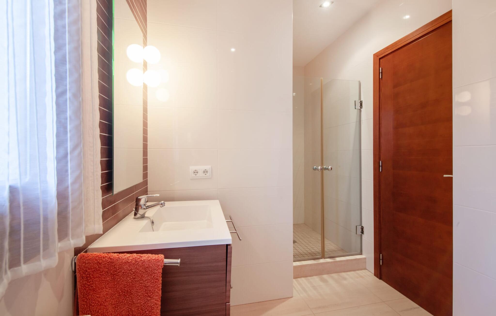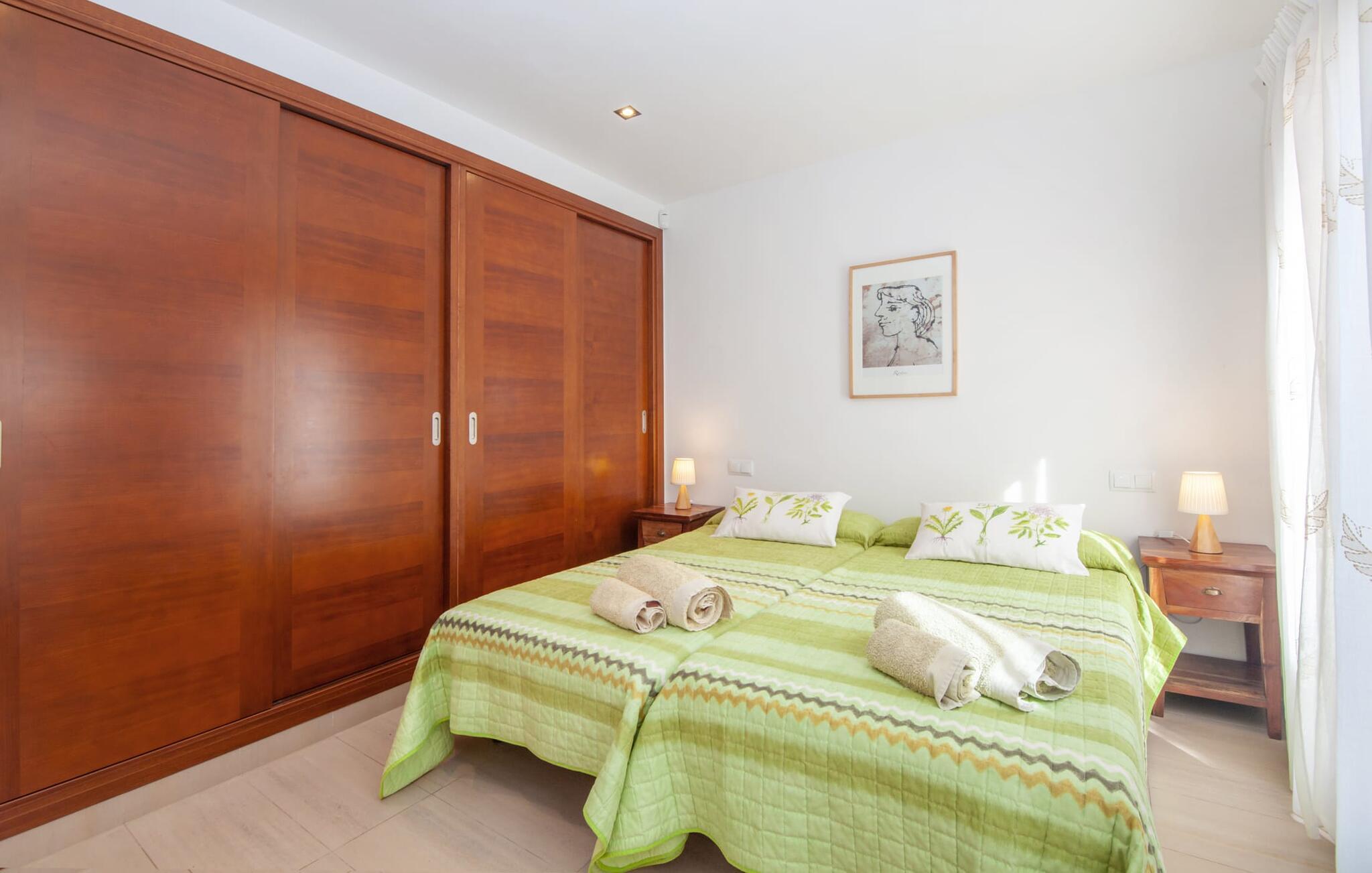 Dette vakre feriehuset på Mallorca er omgitt av frodige trær, og utsikten over det omkringliggende landskapet fra forsiden kan knapt bli mer fortryllende. Ved siden av det høye palmetreet får du straks lyst til å slå leir og nyte en bok og favorittdrinken din på en av de komfortable solsengene. Kjør videre! På plenen er det god plass til mange timers avslapping, og barna som har kommet med, vil garantert nyte plassen til å løpe rundt! På varme dager er det selvsagt ingen grunn til å stoppe for en forfriskning, og det lange bassenget innbyr til å ta noen lengder eller plaske rundt. Bassenget er veldig lett å nå via en hjørnetrapp og skråner deretter svakt nedover. Svømming med fjellutsikt! De stilfullt møblerte, åpne eller overbygde terrasseområdene inviterer deg til å slappe av rett ved siden av huset. Her er avstandene til kjøkken & co. korte, uten at det går på bekostning av utsikten over det grønne.