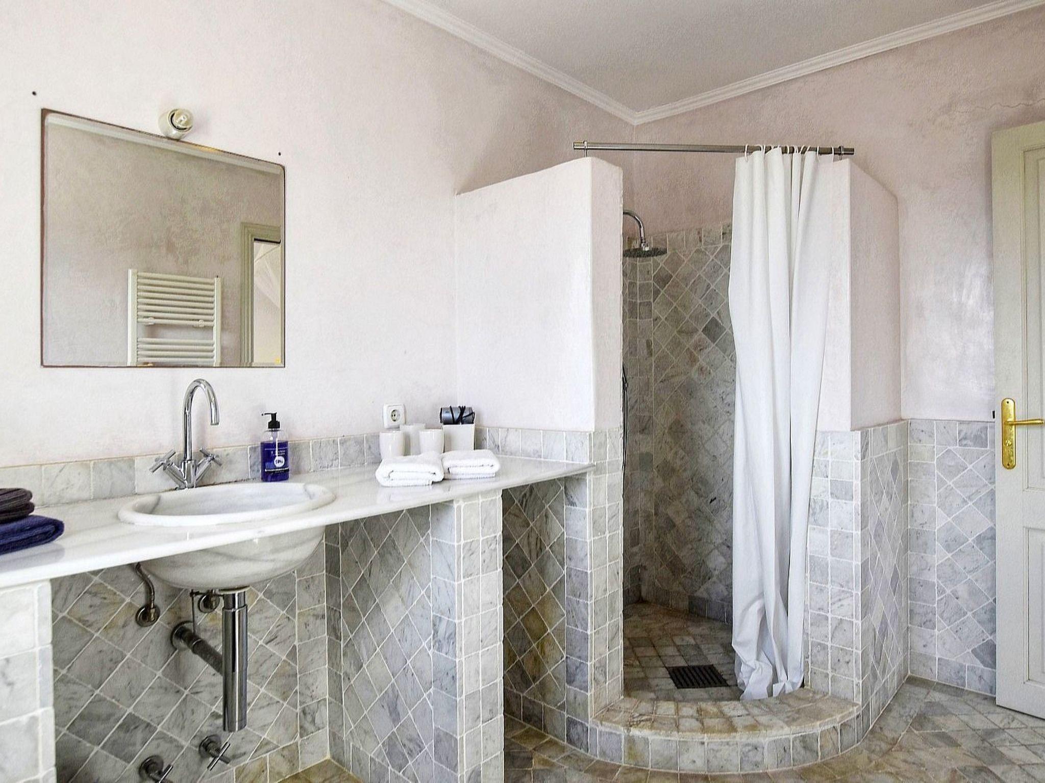 With about 220 m2 of living space on two floors, the finca offers a cosy atmosphere with aesthetic floors and white walls. High French windows and beamed ceilings tastefully complete the elegant interior. It also invites you to relax on the sofa in the cosy living room with satellite TV. The dining table is located directly opposite the fully equipped kitchen. The three bright bedrooms guarantee restful nights. One of them is on the ground floor (1x double bed) and the other two, with access to a terrace with fantastic views of the garden and the landscape, on the upper floor (2x double bed). There are a total of three bathrooms, one on the ground floor (1x with shower) and the other two on the upper floor (1x shower, 1x bath shower, both en suite).