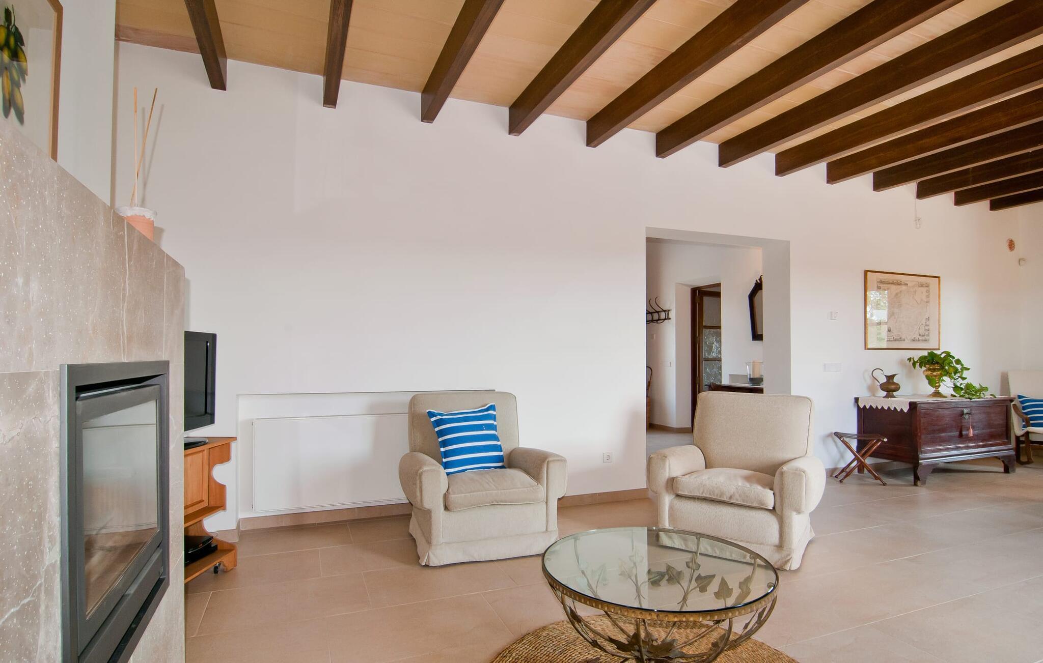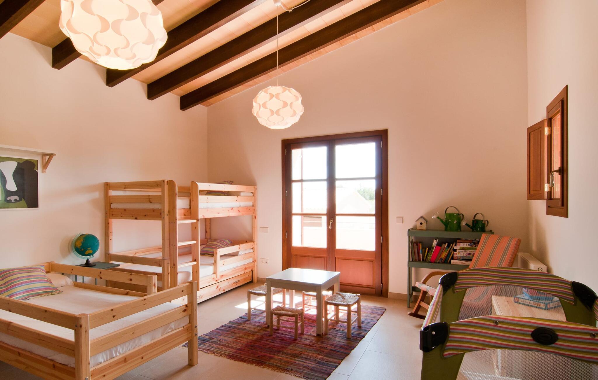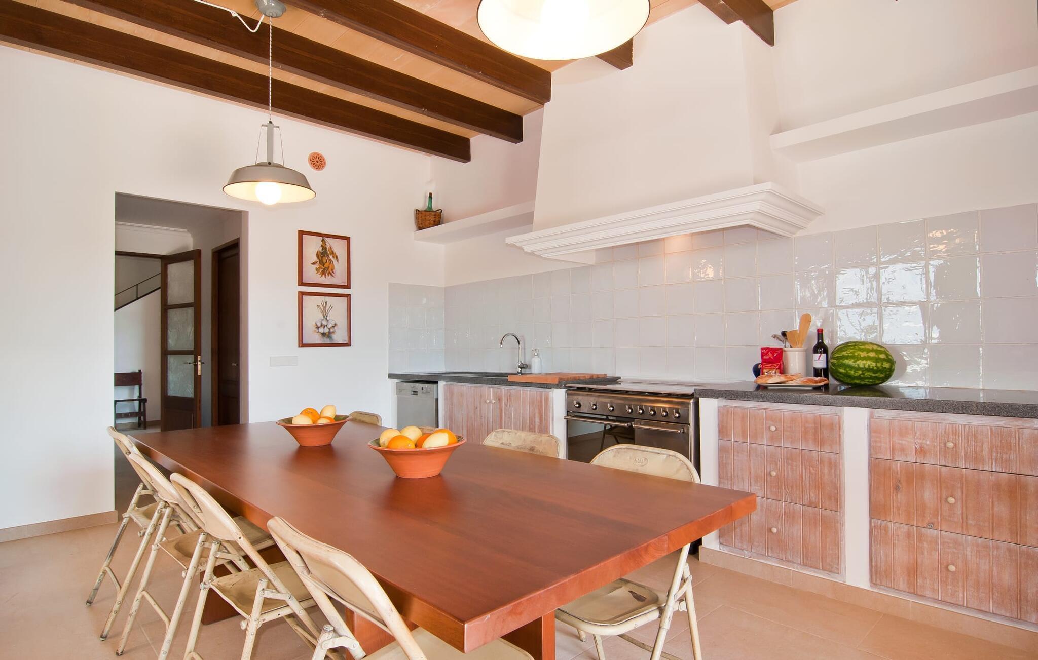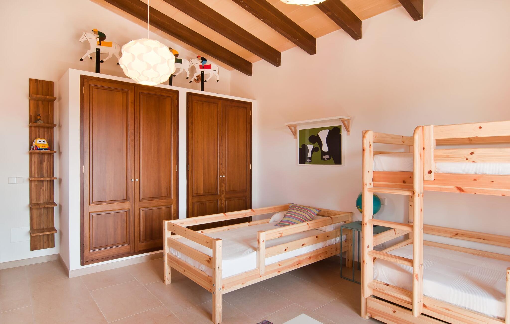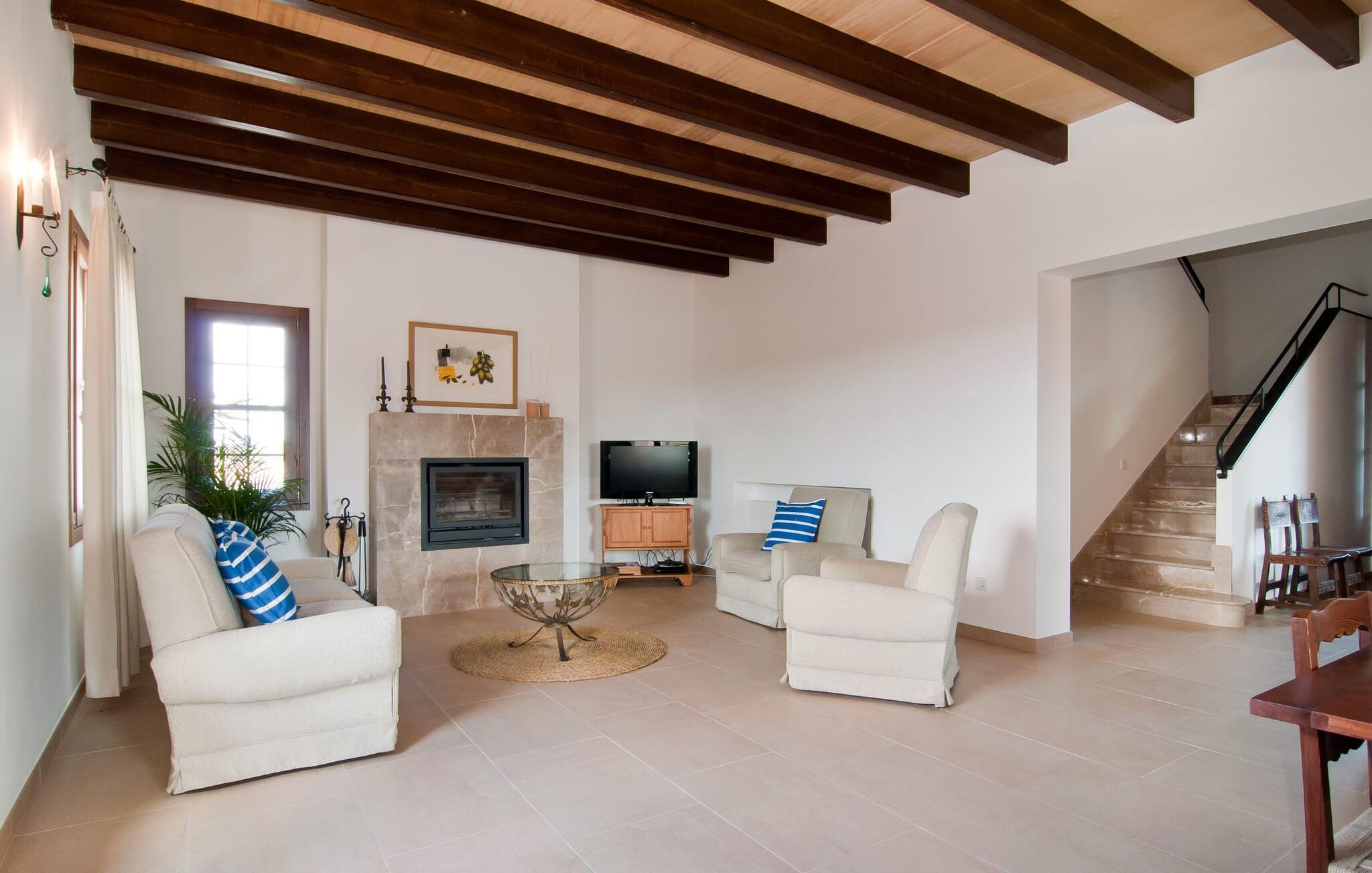 Interiøret i huset er ikke bare koselig, men også svært smakfullt og skaper en fantastisk atmosfære å oppholde seg i. Lyse materialer er omgitt av kontrasterende elementer, hvorav de fleste er laget av tre og bidrar betydelig til den harmoniske atmosfæren. Du kan sette deg godt til rette i sofaområdet eller spise sammen i den avslappende åpne stue-/spisestuen. TV og peis avrunder komforten i dette rommet. I dette huset er det spartansk og forsiktig med innredningen, slik at rommene aldri blir rotete, men tvert imot preges av en behagelig følelse av romslighet. Dette gjelder også det romslige kjøkkenet, der typisk mallorcinsk stil er dyktig kombinert med modernitet. Et flott sted for en feiring med familie eller venner. Kjøkkenet har alt du trenger for dine daglige behov. Filterkaffemaskinen lar deg lage fersk kaffe hver morgen. Fire soverom er individuelt innredet og tilbyr det ideelle hvilestedet for enhver smak. Overnattingsstedet har totalt seks senger, hvorav fire er 0,90 x 2,00 meter og to er 1,60 x 2,00 meter. Et annet soverom er vakkert innredet som barnerom og har en enkeltseng og en køyeseng med en tredje uttrekkbar seng. Madrassmålene her er 0,80 x 1,80 meter. Dette feriehuset har derfor plass til maksimalt åtte voksne og fire barn. De tre stilfulle badene, ett i første etasje og de to andre i andre etasje, er utstyrt med sofistikert inventar og viderefører husets estetikk på en overbevisende måte. To hårføner og et strykejern er tilgjengelig i huset og trenger ikke tas med hjemmefra.