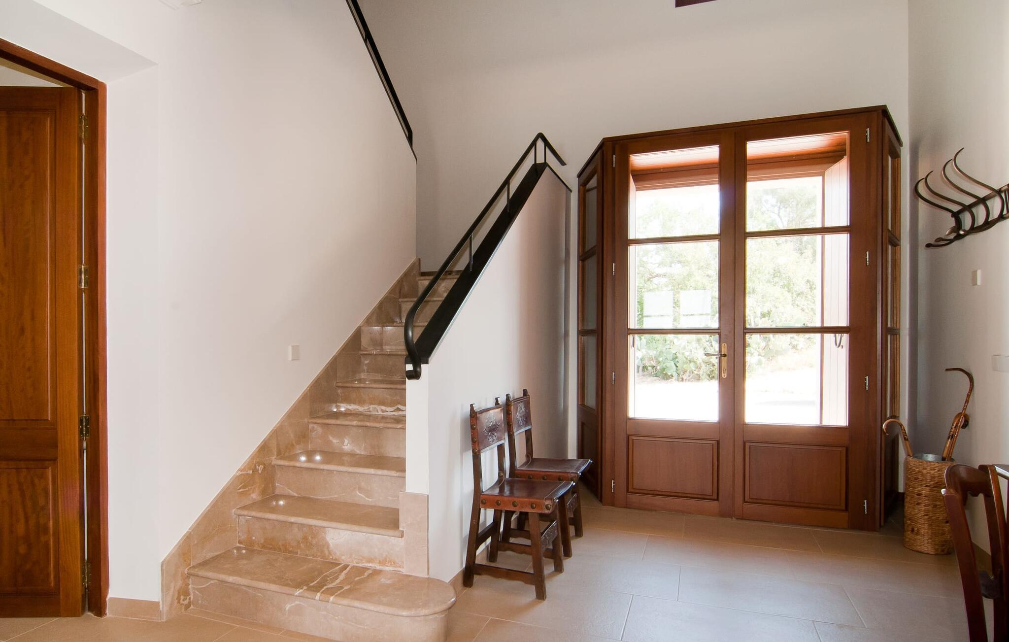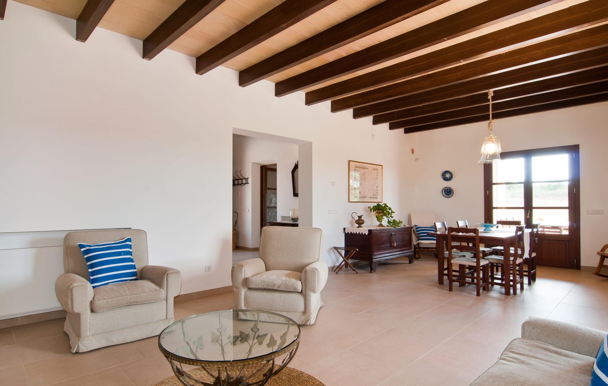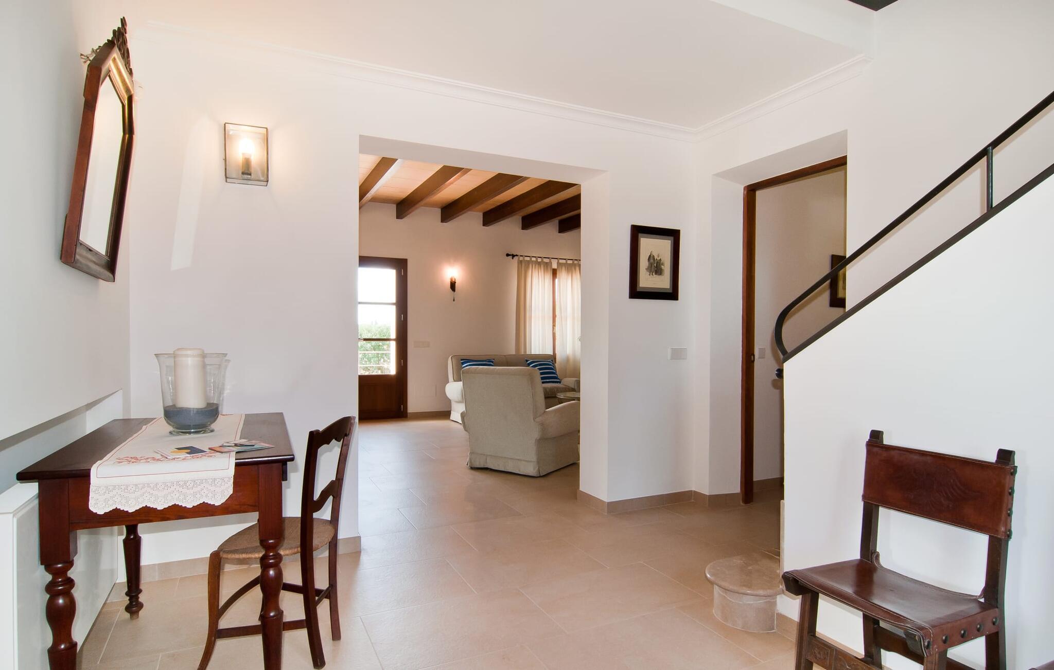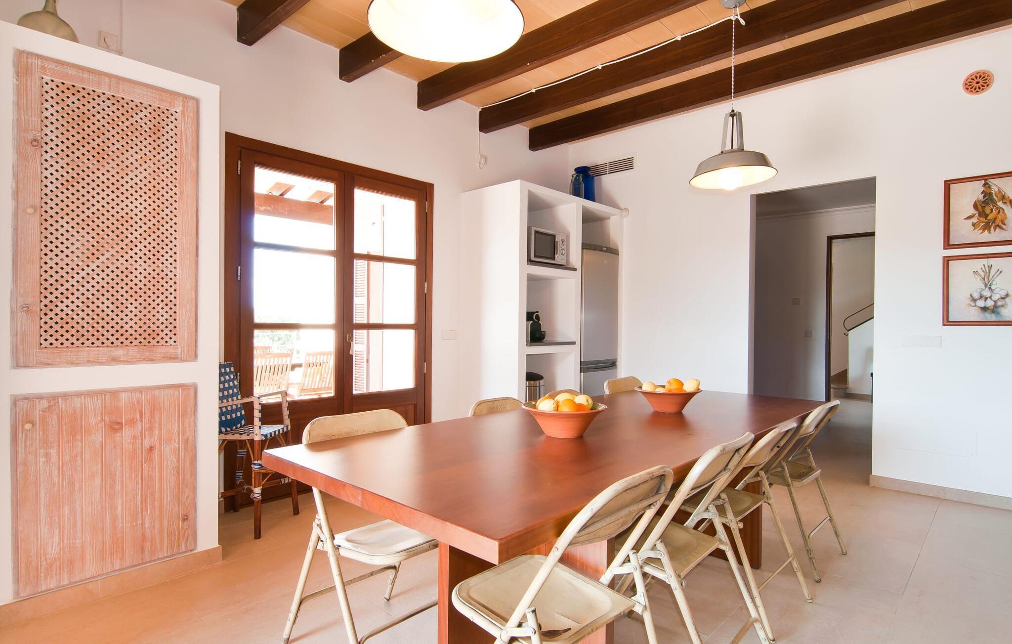 Interiøret i huset er ikke bare koselig, men også svært smakfullt og skaper en fantastisk atmosfære å oppholde seg i. Lyse materialer er omgitt av kontrasterende elementer, hvorav de fleste er laget av tre og bidrar betydelig til den harmoniske atmosfæren. Du kan sette deg godt til rette i sofaområdet eller spise sammen i den avslappende åpne stue-/spisestuen. TV og peis avrunder komforten i dette rommet. I dette huset er det spartansk og forsiktig med innredningen, slik at rommene aldri blir rotete, men tvert imot preges av en behagelig følelse av romslighet. Dette gjelder også det romslige kjøkkenet, der typisk mallorcinsk stil er dyktig kombinert med modernitet. Et flott sted for en feiring med familie eller venner. Kjøkkenet har alt du trenger for dine daglige behov. Filterkaffemaskinen lar deg lage fersk kaffe hver morgen. Fire soverom er individuelt innredet og tilbyr det ideelle hvilestedet for enhver smak. Overnattingsstedet har totalt seks senger, hvorav fire er 0,90 x 2,00 meter og to er 1,60 x 2,00 meter. Et annet soverom er vakkert innredet som barnerom og har en enkeltseng og en køyeseng med en tredje uttrekkbar seng. Madrassmålene her er 0,80 x 1,80 meter. Dette feriehuset har derfor plass til maksimalt åtte voksne og fire barn. De tre stilfulle badene, ett i første etasje og de to andre i andre etasje, er utstyrt med sofistikert inventar og viderefører husets estetikk på en overbevisende måte. To hårføner og et strykejern er tilgjengelig i huset og trenger ikke tas med hjemmefra.