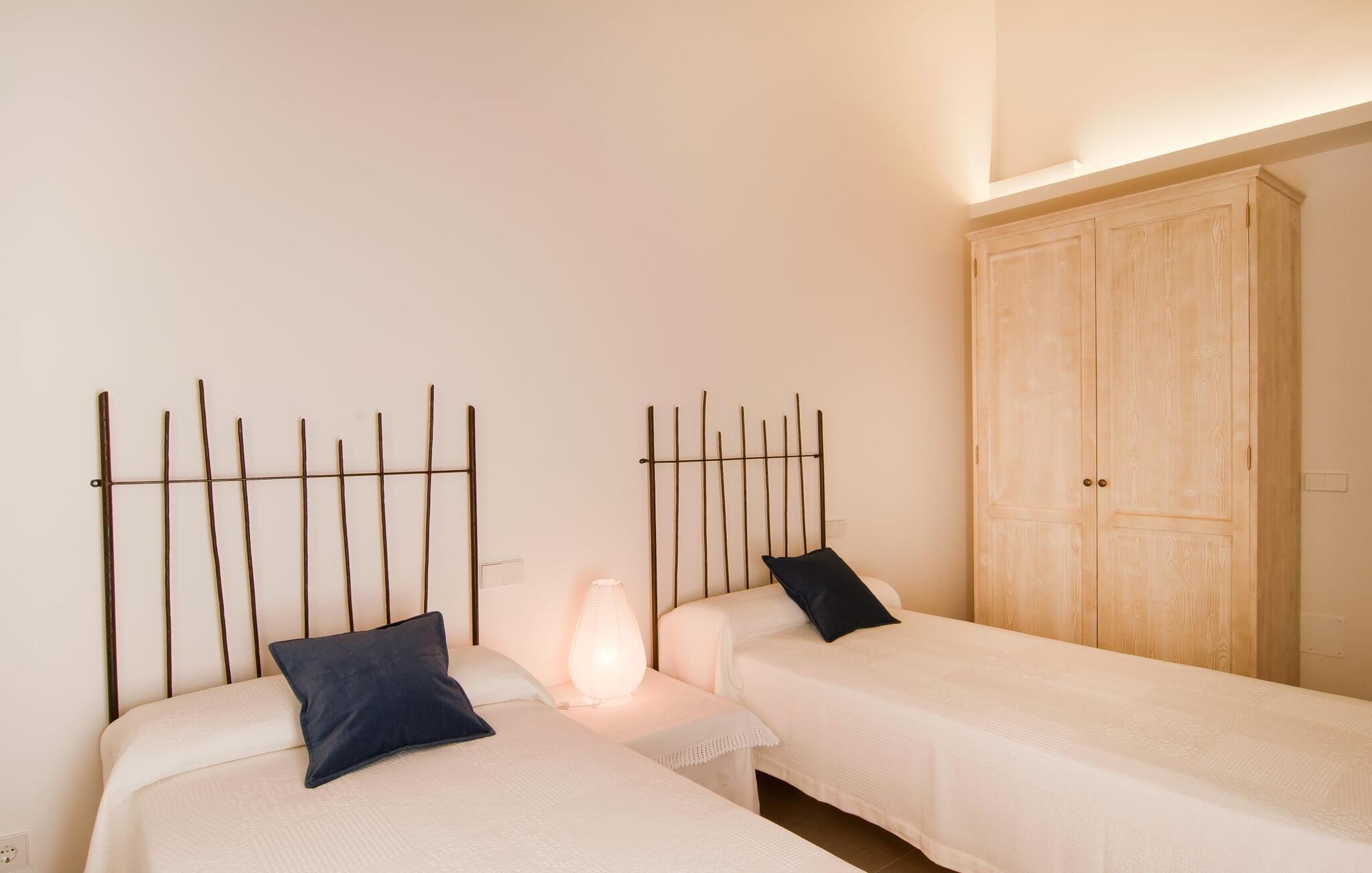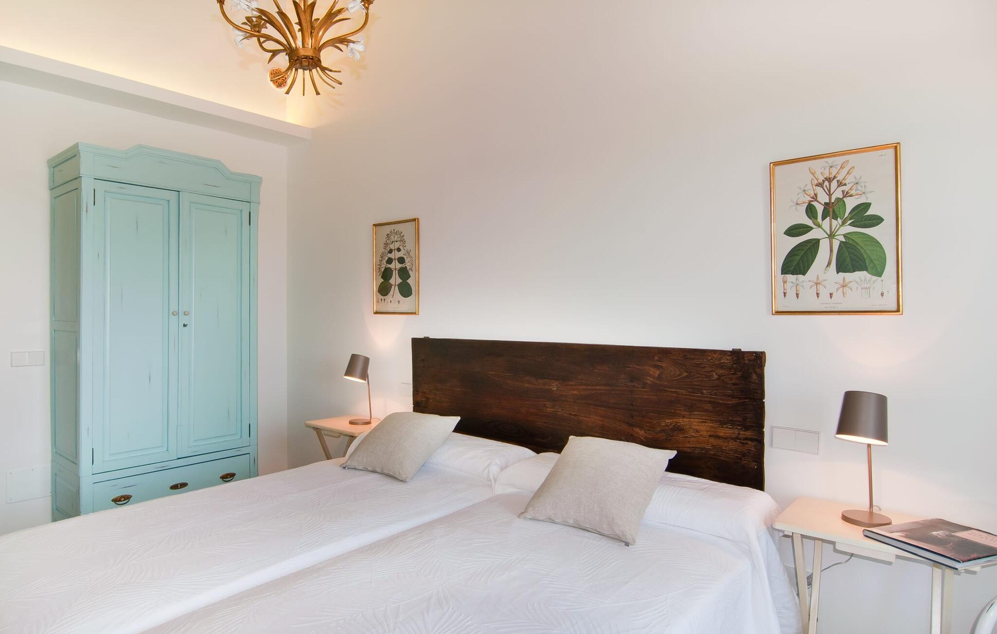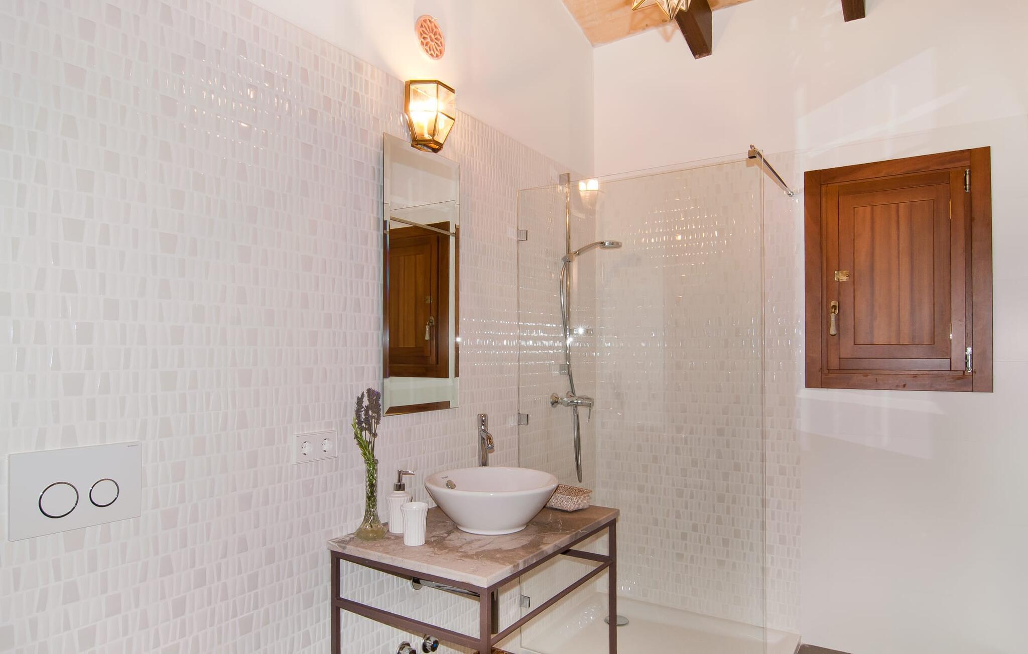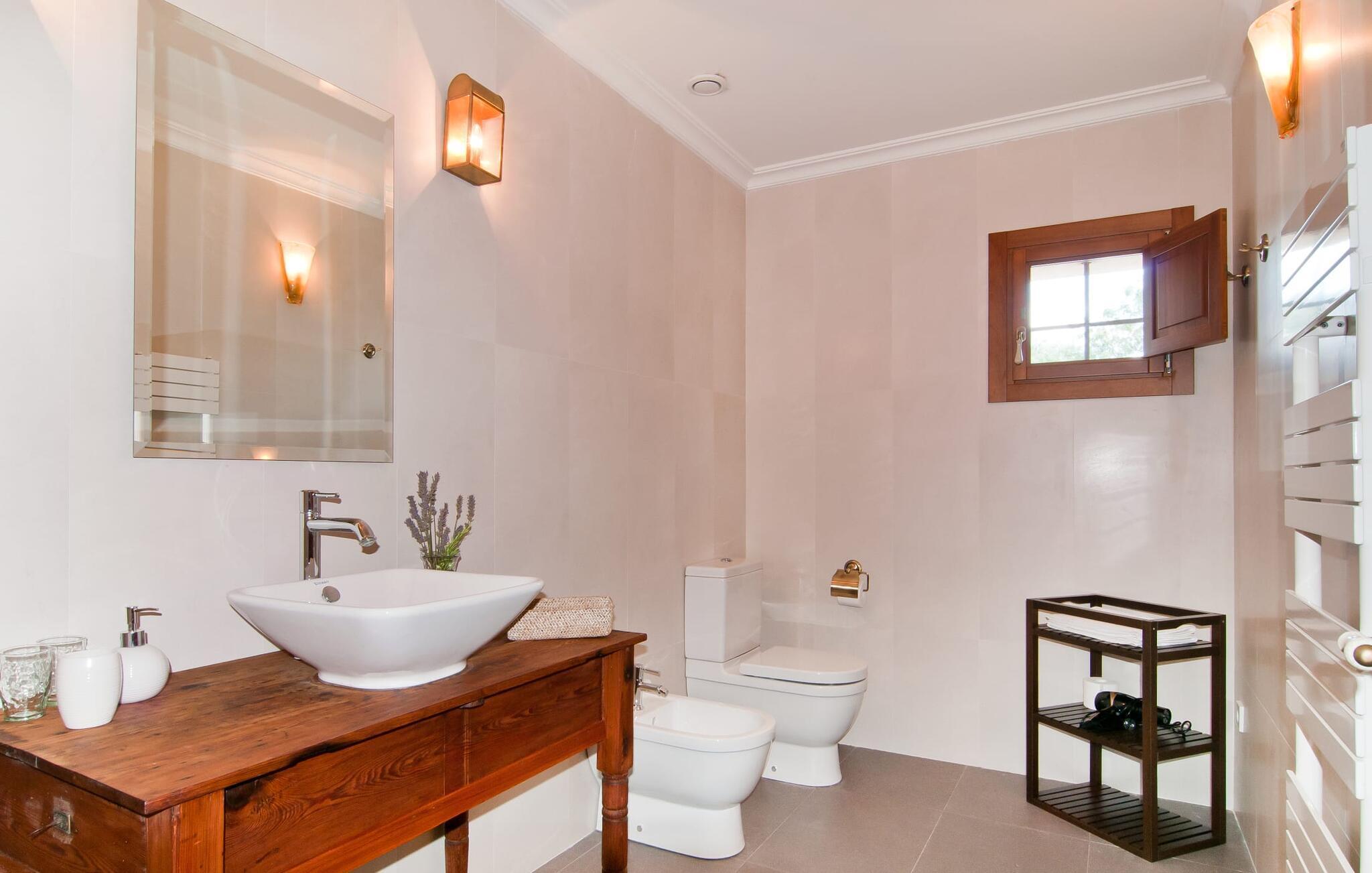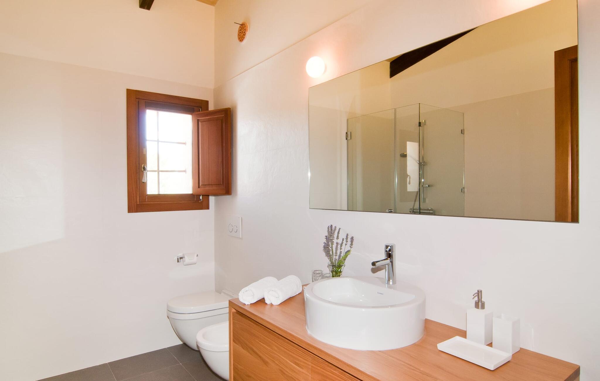 Interiøret i huset er ikke bare koselig, men også svært smakfullt og skaper en fantastisk atmosfære å oppholde seg i. Lyse materialer er omgitt av kontrasterende elementer, hvorav de fleste er laget av tre og bidrar betydelig til den harmoniske atmosfæren. Du kan sette deg godt til rette i sofaområdet eller spise sammen i den avslappende åpne stue-/spisestuen. TV og peis avrunder komforten i dette rommet. I dette huset er det spartansk og forsiktig med innredningen, slik at rommene aldri blir rotete, men tvert imot preges av en behagelig følelse av romslighet. Dette gjelder også det romslige kjøkkenet, der typisk mallorcinsk stil er dyktig kombinert med modernitet. Et flott sted for en feiring med familie eller venner. Kjøkkenet har alt du trenger for dine daglige behov. Filterkaffemaskinen lar deg lage fersk kaffe hver morgen. Fire soverom er individuelt innredet og tilbyr det ideelle hvilestedet for enhver smak. Overnattingsstedet har totalt seks senger, hvorav fire er 0,90 x 2,00 meter og to er 1,60 x 2,00 meter. Et annet soverom er vakkert innredet som barnerom og har en enkeltseng og en køyeseng med en tredje uttrekkbar seng. Madrassmålene her er 0,80 x 1,80 meter. Dette feriehuset har derfor plass til maksimalt åtte voksne og fire barn. De tre stilfulle badene, ett i første etasje og de to andre i andre etasje, er utstyrt med sofistikert inventar og viderefører husets estetikk på en overbevisende måte. To hårføner og et strykejern er tilgjengelig i huset og trenger ikke tas med hjemmefra.