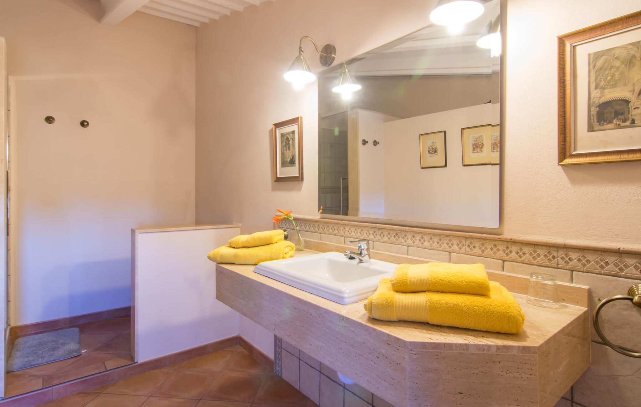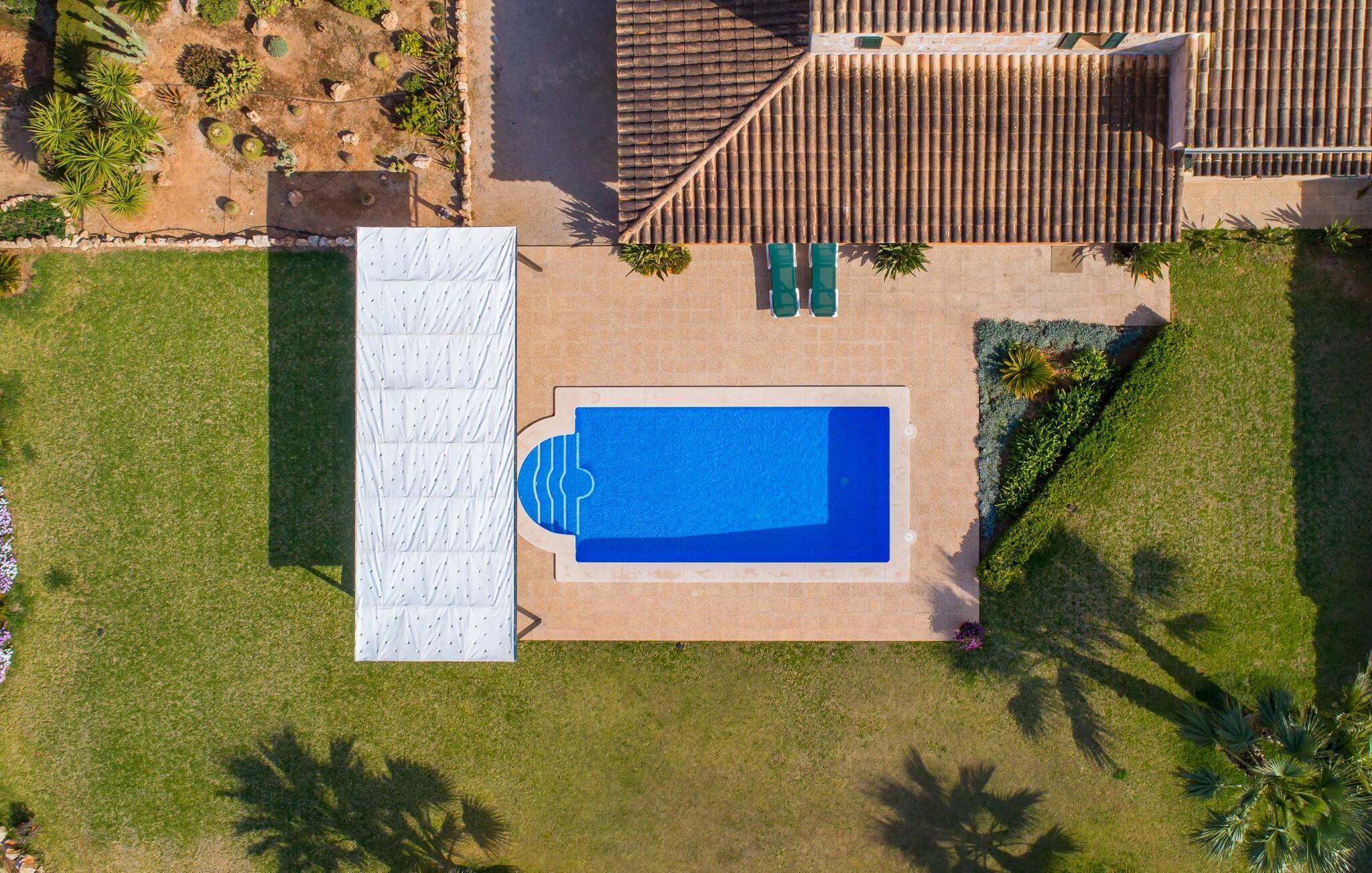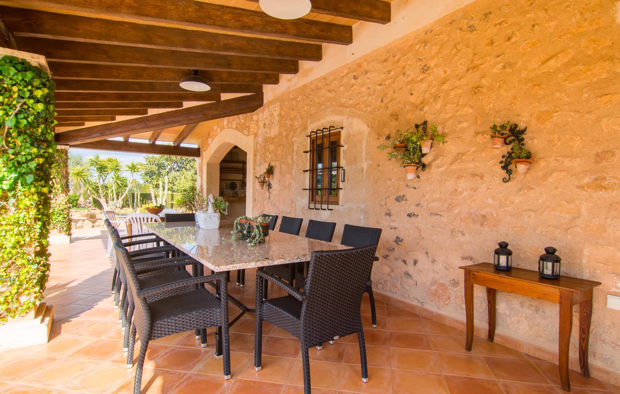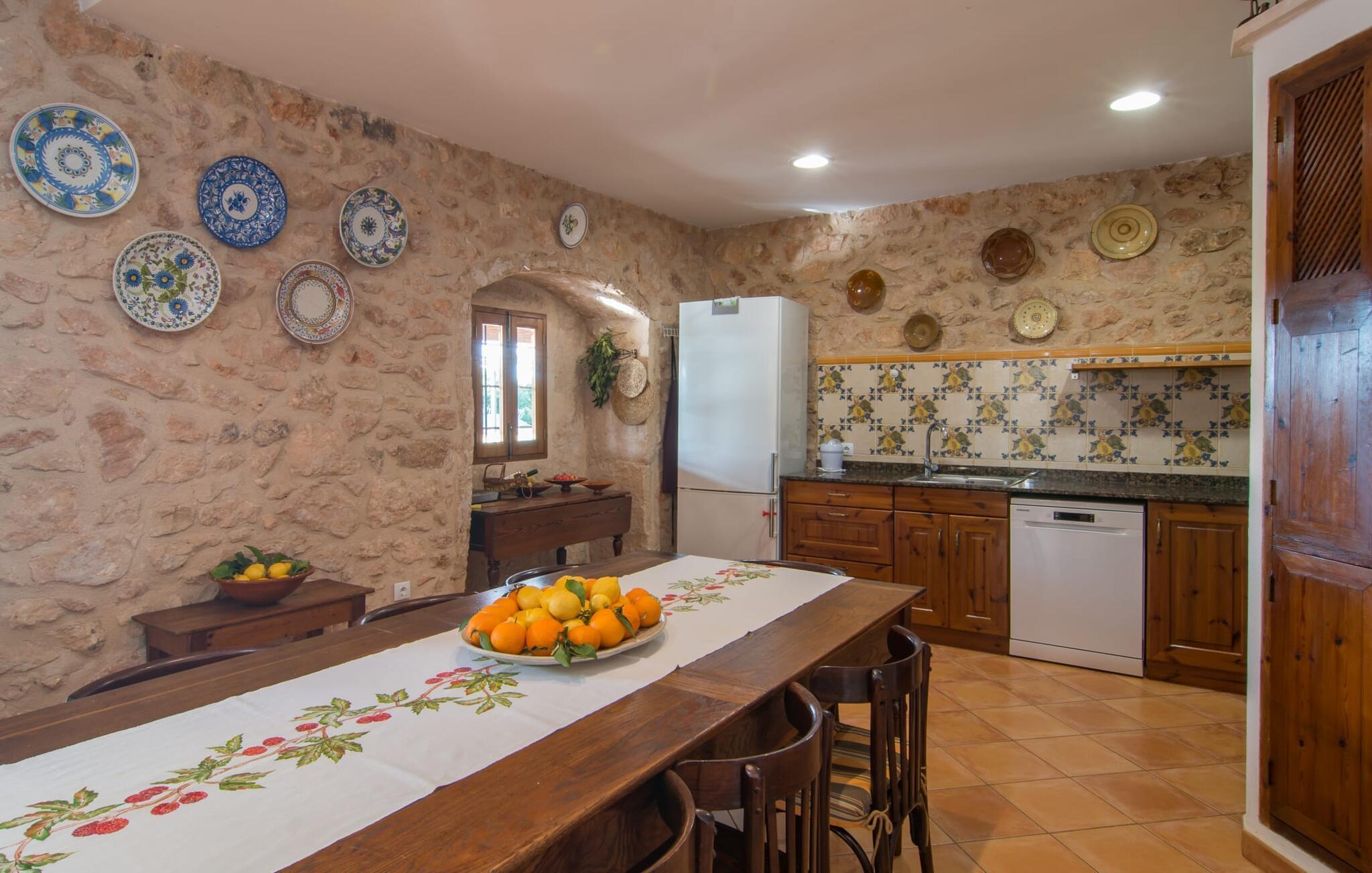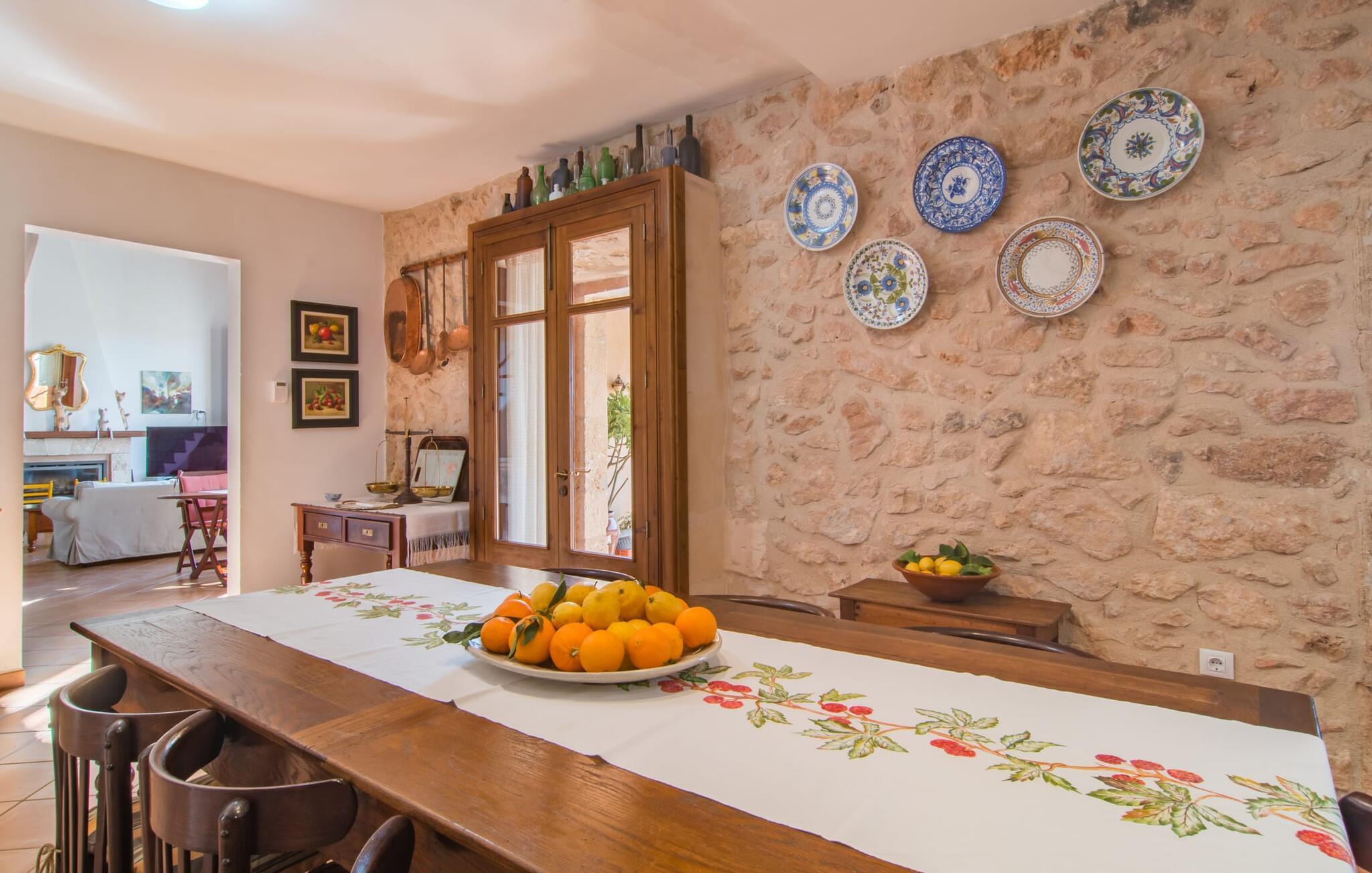 Innvendig er den mallorkinske landhusstilen tydelig i den romslige, solfylte stue- og spisestuen med stor takhøyde, terrakotta, treverk og steinelementer. Spisekjøkkenet har alt du trenger for en avslappende ferie. To av de fem soverommene ligger i første etasje, og alle fem har klimaanlegg. Fire av soverommene har eget bad, noe som gir komfort for større grupper. Alle soverommene har fantastisk utsikt over den omkringliggende naturen, noe som legger til rette for uforglemmelige utflukter.