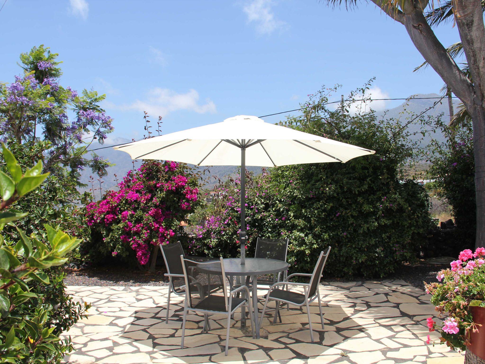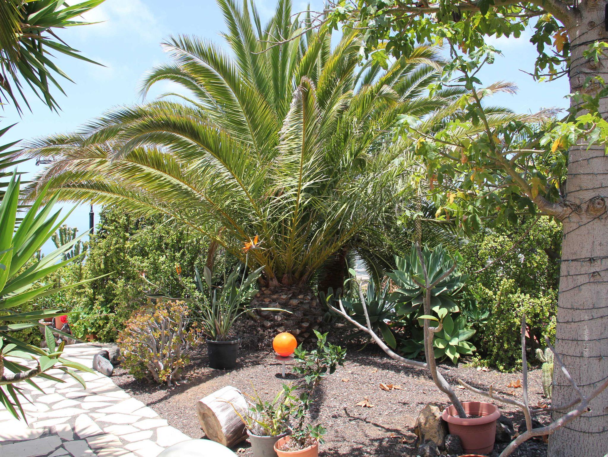 Die ca. 2600qm umfassende Gartenanlage bietet sowohl sonnige als auch schattige Plätze. Sie ist großzügig angelegt und bietet kleine Überraschungen, wie die Vogelvoliere, in der Nymphensittiche und Zwergpapageien munter tirillieren. Kleine Wege führen durch die einheimische Pflanzenwelt mit kleineren und größeren Blüten, Früchten und Sträuchern. Tomaten, Avocados, Nisperos und Feigen laden je nach Jahreszeit ein, sich zu bedienen. Außerdem gibt es einen kleinen Grillplatz im Garten.