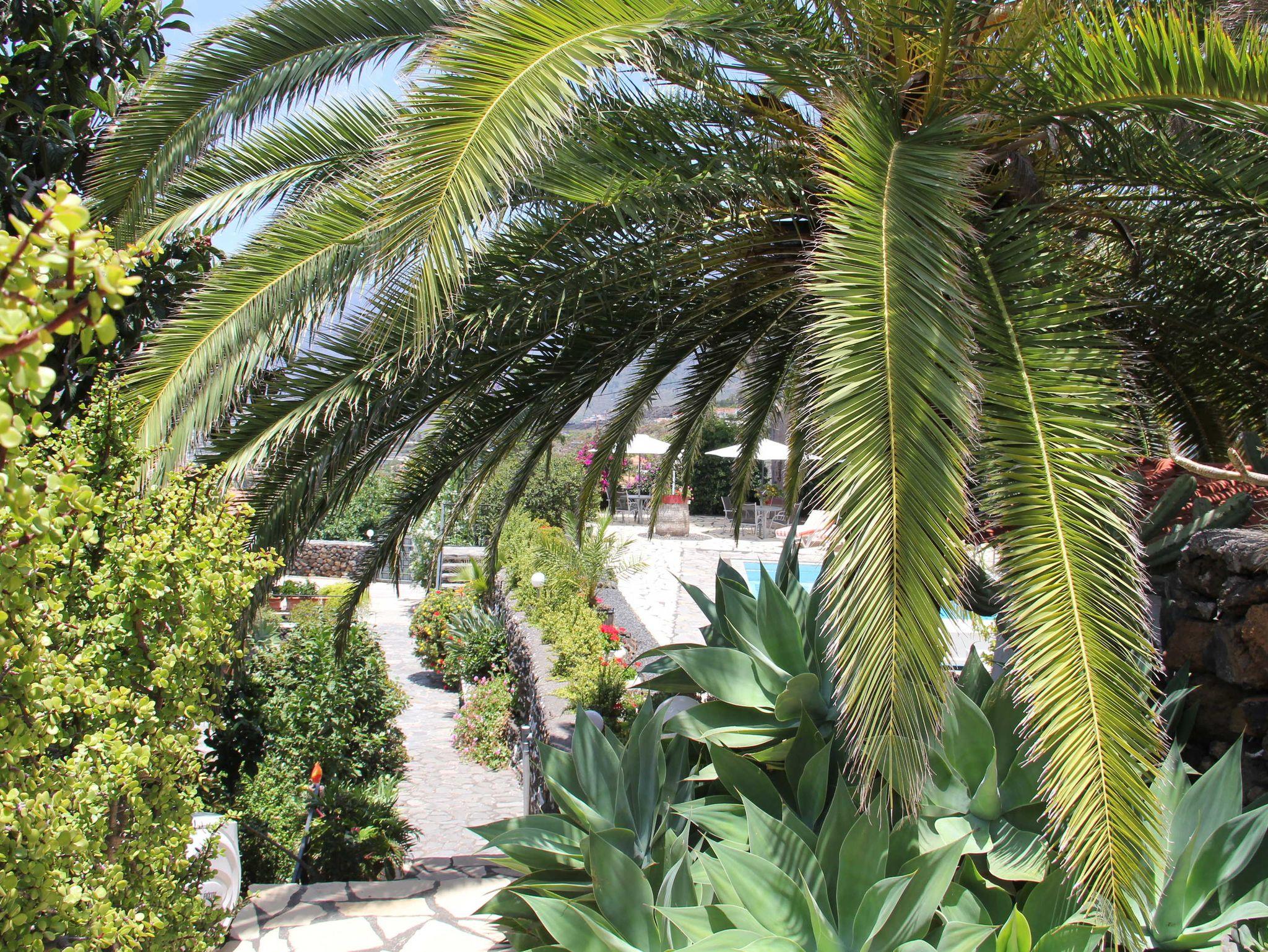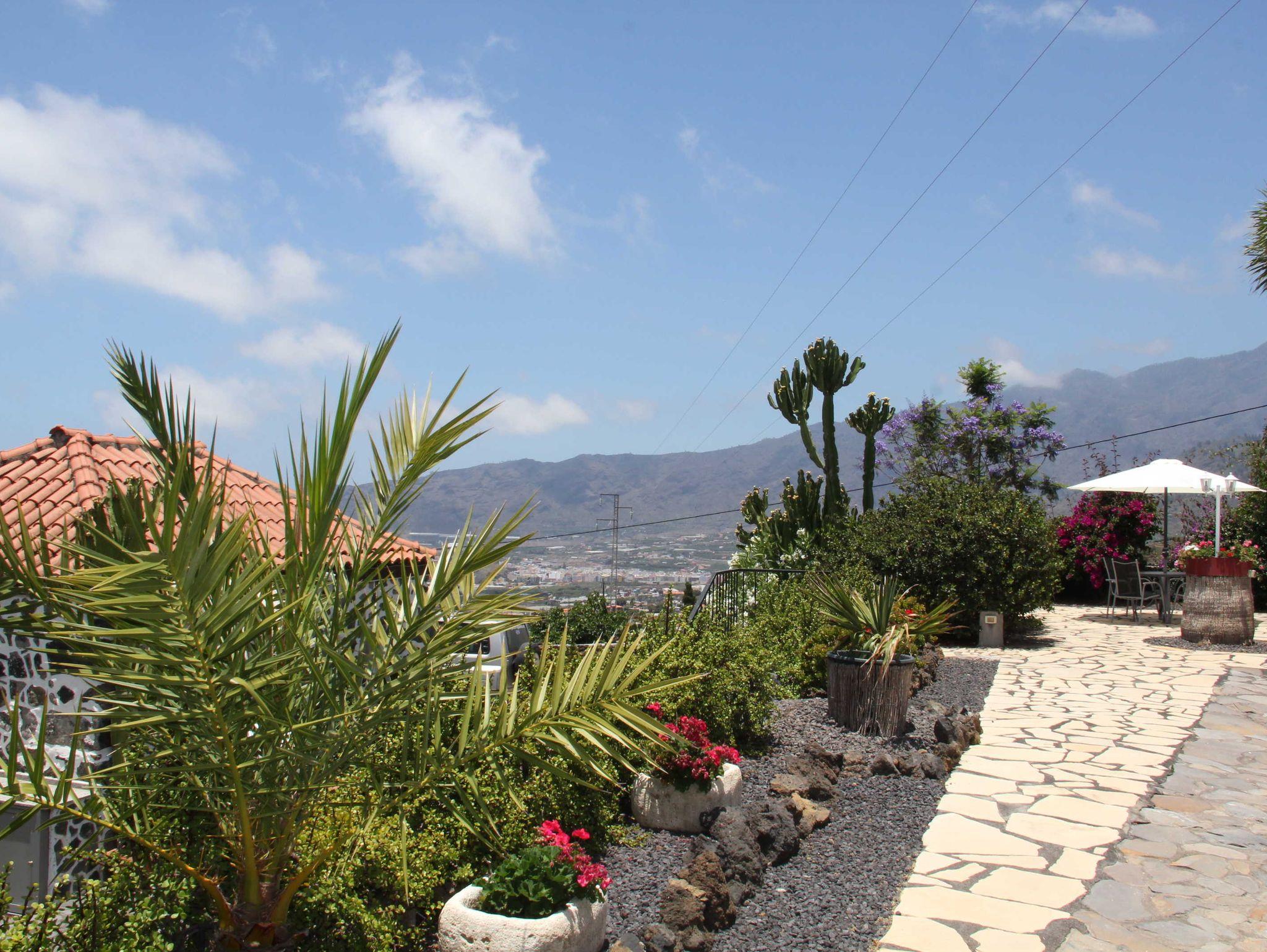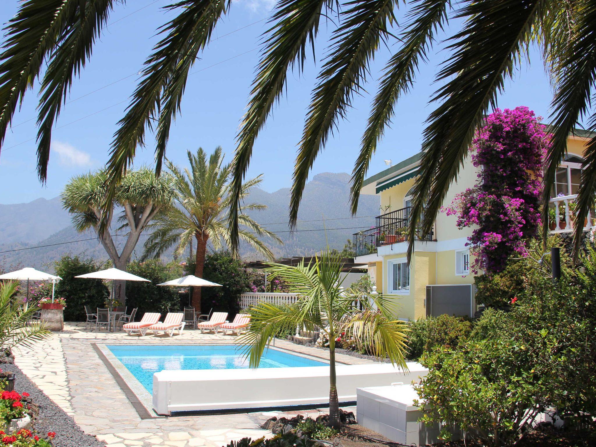 2 Häuser gehören zum Jardin de Aridane. Ein Doppelhaus, eingeschossig, weiter links im Garten mit zwei Apartments (Bungalowhälften) und das Haupthaus am bzw. über dem Pool, in dem oben die Eigentümer wohnen und unten das Studioapartment liegt.