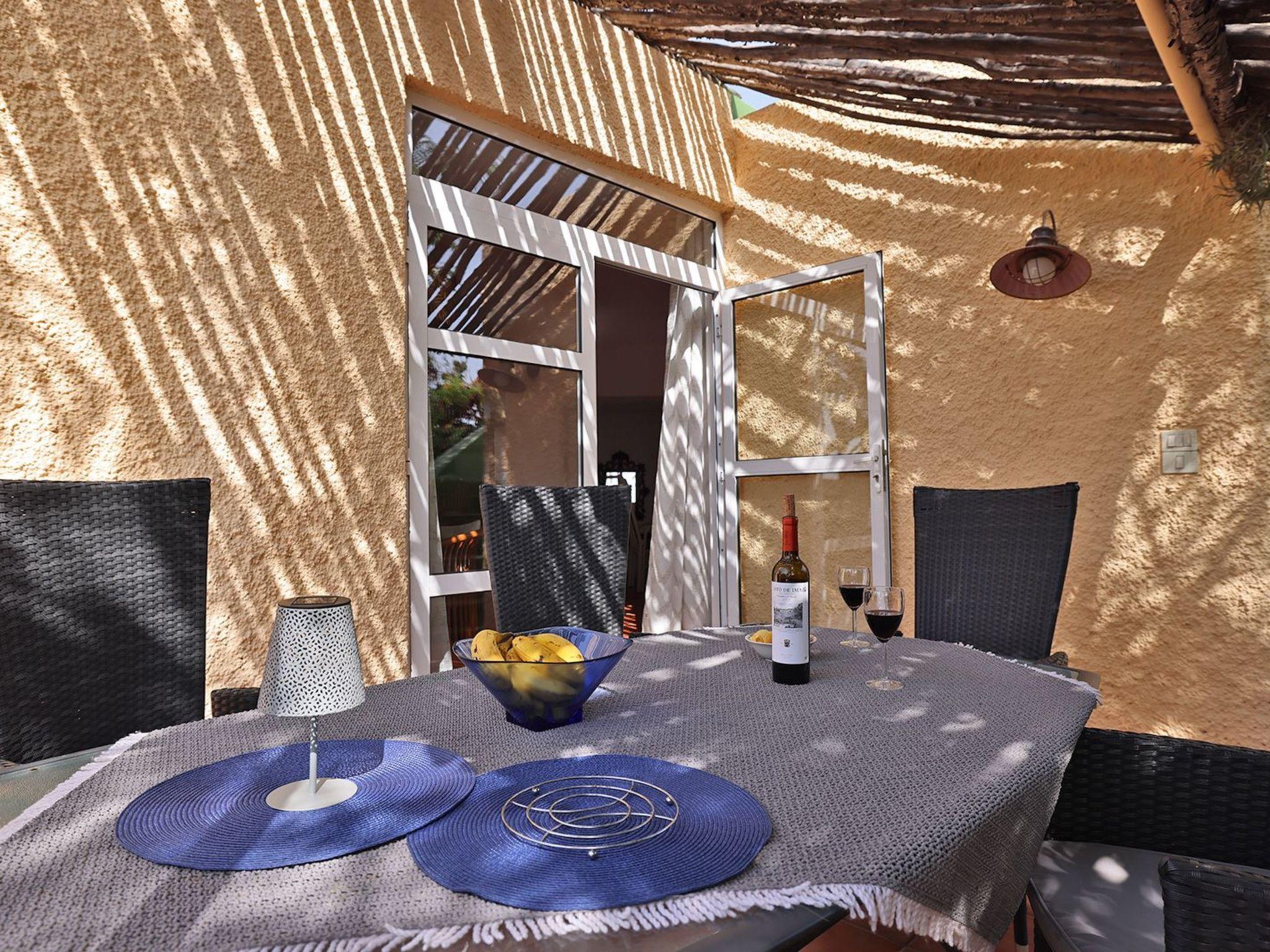 The bungalow with its extraordinary architecture is divided into three levels, entrance area with guest toilet, 3 steps to the living area with dining area, kitchen separated with a bar to the living area and fireplace room with German satellite TV or Smart TV. In the upper area, separated by a connecting door, are the two bedrooms and the bathroom. The furnishings are neat and cosy with attention to detail.