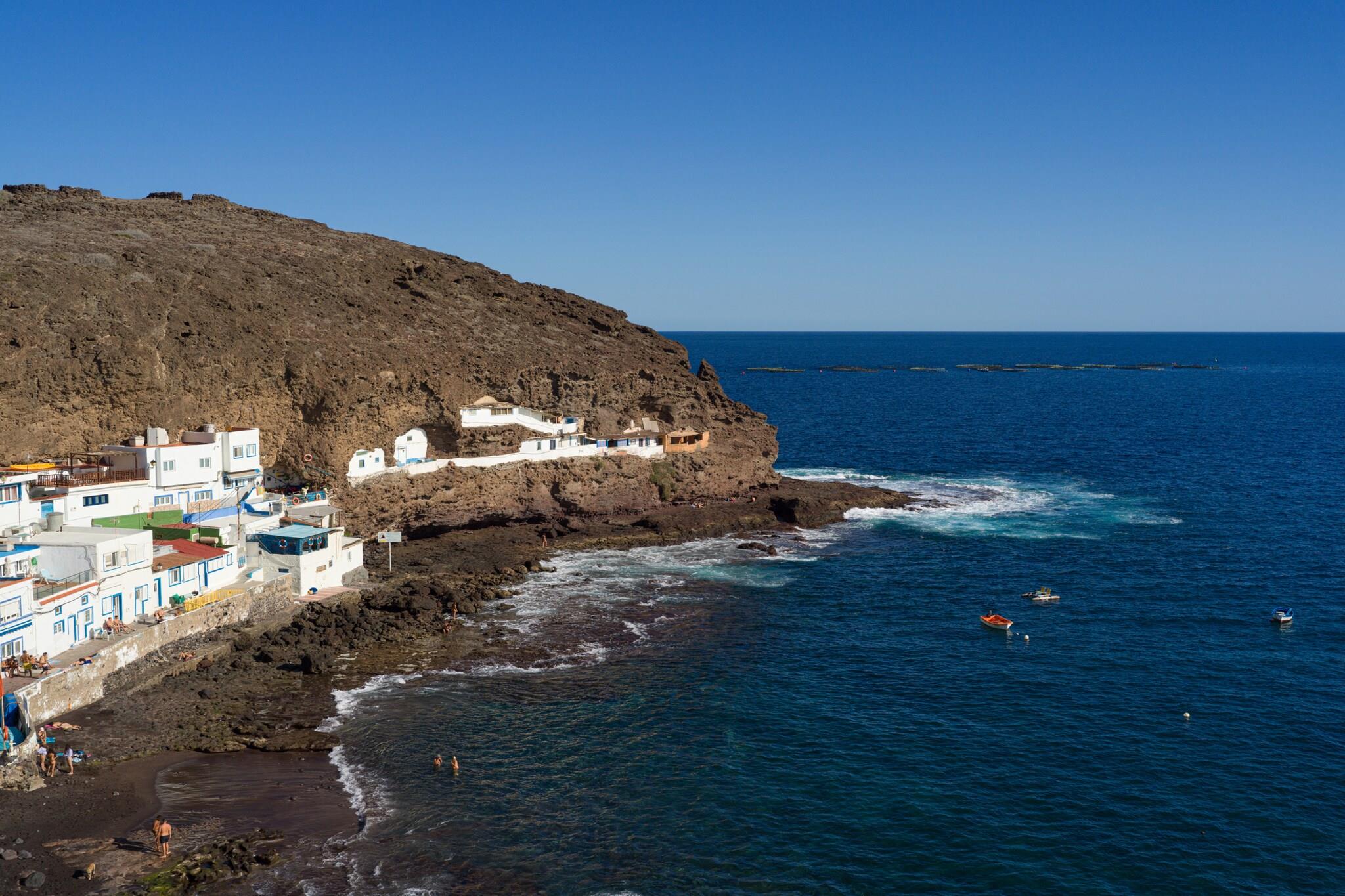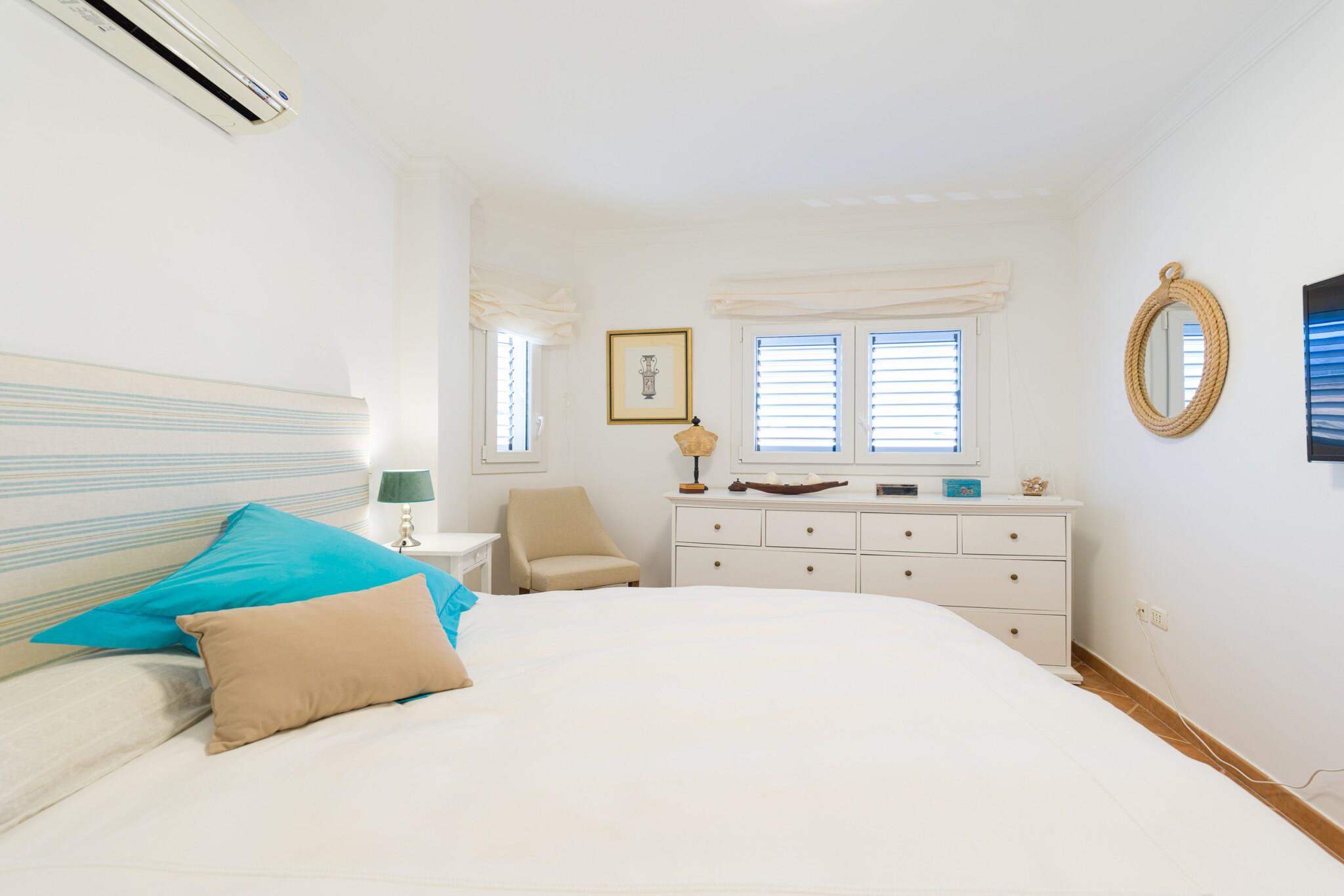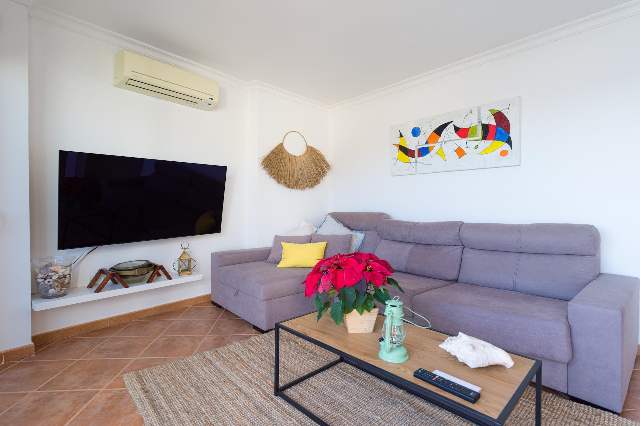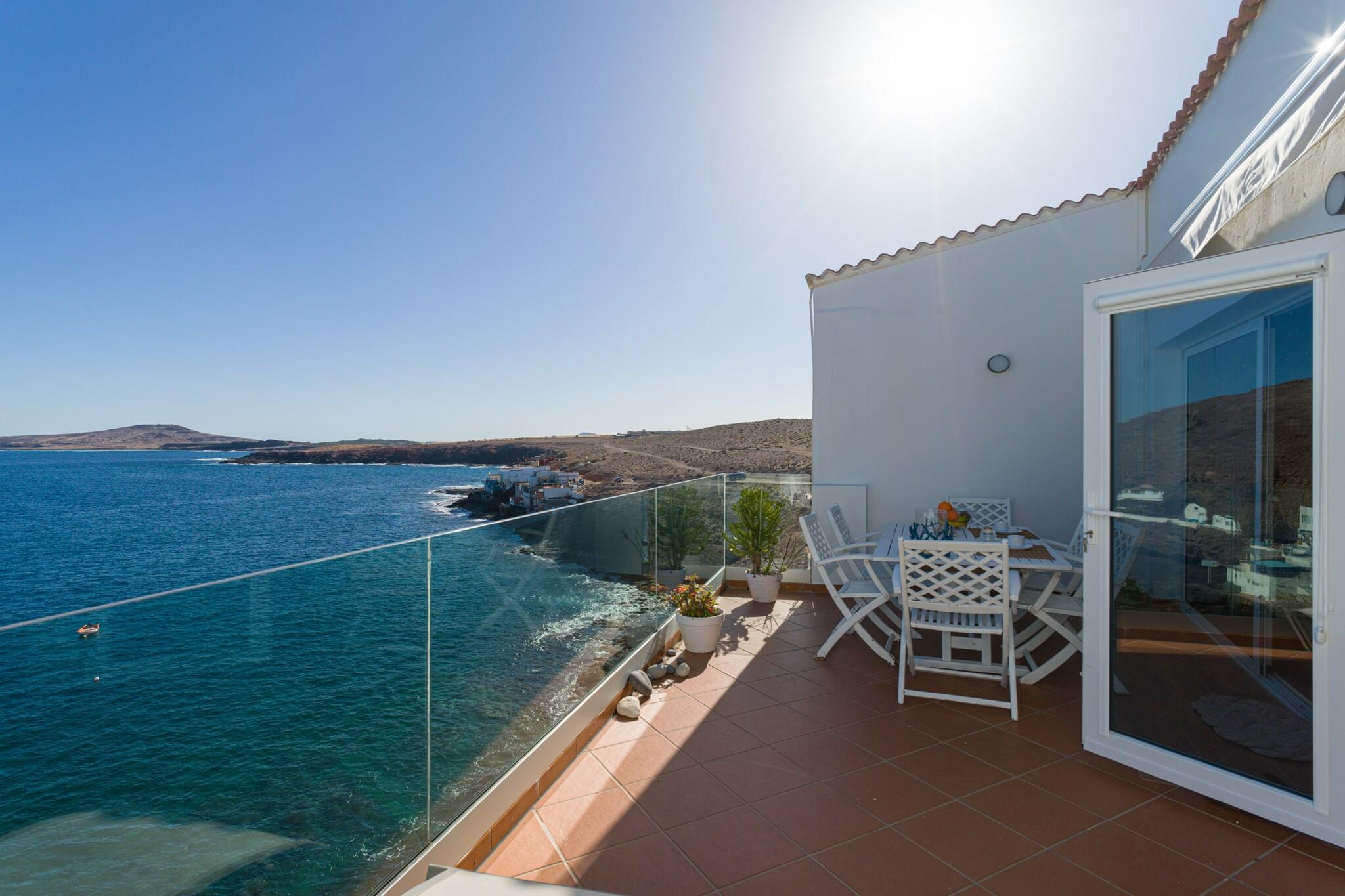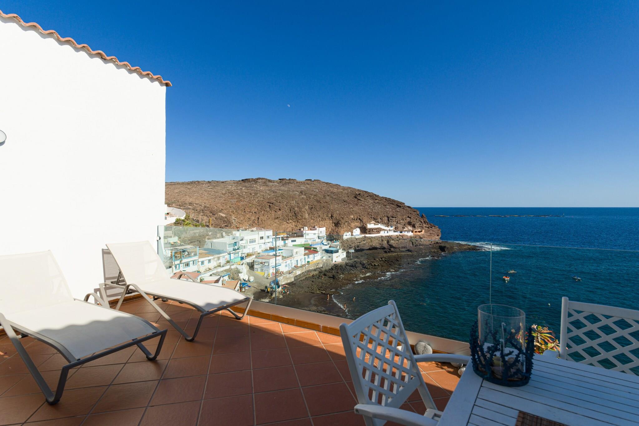 Oppdag denne rolige kystleiligheten som ligger i det beskyttede kystområdet Tufia, i Telde, Gran Canaria. Bare åtte trinn opp til første etasje tilbyr denne sjarmerende utleien uslåelig utsikt og en virkelig lokal opplevelse i et av øyas mest uberørte naturområder. Høydepunktet på eiendommen er den 14 m² store private terrassen med utsikt over stranden og Atlanterhavet – perfekt for soling, utendørs bespisning eller rett og slett å nyte den rolige atmosfæren. Med solsenger, en markise for skygge og en spiseplass, er det et idyllisk sted å nyte soloppgang eller en fredelig ettermiddagsbris. Innvendig er stuen lys og innbydende med store vinduer, en komfortabel sjeselong, klimaanlegg og en 43" Smart TV. Den marineinspirerte innredningen hyller områdets fiskearv. Kjøkkenet med åpen planløsning er fullt utstyrt med stekeovn, oppvaskmaskin, kjøleskap med fryser og andre hvitevarer, alt supplert med panoramautsikt over havet. Hovedsoverommet har king-size-seng, Smart-TV, klimaanlegg og oppbevaring, mens det andre soverommet – med utsikt over fjellene – har et arbeidsområde for fjernarbeid. Det moderne badet har dusjkabinett, bidet, hårføner og gjennomtenkte tilleggsutstyr som et førstehjelpsutstyr. Ytterligere fasiliteter inkluderer et separat vaskerom med vaskemaskin, tørketrommel, strandutstyr og en kjøleboks. Parkering er praktisk tilgjengelig rett utenfor. Tufia er omgitt av naturlig skjønnhet og er ideell for de som søker rolige fluktsteder, uberørt vann og autentisk lokal sjarm. Utforsk nærliggende Aguadulce-stranden, arkeologiske steder, eller nyt utendørsaktiviteter som fotturer, dykking og sykling. Dette er det perfekte tilfluktsstedet for naturelskere og oppmerksomme reisende.