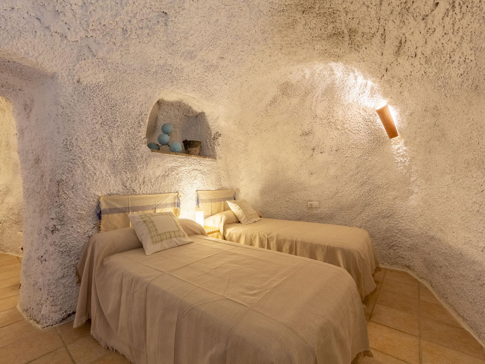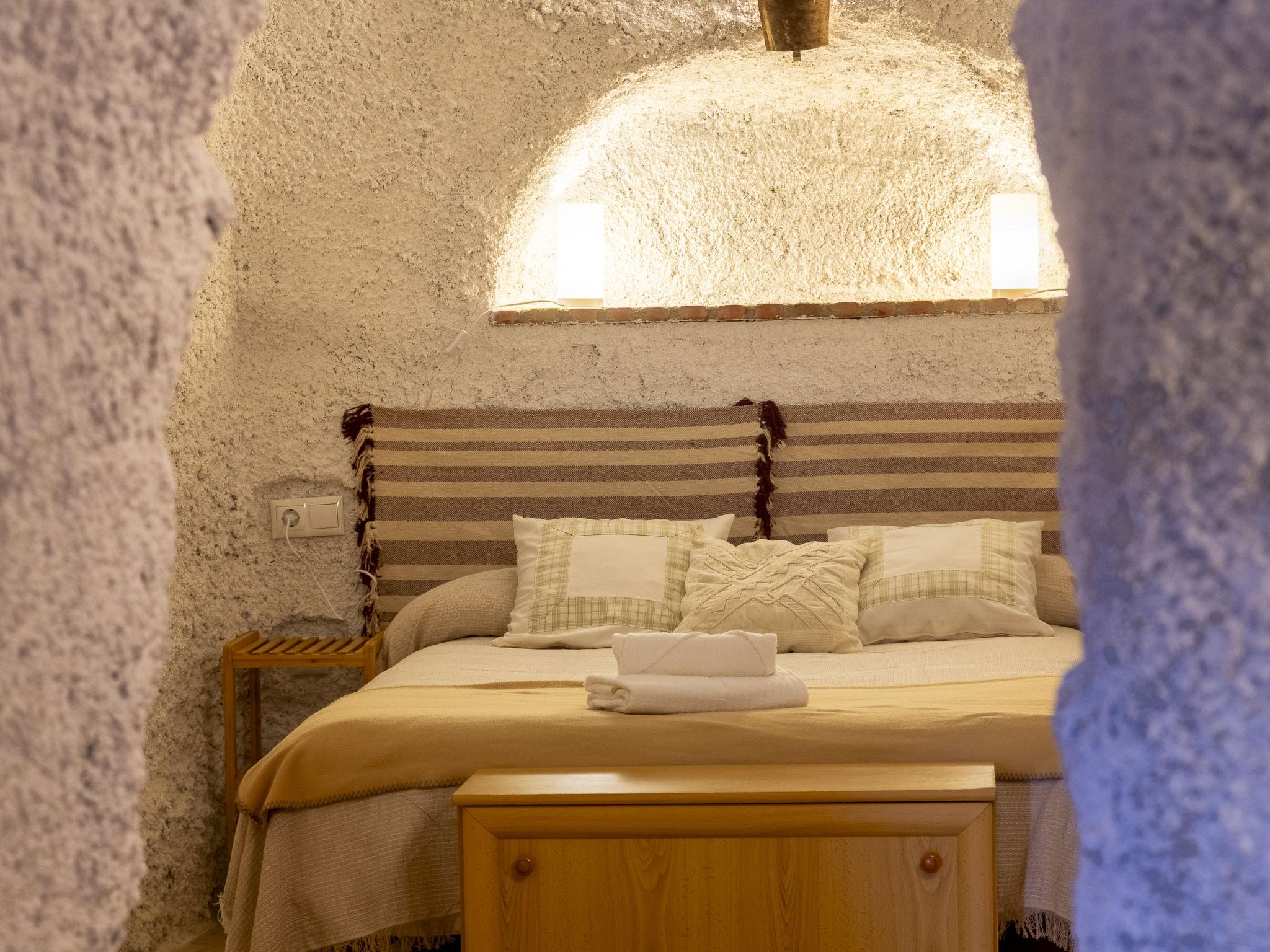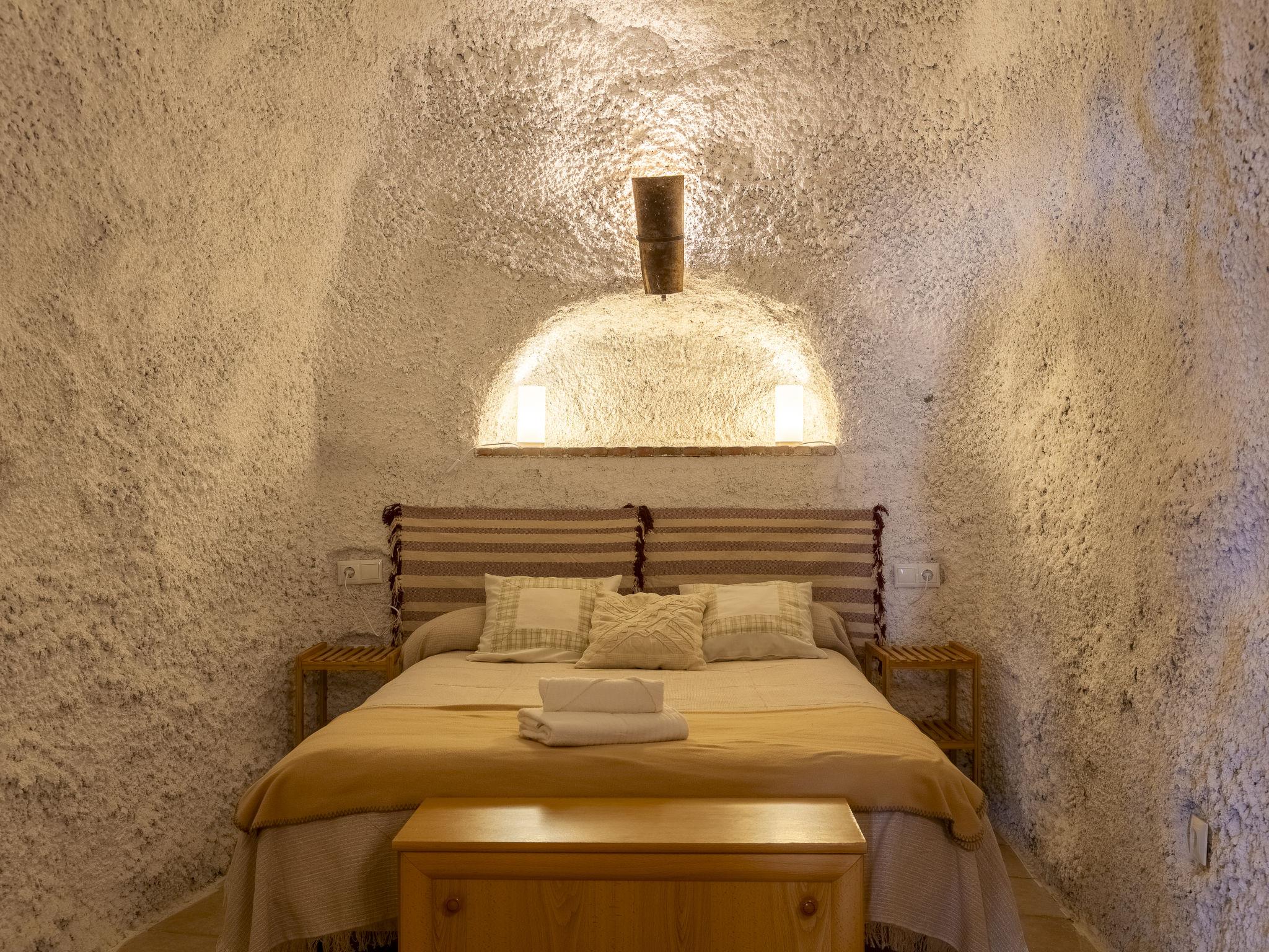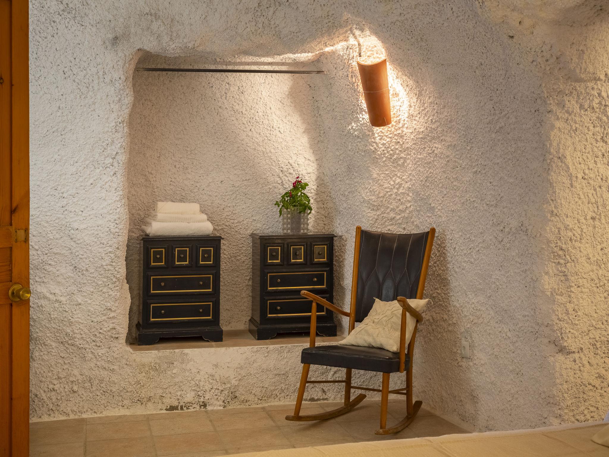 "Cueva Mariana Pineda", 3-room house 70 m2. Living/dining room with dining table, digital TV, flat screen and heating stove. 1 room with 2 beds (90 cm, length 190 cm). 1 room with 1 french bed (150 cm, length 190 cm). Kitchen (4 ceramic glass hob hotplates, toaster, microwave, freezer, electric coffee machine). Shower/bidet/WC. Wood heating. Terrace. Terrace furniture. Facilities: washing machine, iron, children's high chair, baby cot for up to 2 year olds, hair dryer. Internet (WiFi, free). Please note: non-smokers only. VTAR/AL/01159 // Reg. Nr.: ESFCTU000004003000388815000000000000000VTAR/AL/011592