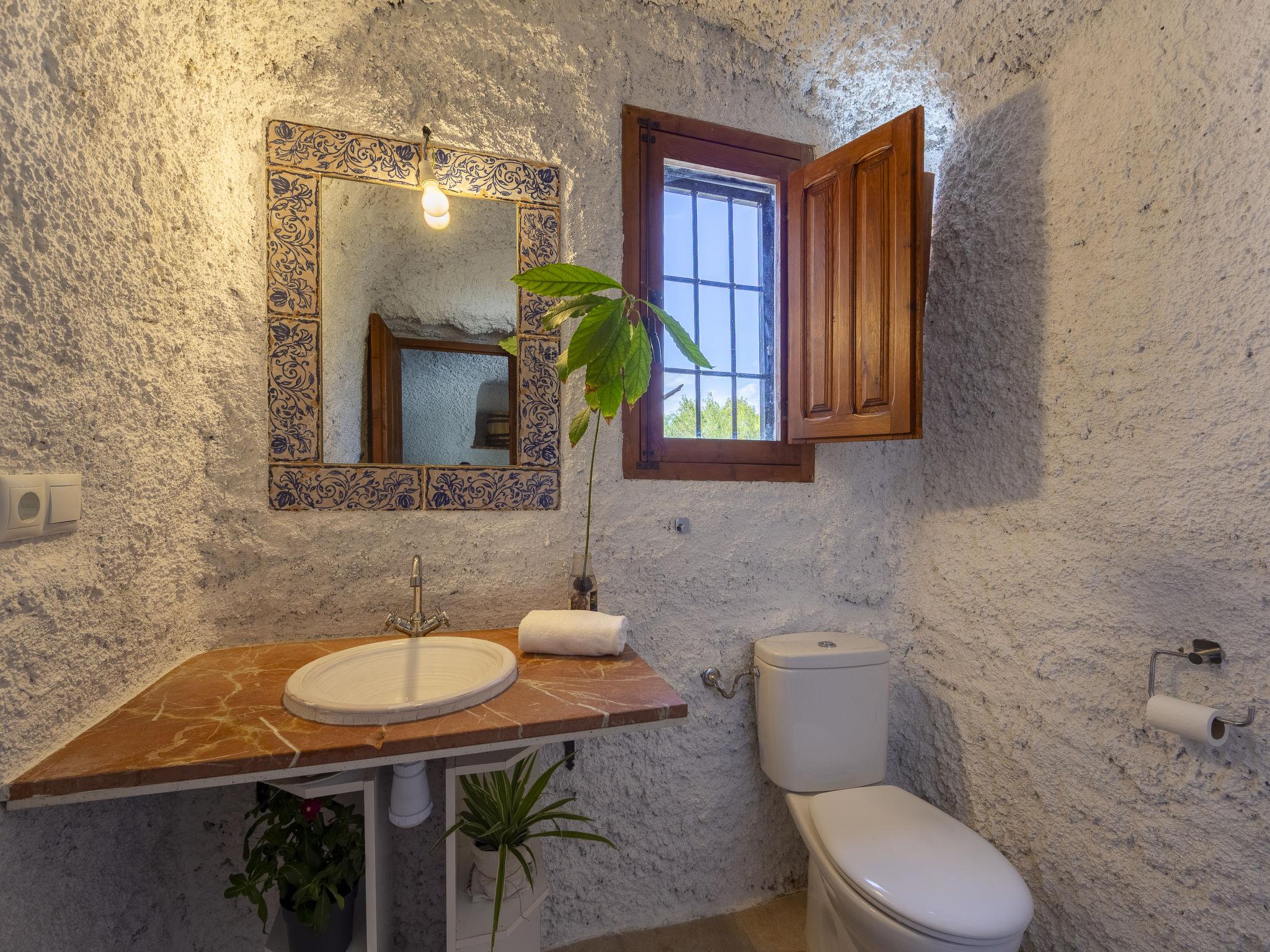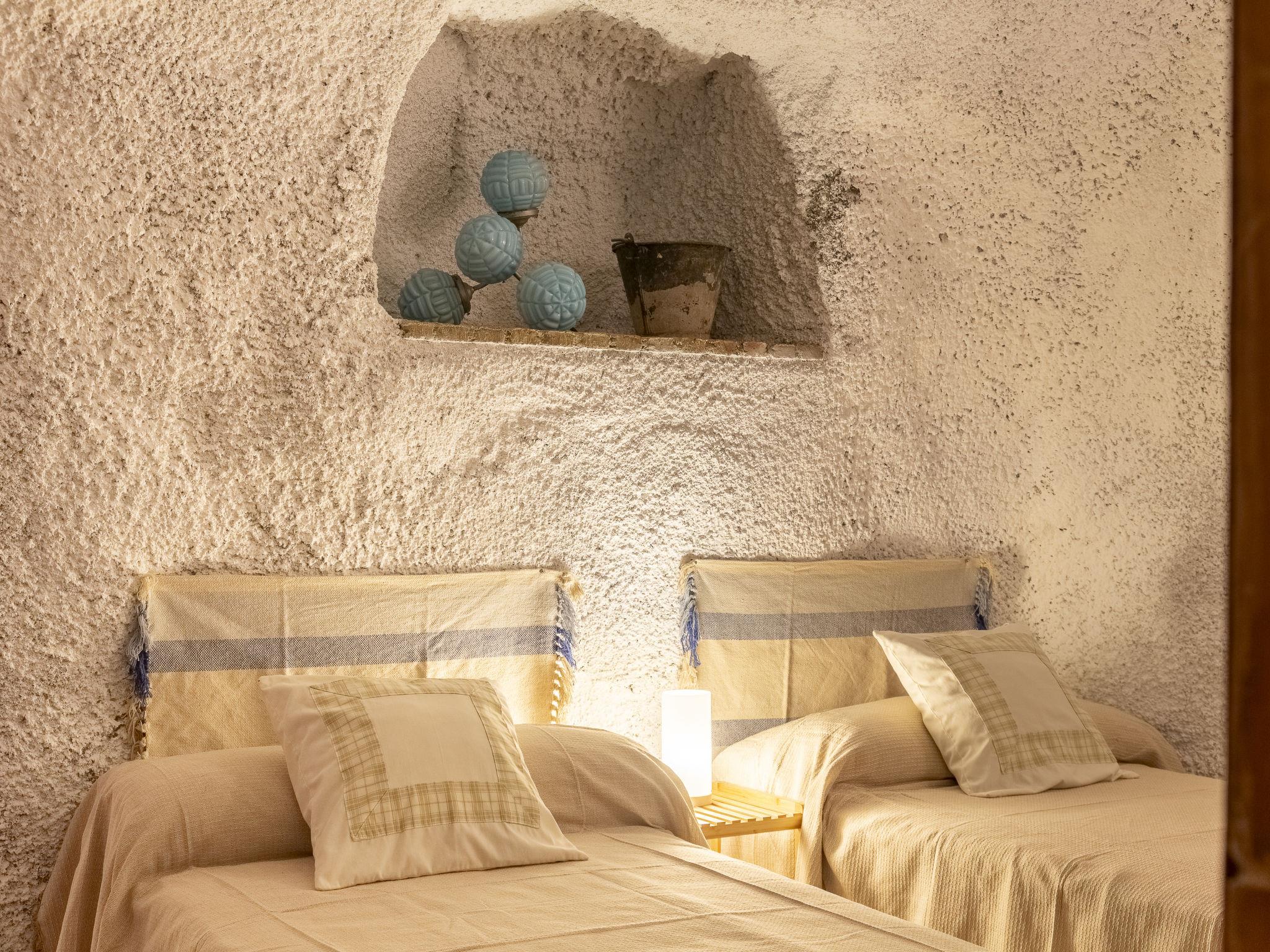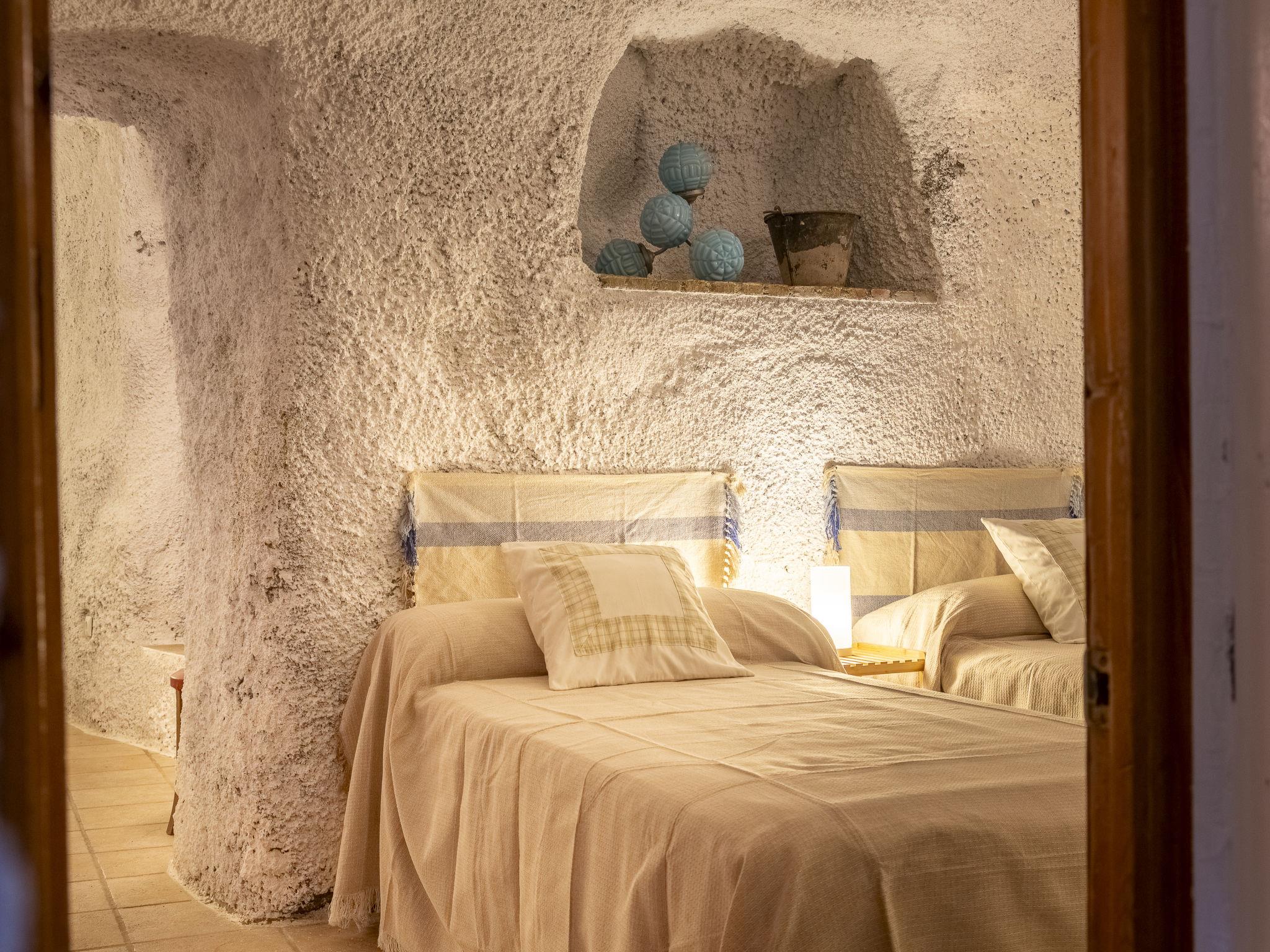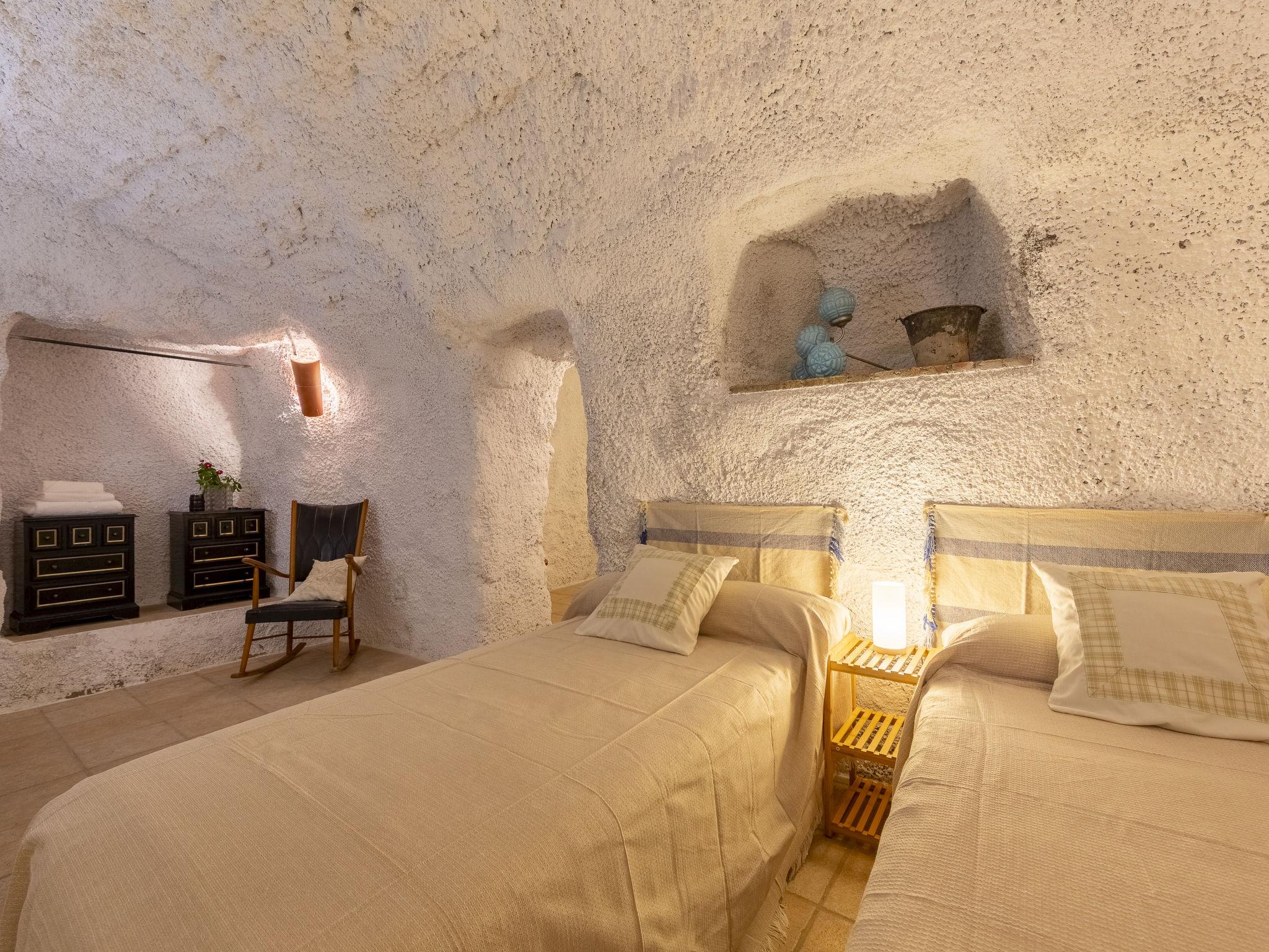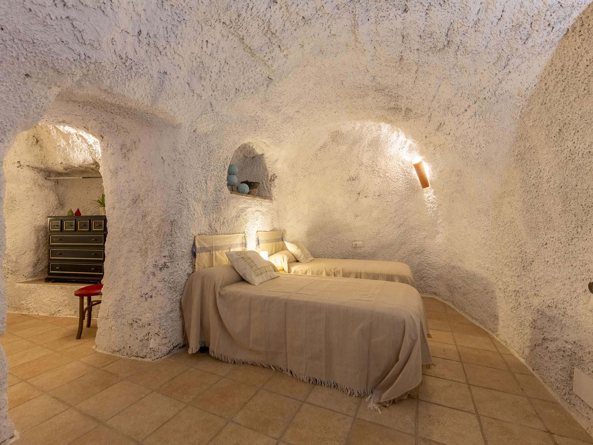 "Cueva Mariana Pineda", 3-room house 70 m2. Living/dining room with dining table, digital TV, flat screen and heating stove. 1 room with 2 beds (90 cm, length 190 cm). 1 room with 1 french bed (150 cm, length 190 cm). Kitchen (4 ceramic glass hob hotplates, toaster, microwave, freezer, electric coffee machine). Shower/bidet/WC. Wood heating. Terrace. Terrace furniture. Facilities: washing machine, iron, children's high chair, baby cot for up to 2 year olds, hair dryer. Internet (WiFi, free). Please note: non-smokers only. VTAR/AL/01159 // Reg. Nr.: ESFCTU000004003000388815000000000000000VTAR/AL/011592