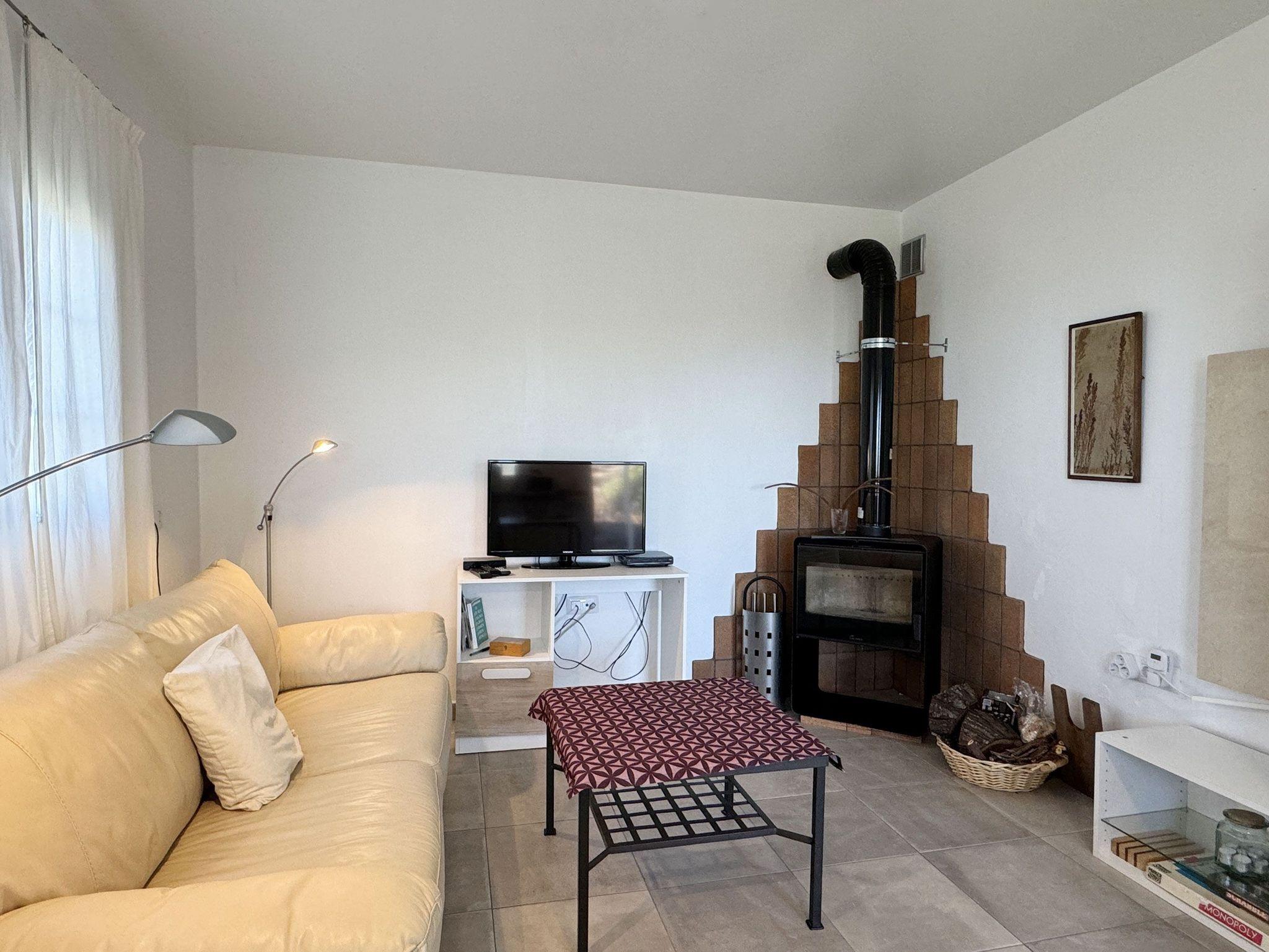 Den Mittelpunkt des Hauses bildet der Wohnraum mit Küchenzeile, kleinem Esstisch , einem großen Sofa, SAT TV sowie einer Römer Heizung. Ein gemütlicher Holzofen mit Sichtfenster sorgt für behagliche Abende. Kaminholz wird gestellt.