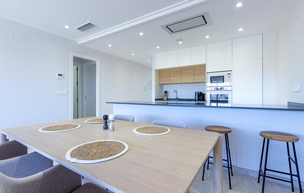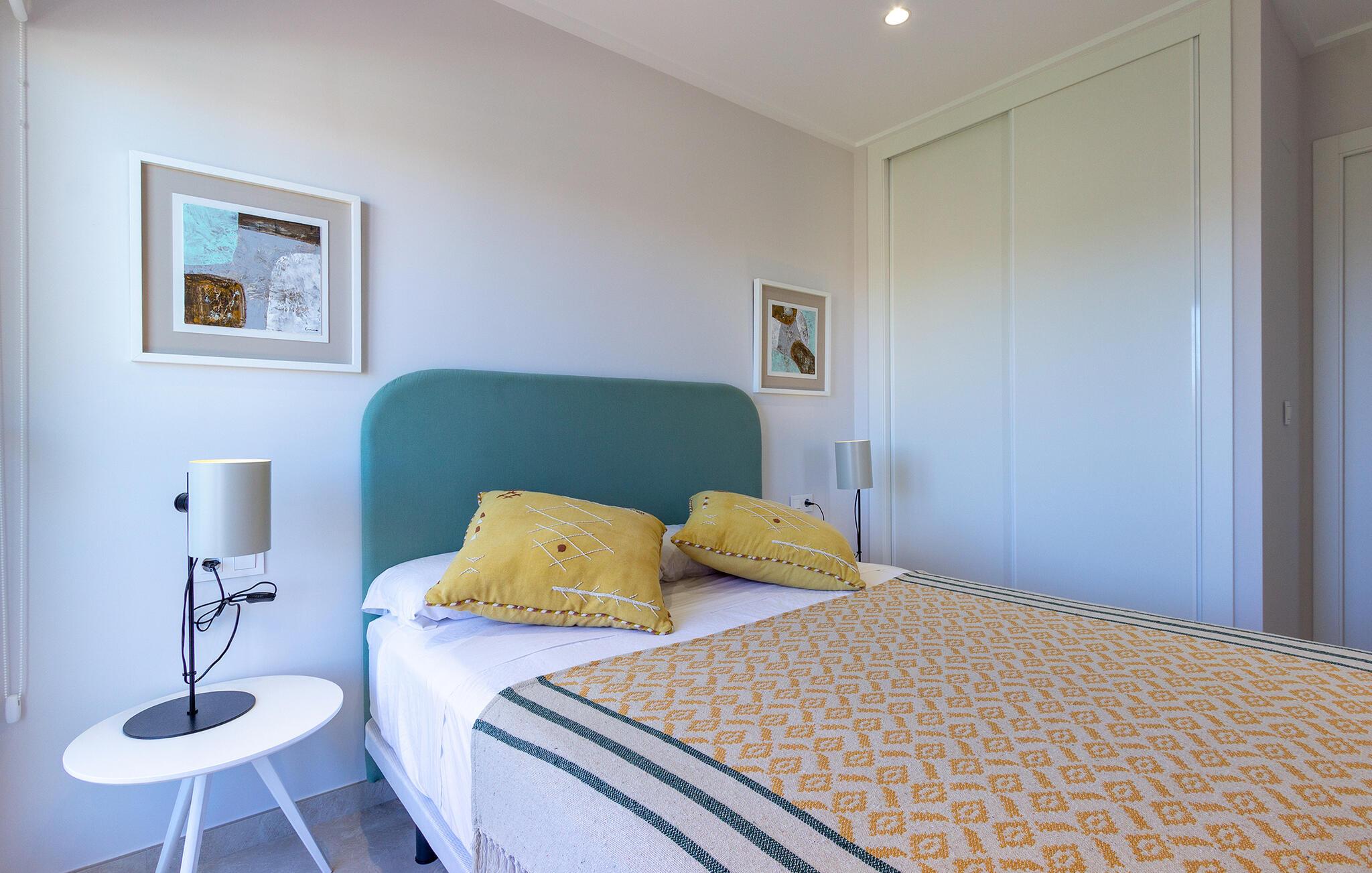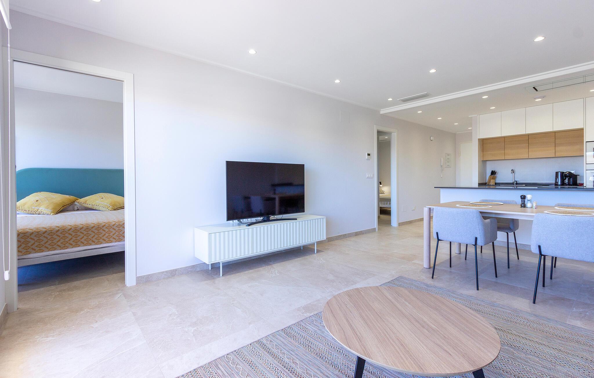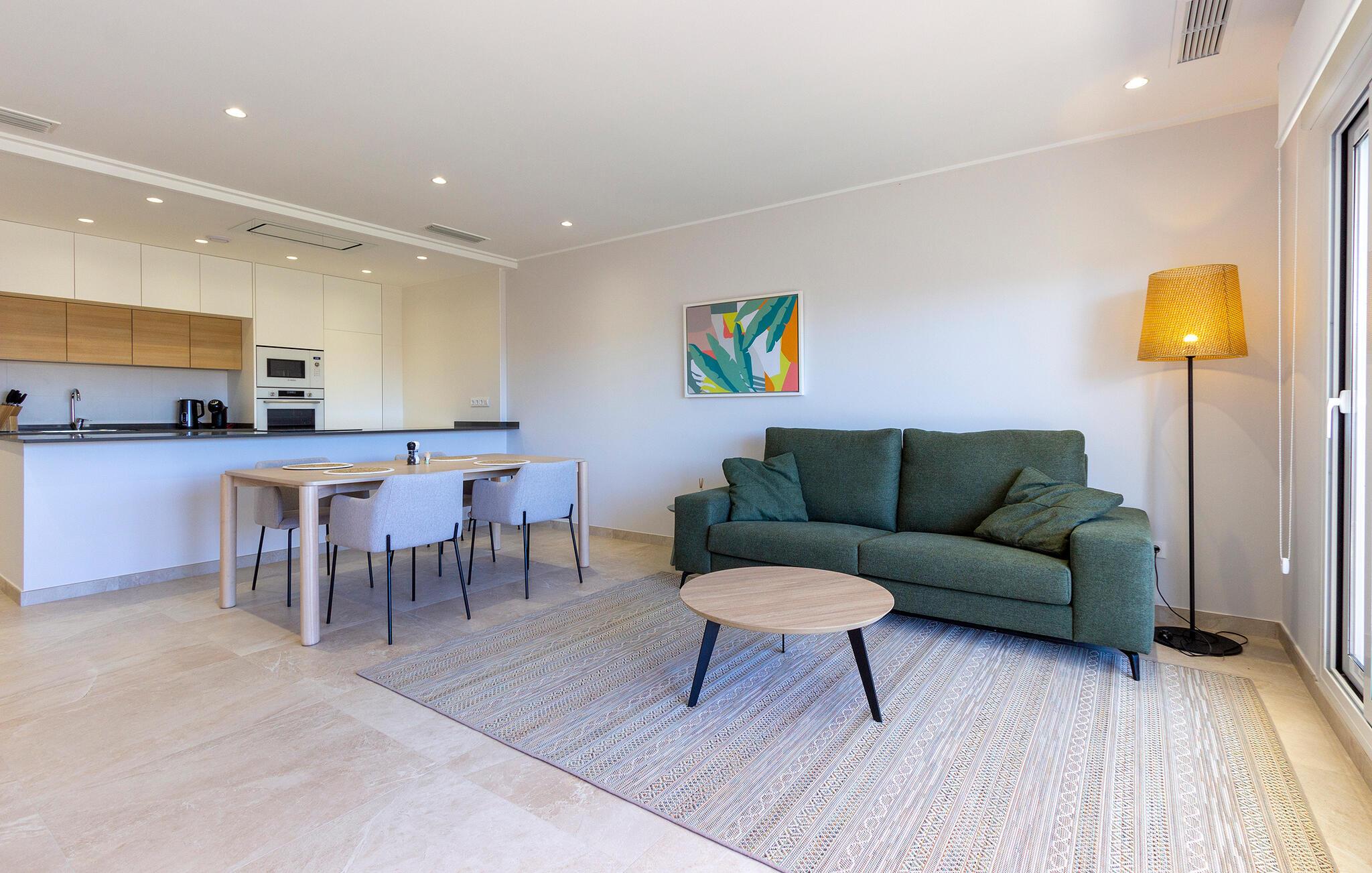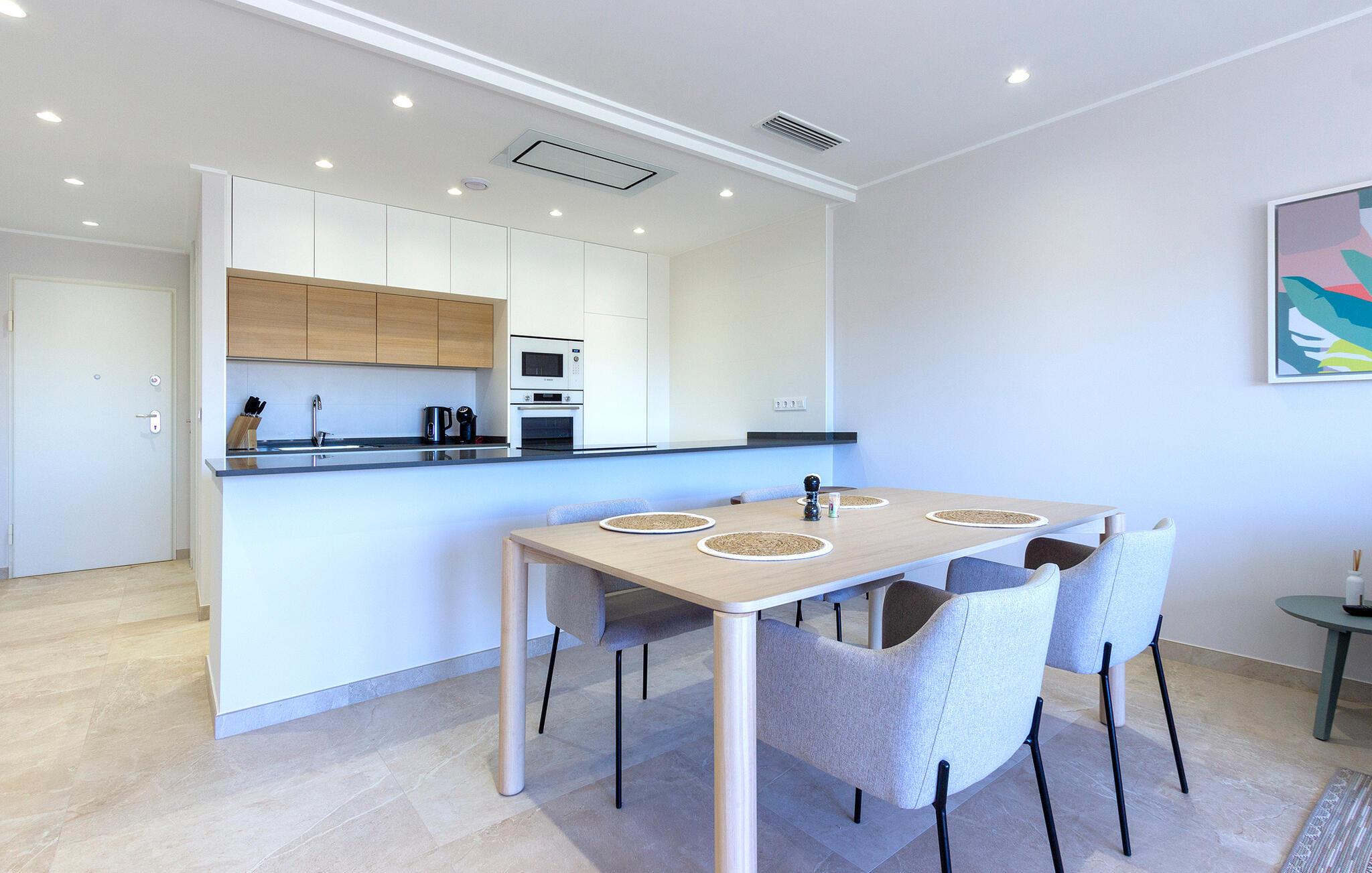 Den lyse og moderne ferieleiligheten med topp innredning innbyr til avslapping. Innvendig danner varme fargedetaljer en harmonisk kontrast til det hvite og skaper en hyggelig atmosfære der du vil føle deg hjemme. Tilbered deilige måltider sammen og nyt dem på balkongen. Hvis du foretrekker korte avstander, kan du tidlig om morgenen forfriske deg i det felles bassenget og ta de første dukkertene. Litt senere kan du raskt komme deg til sandstranden til fots.
