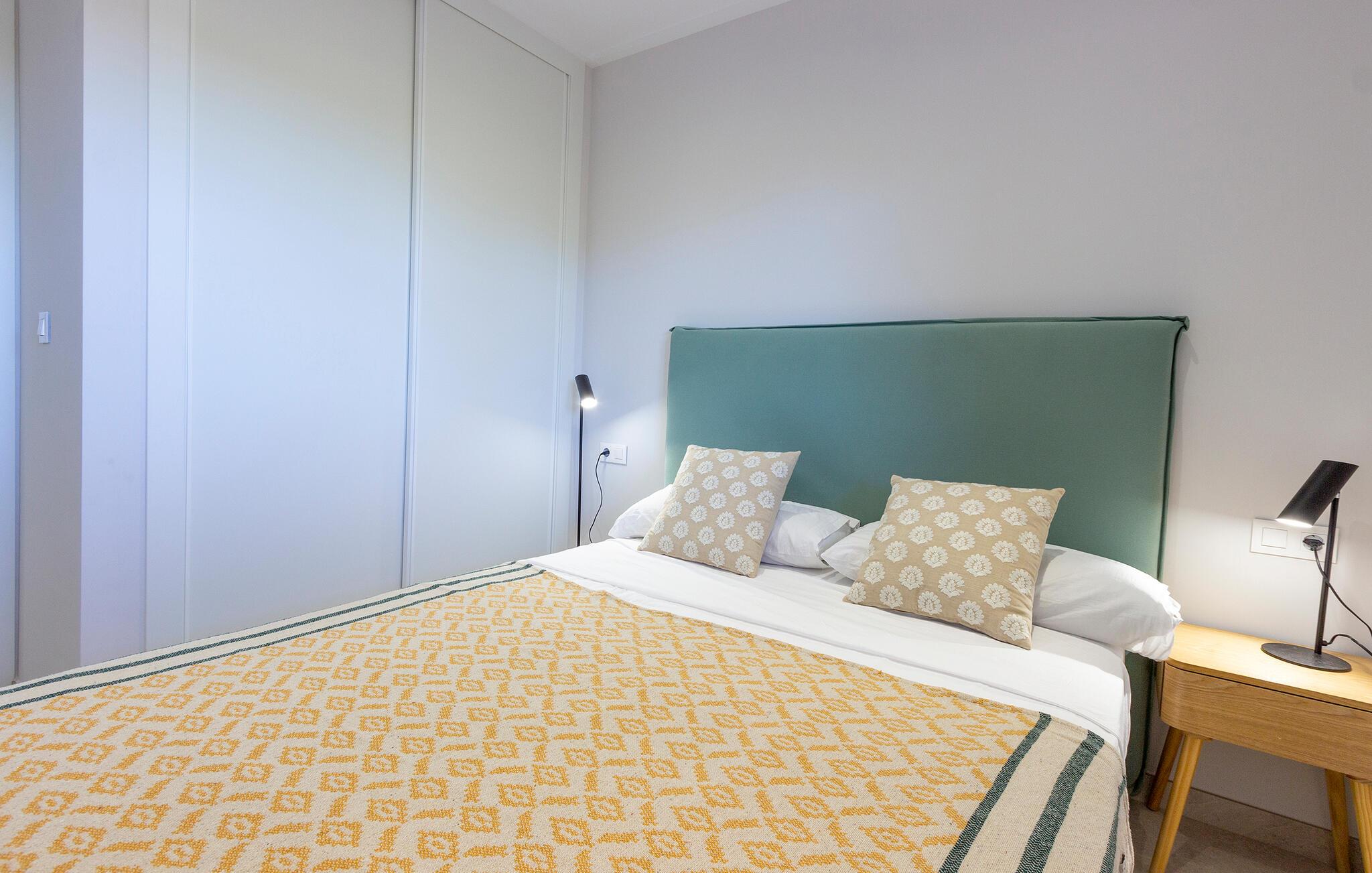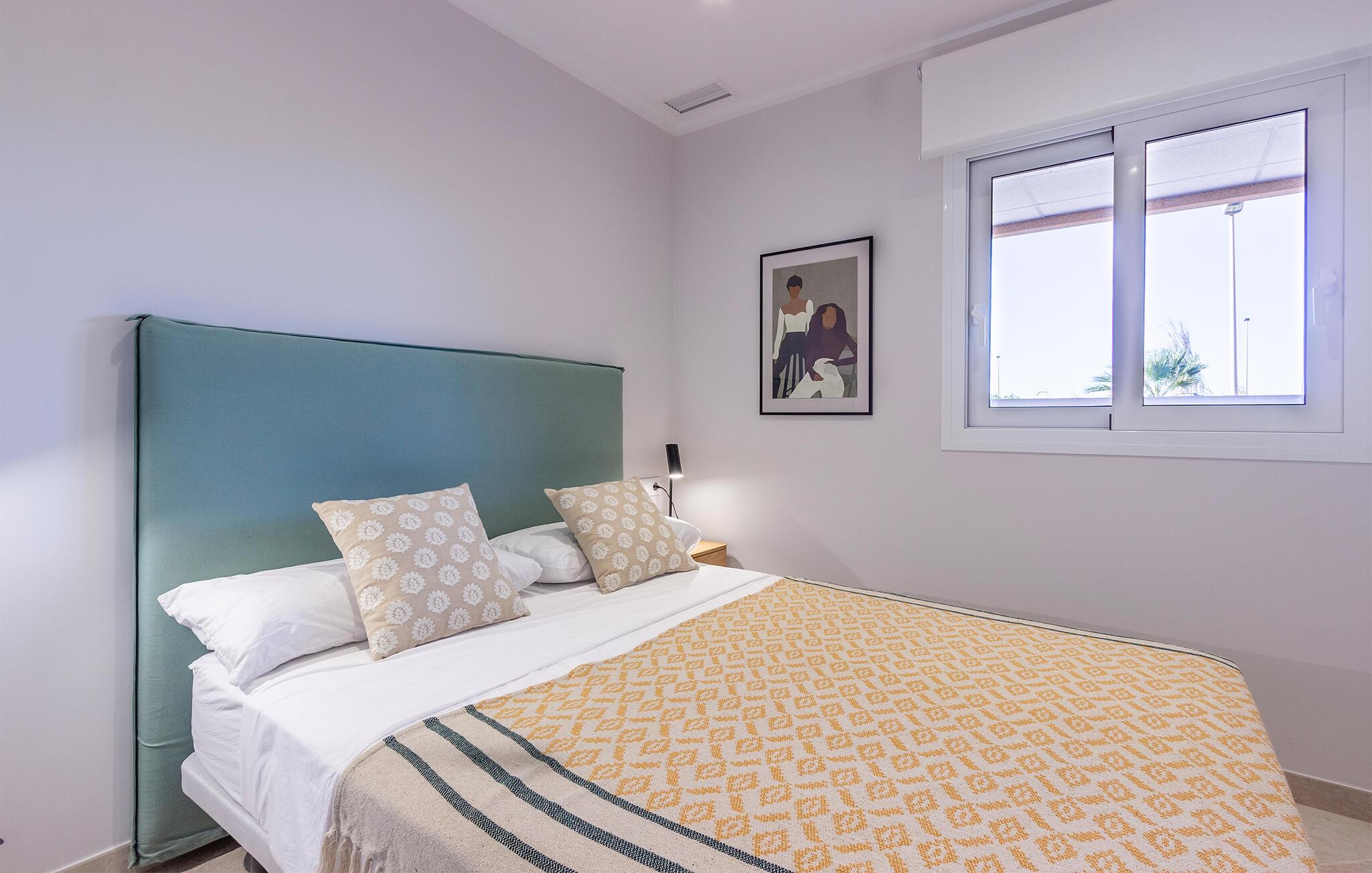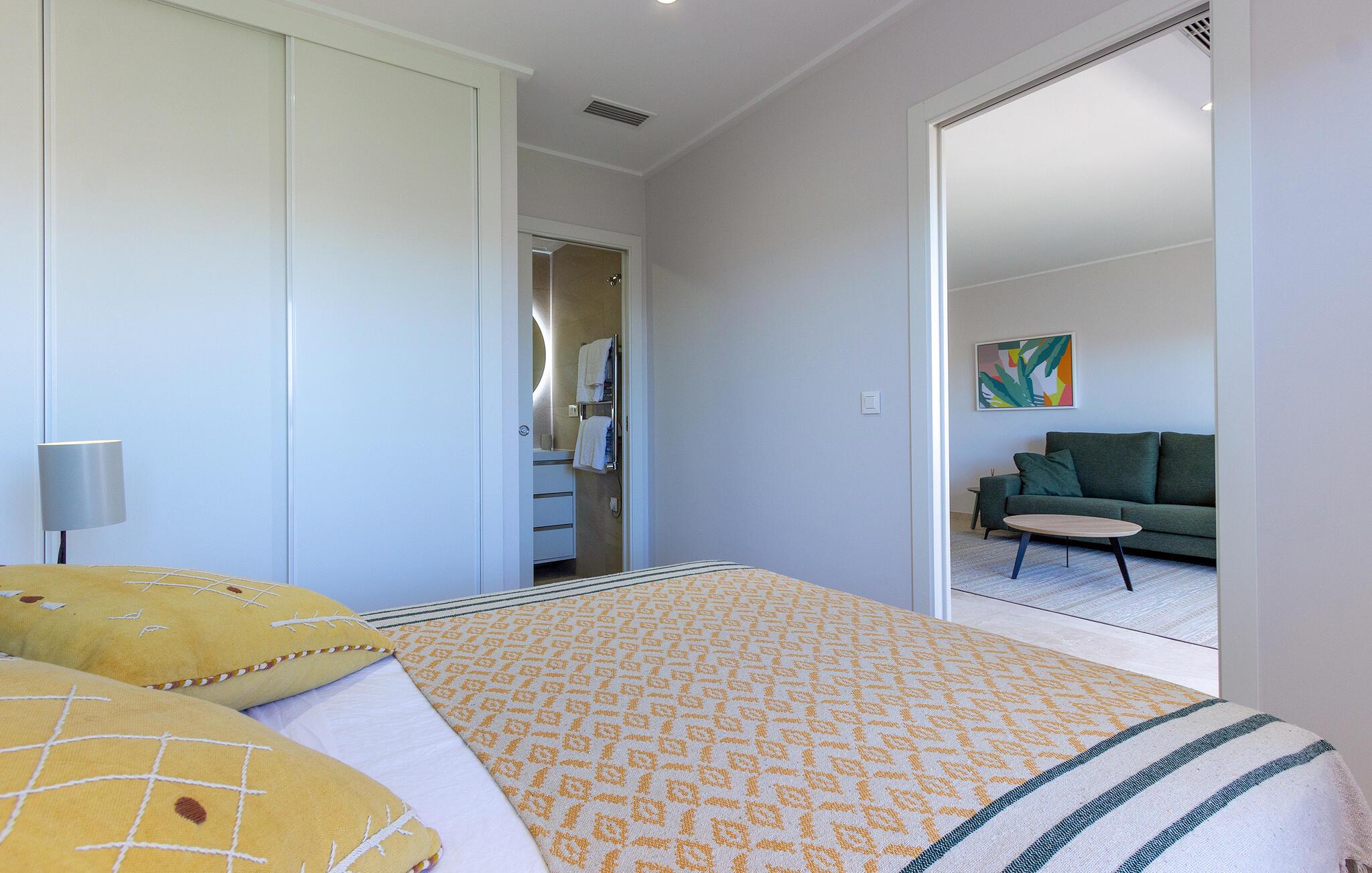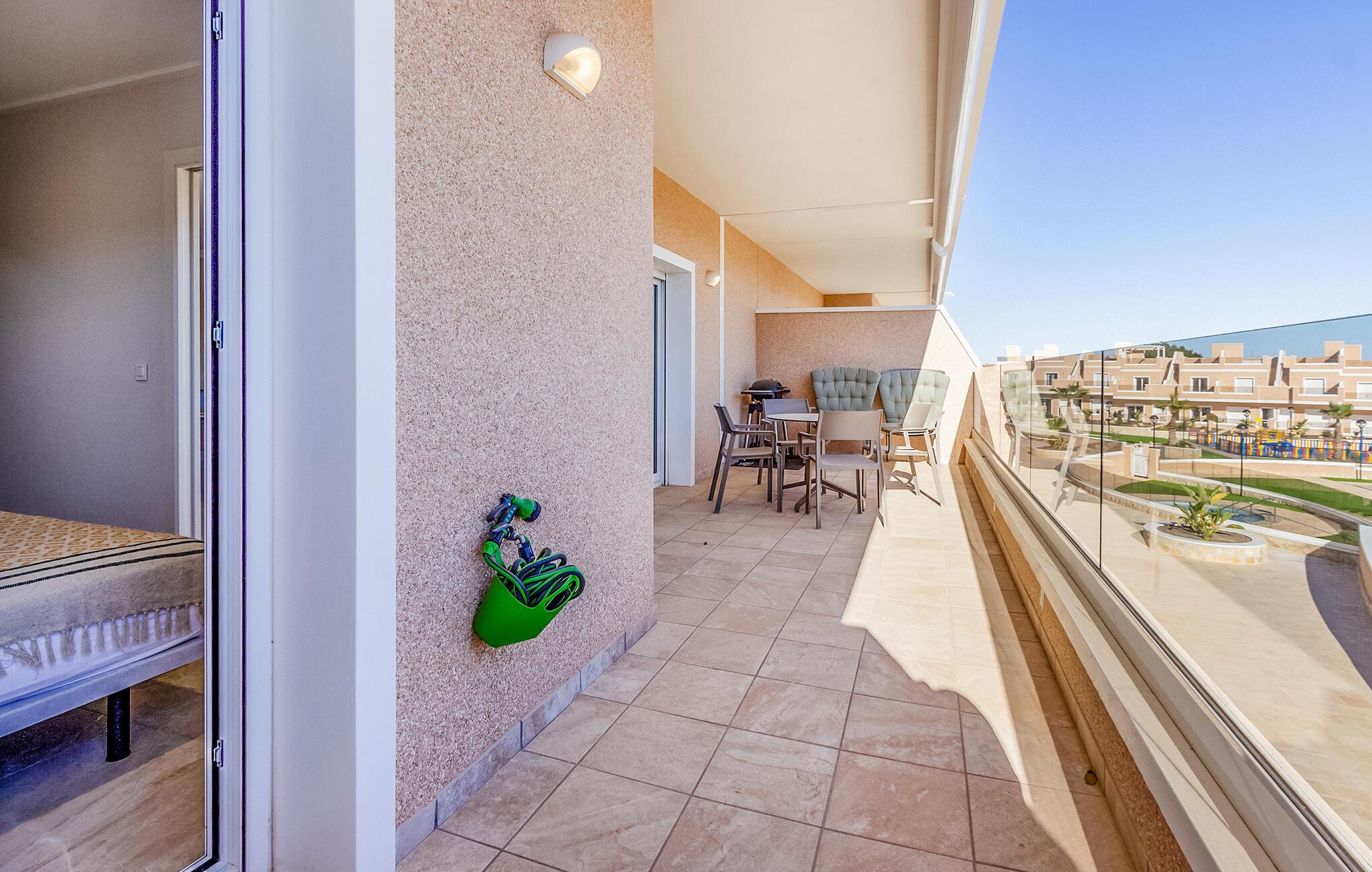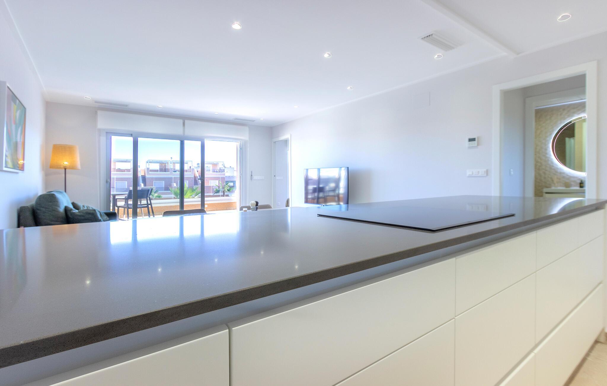 Den lyse og moderne ferieleiligheten med topp innredning innbyr til avslapping. Innvendig danner varme fargedetaljer en harmonisk kontrast til det hvite og skaper en hyggelig atmosfære der du vil føle deg hjemme. Tilbered deilige måltider sammen og nyt dem på balkongen. Hvis du foretrekker korte avstander, kan du tidlig om morgenen forfriske deg i det felles bassenget og ta de første dukkertene. Litt senere kan du raskt komme deg til sandstranden til fots.