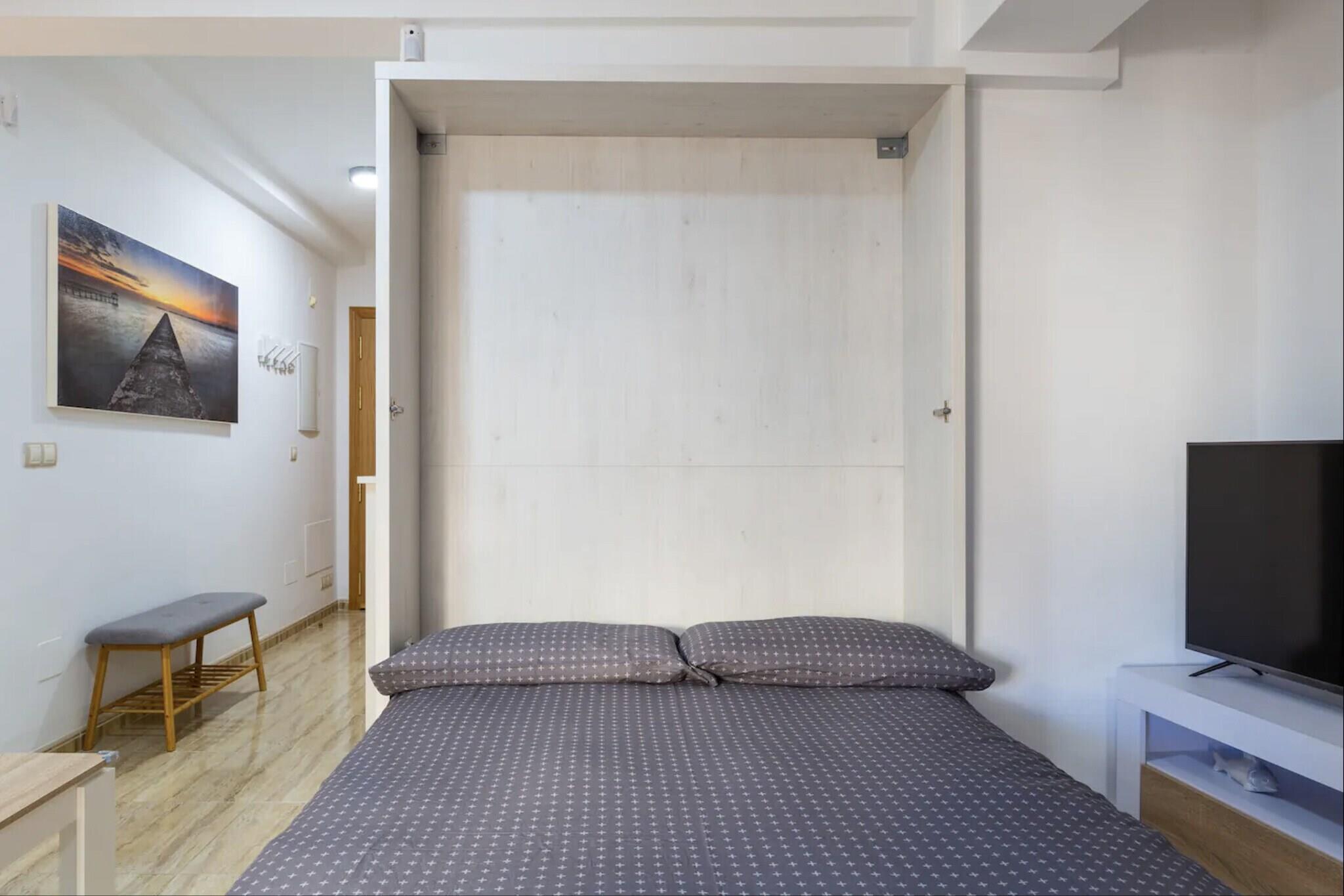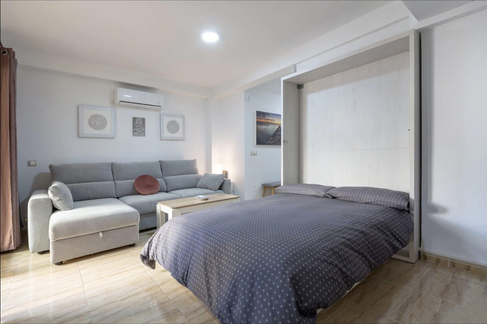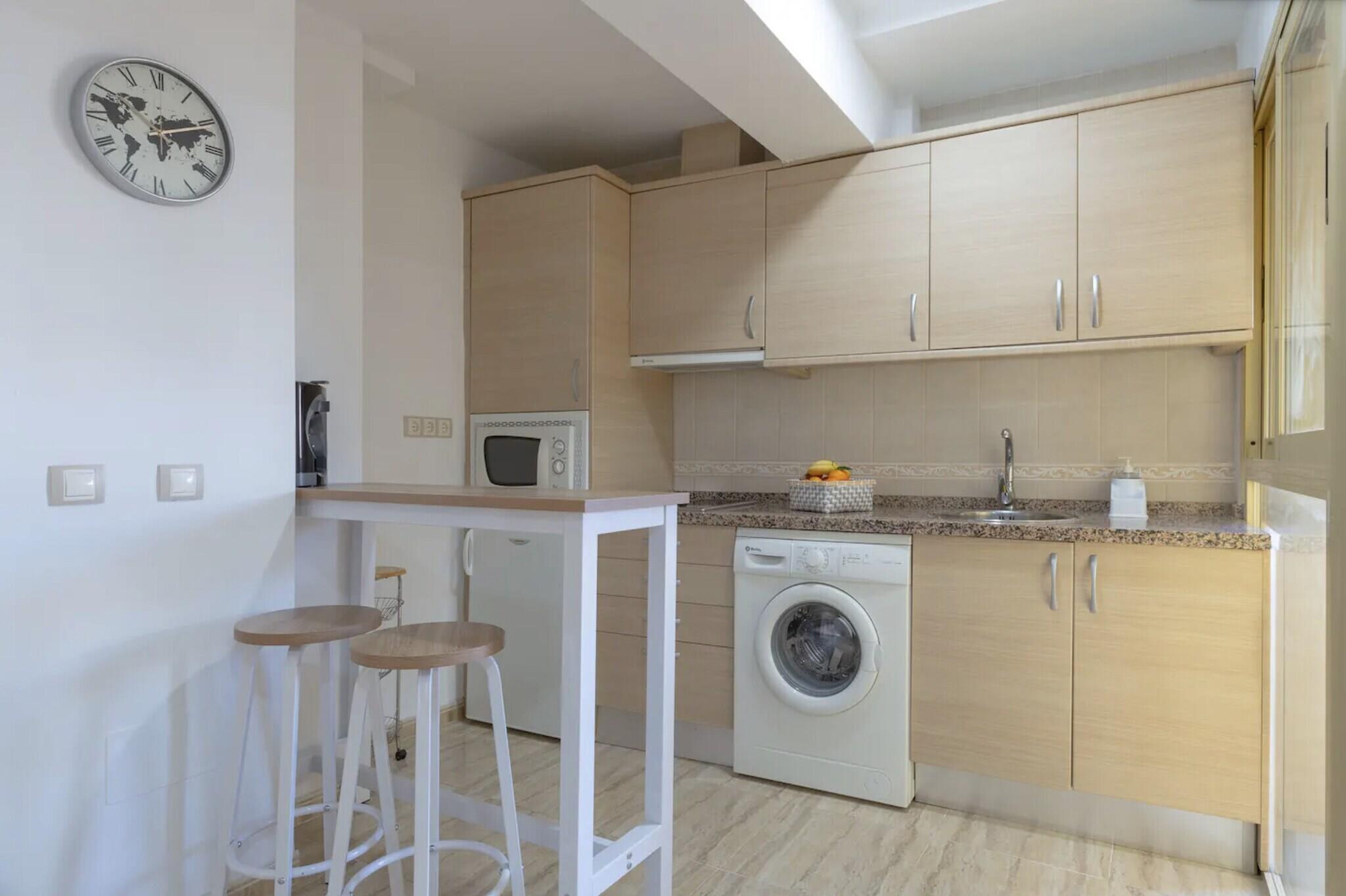 Dette sjarmerende feriehuset er ideelt for par. Dette velutstyrte strandhuset tilbyr et koselig soverom med dobbeltseng og plass til opptil to gjester. Dyreelskere vil bli glade for å vite at eiendommen er kjæledyrvennlig, noe som gjør den til et passende valg for de som reiser med sine pelskledde venner. Stuen har en komfortabel sofa, perfekt for avslappende kvelder. Gjestene kan også nyte frisk luft og sjøbris fra en privat balkong. Mens de bor her, er besøkende velkomne til å dra nytte av gratis tilgang til det felles svømmebassenget, noe som gir et ekstra element av avslapning. Feriehuset ligger bare 59 meter fra Playa de la Carihuela og en kort spasertur fra Playa de Bajondillo, og er omgitt av noen av Torremolinos' beste kyststeder. Det ligger nær det travle bylivet, med Calle San Miguel bare 1 km unna, som tilbyr et utvalg av kafeer, restauranter og butikker. Daglige behov dekkes enkelt med nærliggende supermarkeder som Carrefour Express og Mercadona. Praktiske transportmuligheter inkluderer Renfe Cercanías togstasjon 950 meter unna, Torremolinos busstasjon 2 km unna, og Málaga-Costa del Sol internasjonale lufthavn bare 8 km fra eiendommen, noe som sikrer enkel tilgang for reisende. Innvendig har eiendommen et funksjonelt åpent kjøkken utstyrt med glasskeramisk koketopp, kjøleskap, mikrobølgeovn, stekeovn, fryser og alt nødvendig kjøkkenutstyr, samt kaffemaskin, brødrister og vannkoker. En vaskemaskin, strykejern og hårføner er også tilgjengelig for gjestenes bekvemmelighet.