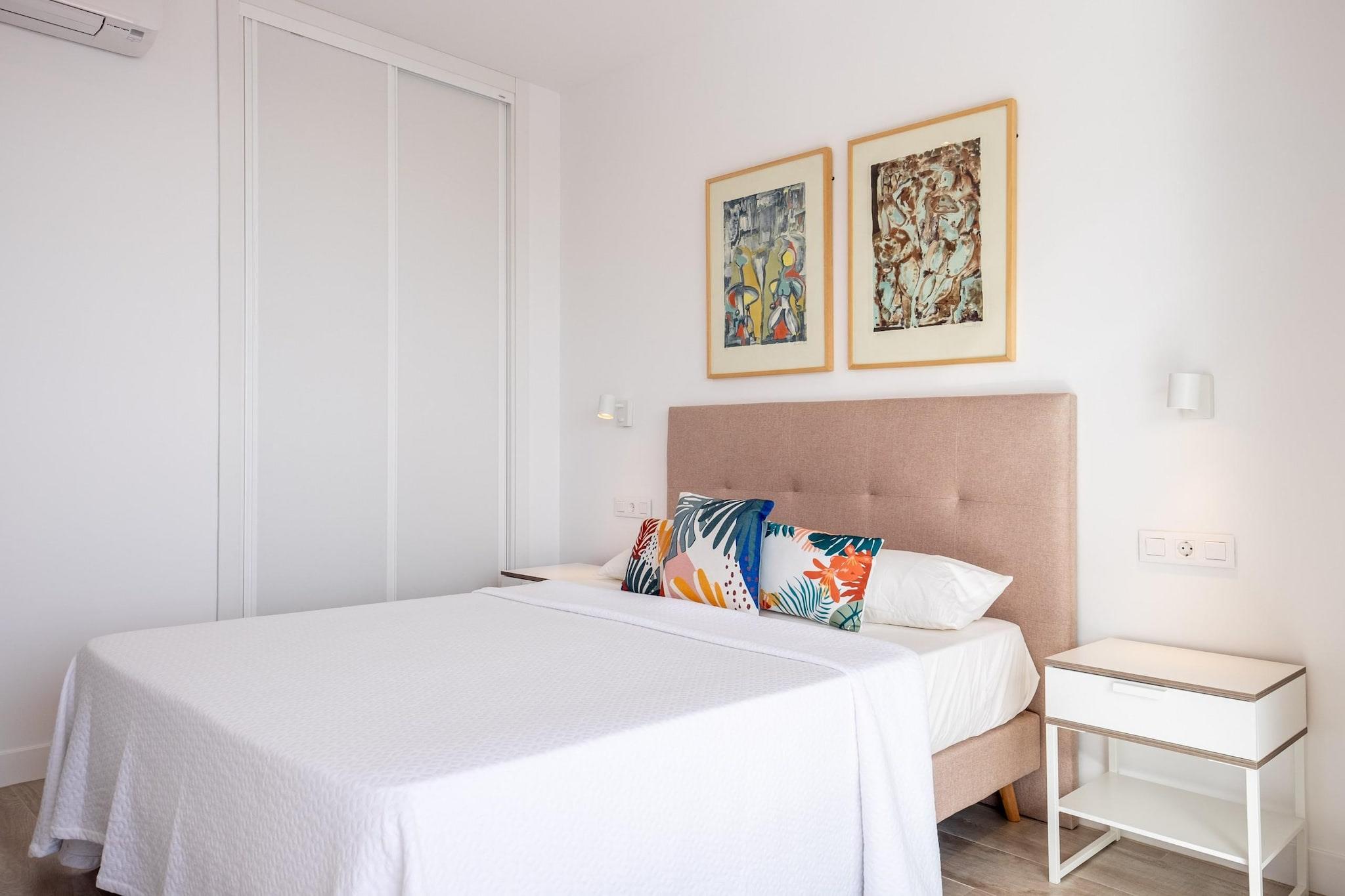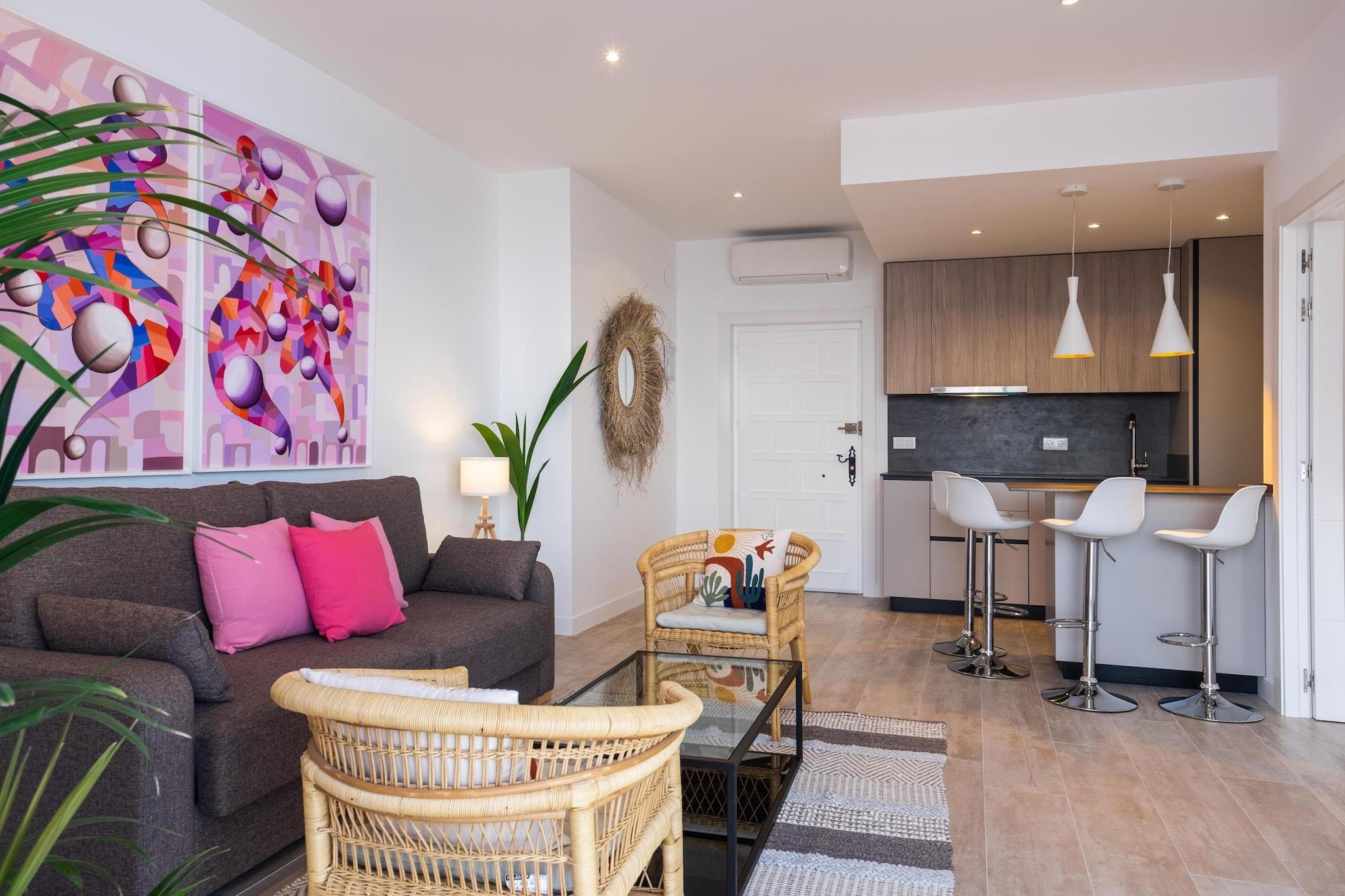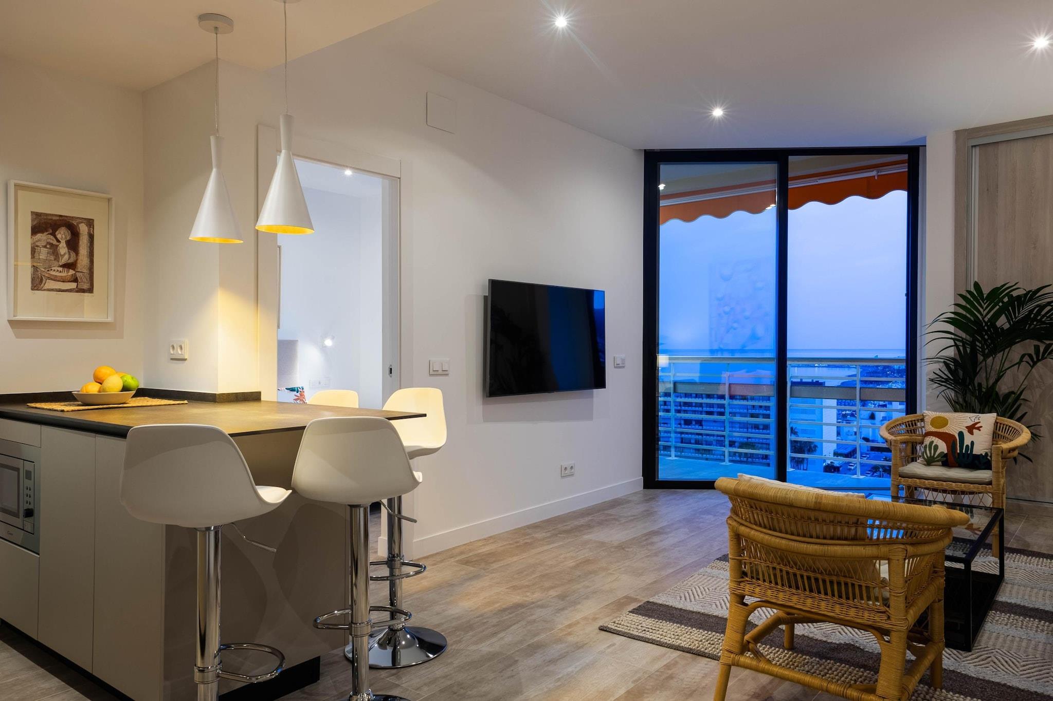Oppdag et rolig kysttilfluktssted i Torremolinos, ideelt for par, små familier eller fjernarbeidere som søker en blanding av komfort og middelhavssjarm. Denne moderne leiligheten har to king-size-soverom, som begge har fantastisk havutsikt. Ett soverom har en helglassvegg, som bringer havets skjønnhet rett inn i rommet ditt. Gå ut til en romslig privat terrasse på 60 kvadratmeter, perfekt for utendørs servering eller bare for å slappe av mens du nyter havbrisen. Den åpne stuen kobles sømløst til terrassen og skaper et luftig og lyst miljø. Inne finner du et designerkjøkken, to bad med regndusj og en smart-TV med høyhastighets Wi-Fi, som sørger for både avslapning og produktivitet. Leiligheten ligger bare et minutts gange fra Bajondillo-stranden og fem minutter fra La Carihuela-stranden, og tilbyr direkte heisadgang til stranden, slik at gjestene kan nyte solen og havet med letthet. Nærliggende attraksjoner inkluderer Pablo Ruiz Picasso kultursenter, Casa de los Navajas og en livlig promenade fylt med butikker og restauranter. For de som er interessert i vanneventyr, ligger Aqualand Torremolinos og Krokodilleparken i nærheten. Ytterligere fasiliteter inkluderer klimaanlegg, et fullt utstyrt kjøkken og valgfrie tjenester som utleie av solsenger i sommermånedene og et refunderbart depositum for heistilgang. Enten du planlegger en romantisk ferie, en familieferie eller et fjernarbeidssted, tilbyr denne leiligheten den perfekte settingen for å slappe av og utforske Costa del Sols skjønnhet.