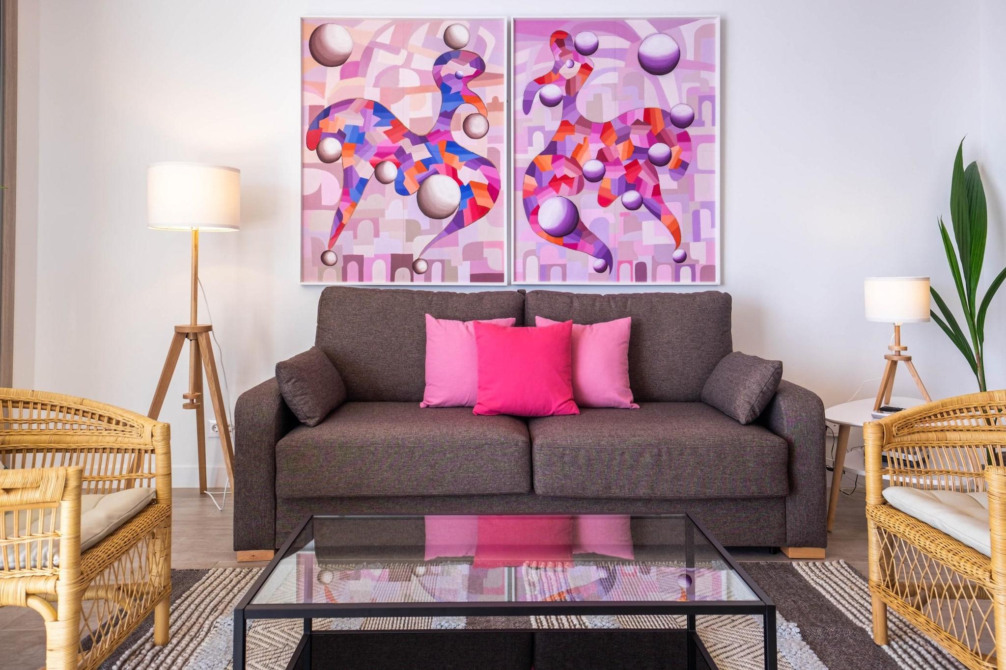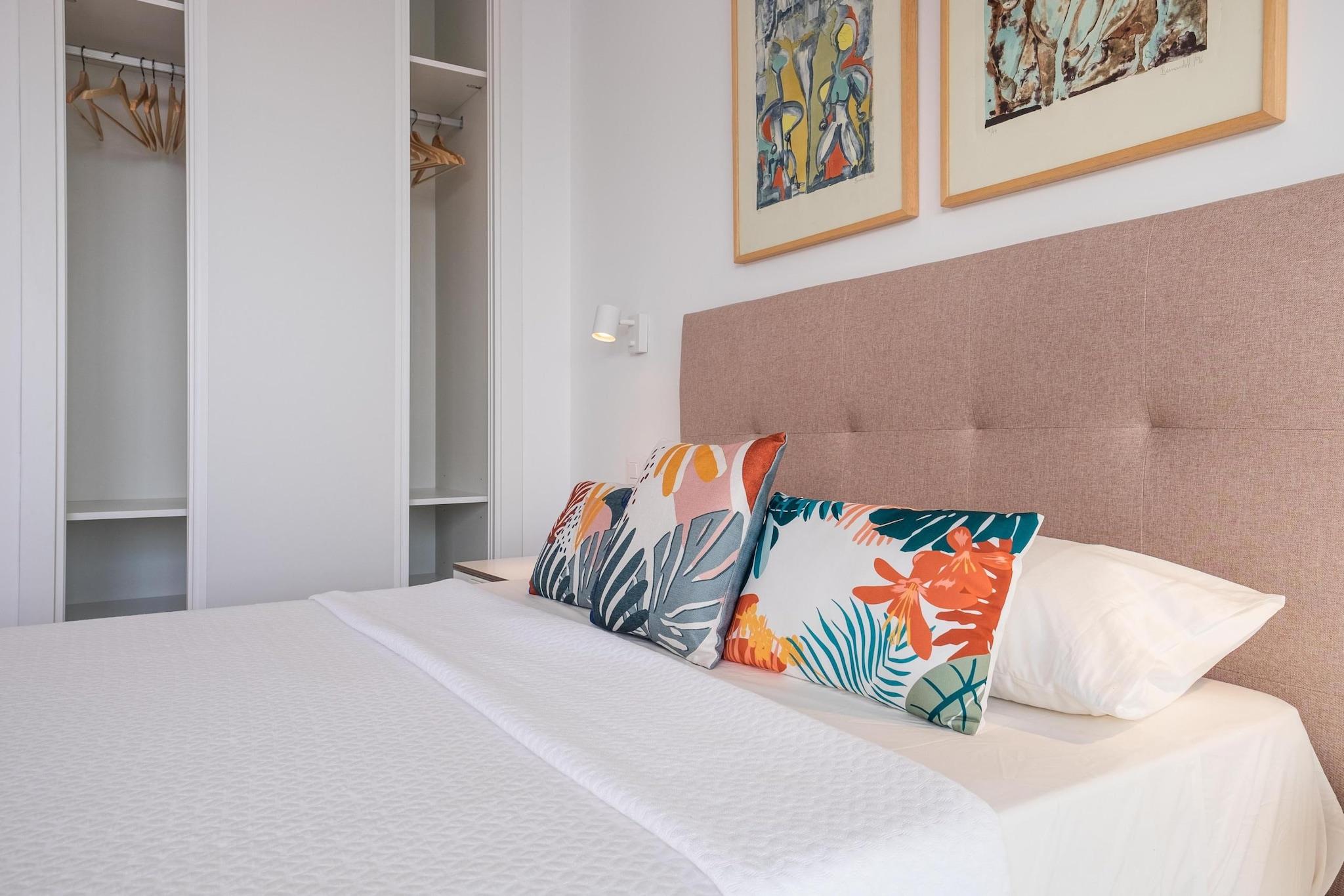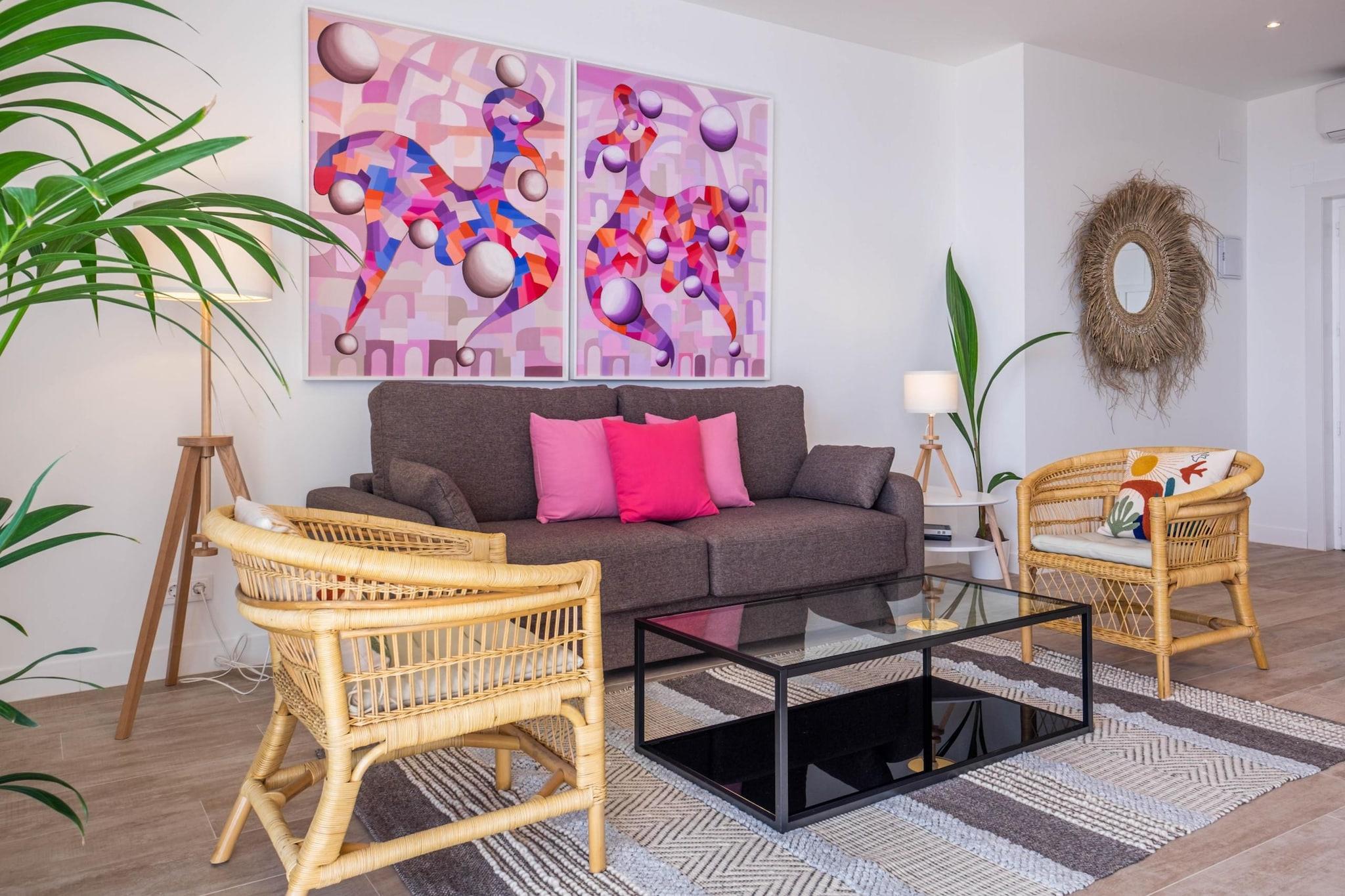 Oppdag et rolig kysttilfluktssted i Torremolinos, ideelt for par, små familier eller fjernarbeidere som søker en blanding av komfort og middelhavssjarm. Denne moderne leiligheten har to king-size-soverom, som begge har fantastisk havutsikt. Ett soverom har en helglassvegg, som bringer havets skjønnhet rett inn i rommet ditt. Gå ut til en romslig privat terrasse på 60 kvadratmeter, perfekt for utendørs servering eller bare for å slappe av mens du nyter havbrisen. Den åpne stuen kobles sømløst til terrassen og skaper et luftig og lyst miljø. Inne finner du et designerkjøkken, to bad med regndusj og en smart-TV med høyhastighets Wi-Fi, som sørger for både avslapning og produktivitet. Leiligheten ligger bare et minutts gange fra Bajondillo-stranden og fem minutter fra La Carihuela-stranden, og tilbyr direkte heisadgang til stranden, slik at gjestene kan nyte solen og havet med letthet. Nærliggende attraksjoner inkluderer Pablo Ruiz Picasso kultursenter, Casa de los Navajas og en livlig promenade fylt med butikker og restauranter. For de som er interessert i vanneventyr, ligger Aqualand Torremolinos og Krokodilleparken i nærheten. Ytterligere fasiliteter inkluderer klimaanlegg, et fullt utstyrt kjøkken og valgfrie tjenester som utleie av solsenger i sommermånedene og et refunderbart depositum for heistilgang. Enten du planlegger en romantisk ferie, en familieferie eller et fjernarbeidssted, tilbyr denne leiligheten den perfekte settingen for å slappe av og utforske Costa del Sols skjønnhet.