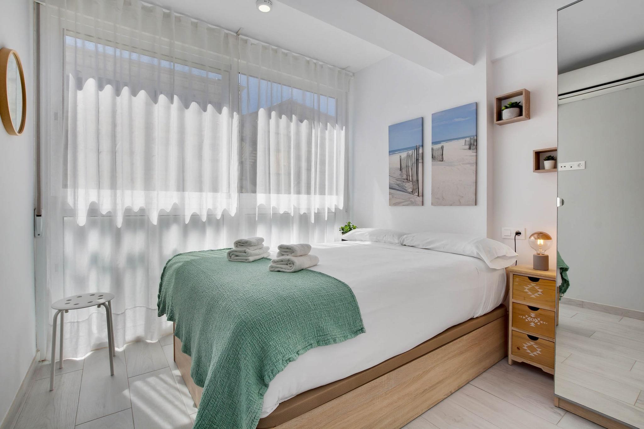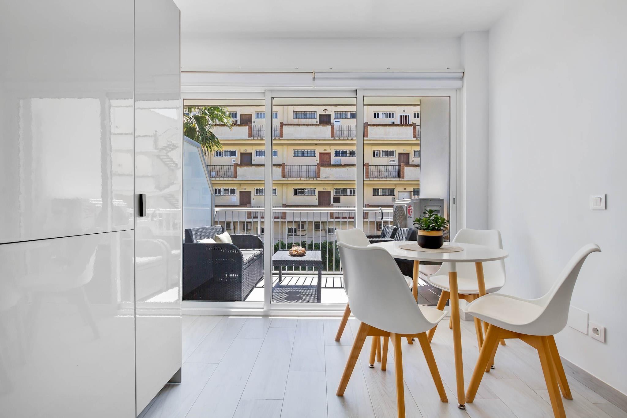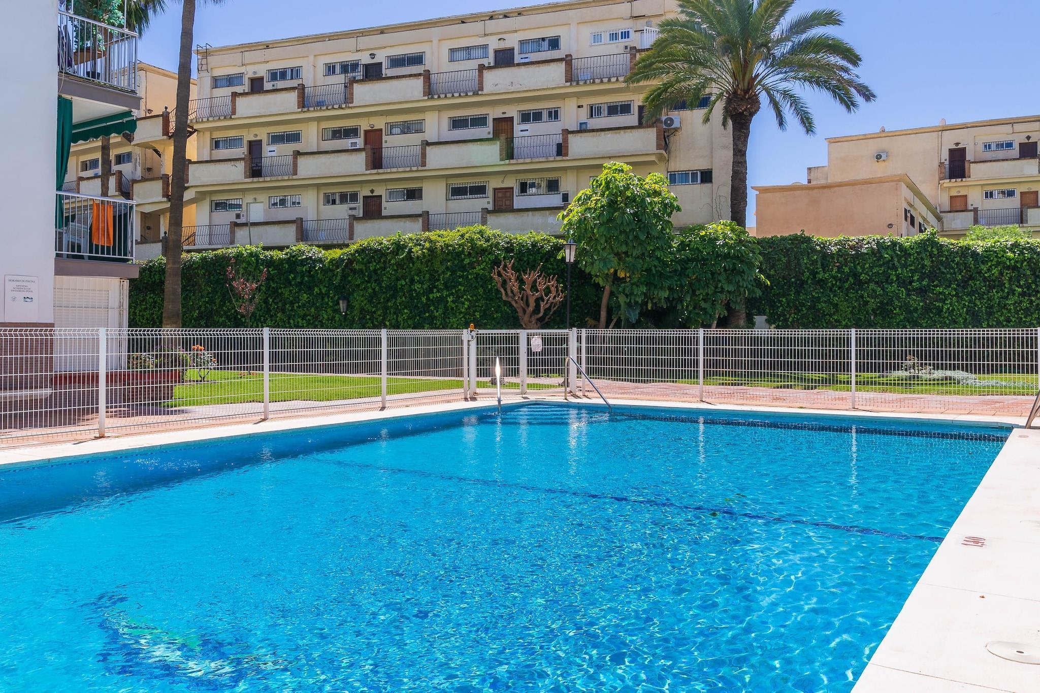 Tenk deg å starte dagen med den milde summingen av bølger og de gylne fargetonene av soloppgang som maler Middelhavets horisont. Denne leiligheten ved stranden tilbyr et rolig tilfluktssted, perfekt for opptil fire gjester som søker både avslapning og eventyr. Inne finner du to komfortable soverom, begge med dobbeltseng og klimaanlegg for å sikre avslappende netter. Det åpne kjøkkenet er fullt utstyrt med moderne hvitevarer, inkludert et stort kjøleskap, stekeovn, mikrobølgeovn, oppvaskmaskin og viktige kokekar, noe som gjør matlaging til en fryd. Stuen åpner ut mot en solfylt terrasse, et ideelt sted for morgenkaffe eller kveldsavslapning, med fantastisk utsikt over havet og bassenget. Leiligheten ligger i et velholdt område som kan skryte av et forfriskende svømmebasseng, perfekt for en avslappende dukkert etter en dag på stranden. Ligger bare noen skritt fra sandstrendene i Torremolinos, er du også innen gangavstand fra pulserende lokale spisesteder, butikker og kulturelle attraksjoner. Enten du slapper av ved bassenget, utforsker de sjarmerende gatene eller nyter strandstemningen, er denne leiligheten den perfekte basen for en uforglemmelig kystferie.