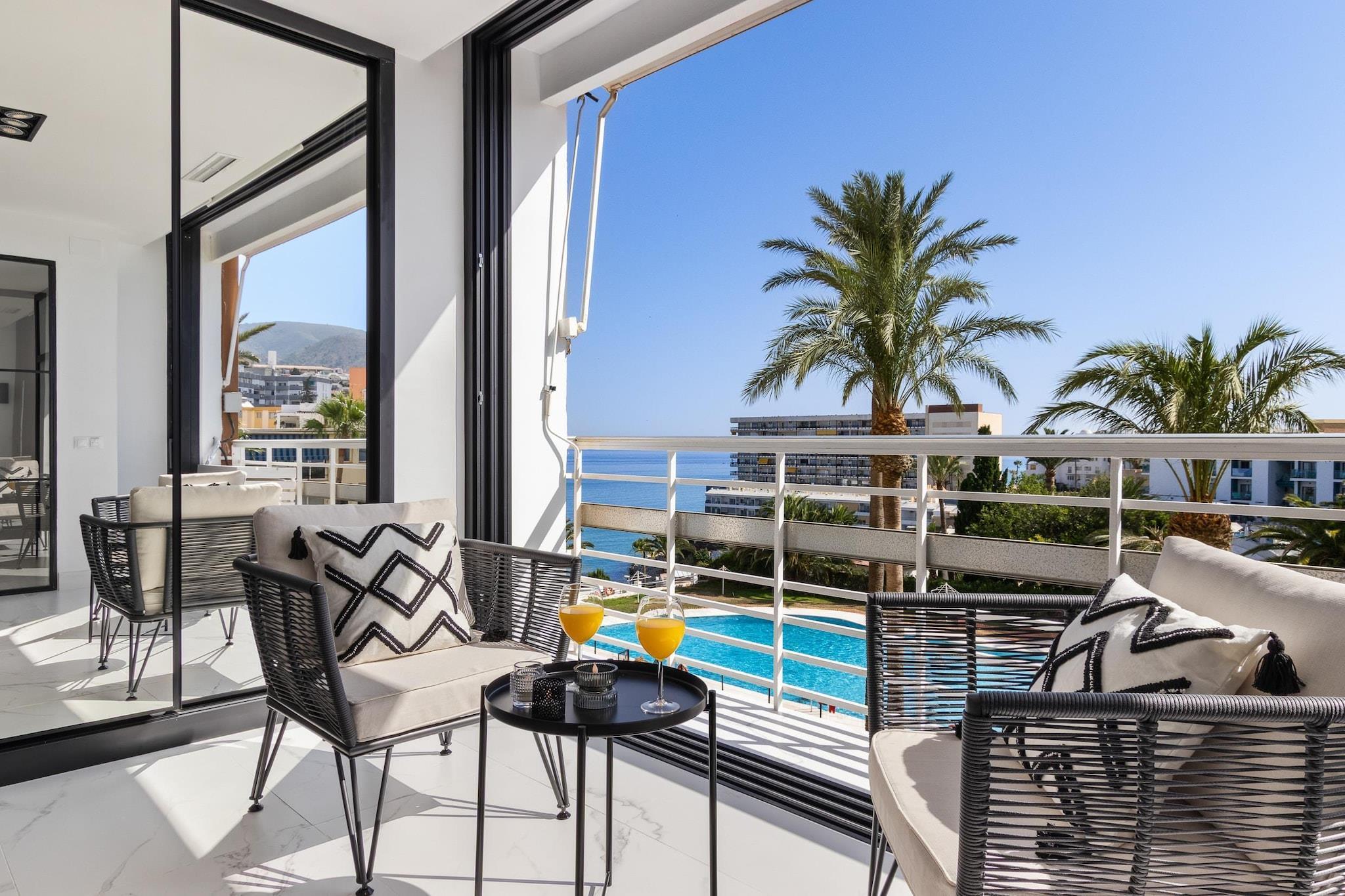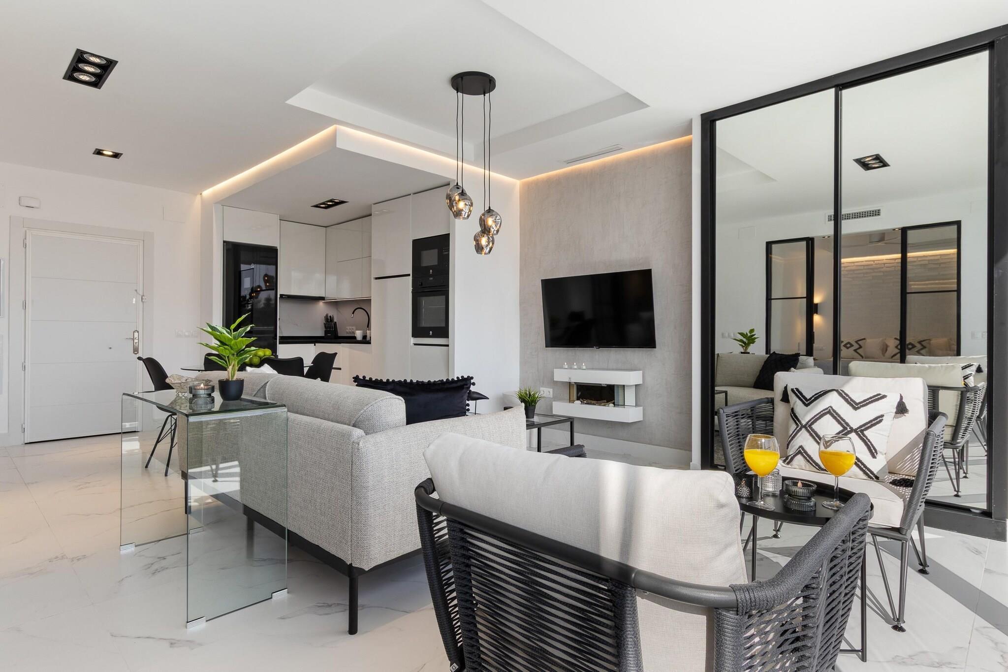 Velkommen til Black and White Beach, en leilighet i boutiquestil med fantastisk havutsikt og en privilegert beliggenhet ved stranden i Torremolinos. Dette stilfulle rommet er designet i en unik svart-hvitt-palett, og tilbyr både komfort og karakter – perfekt for par, familier eller små grupper som søker en inspirerende kystferie. Leiligheten har to vakkert dekorerte soverom med 150x190 cm senger, takvifter og klimaanlegg. Den lyse stuen er fylt med naturlig lys og kobler seg til et moderne åpent kjøkken fullt utstyrt med stekeovn, mikrobølgeovn, oppvaskmaskin og vaskemaskin/tørketrommel. Det elegante badet har dusjkabinett, og store skyvevinduer åpner hele leiligheten med panoramautsikt over Middelhavet. Med sin sørvestvendte orientering vil du nyte solskinn fra middag til solnedgang. Bygningen tilbyr direkte tilgang til stranden Bajondillo, og du er bare 5 minutter fra sentrum, togstasjonen og et bredt utvalg av restauranter og butikker. Denne fredelige og eksklusive beliggenheten inkluderer tilgang til et felles svømmebasseng, utendørs parkering, Wi-Fi, Netflix og alle moderne bekvemmeligheter. Enten du ønsker å slappe av ved sjøen eller utforske den livlige Costa del Sol, tilbyr Black and White Beach den perfekte balansen mellom design, beliggenhet og komfort.