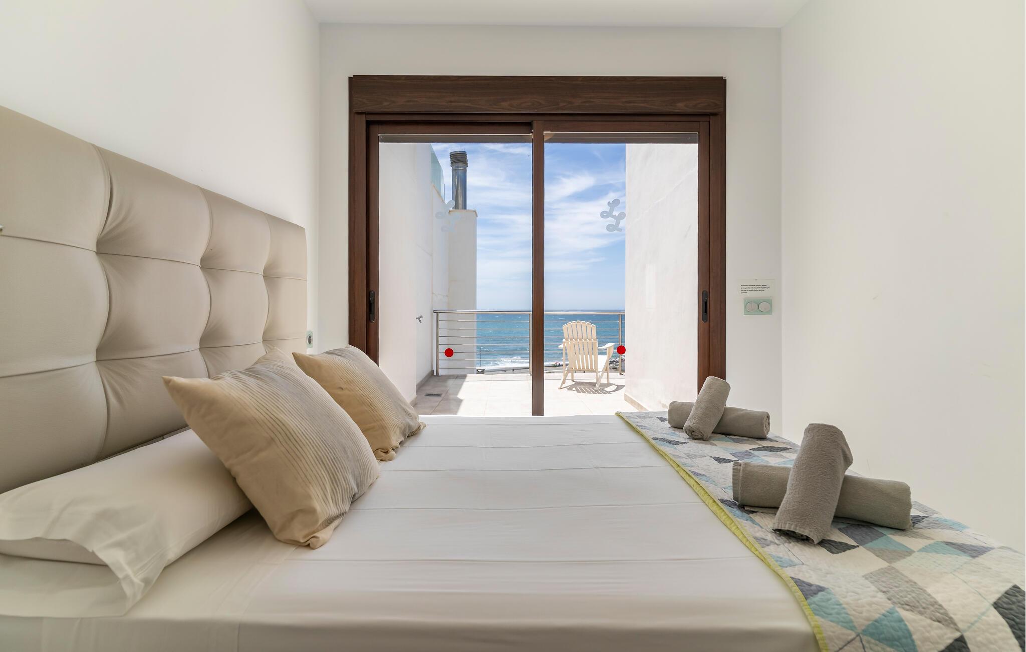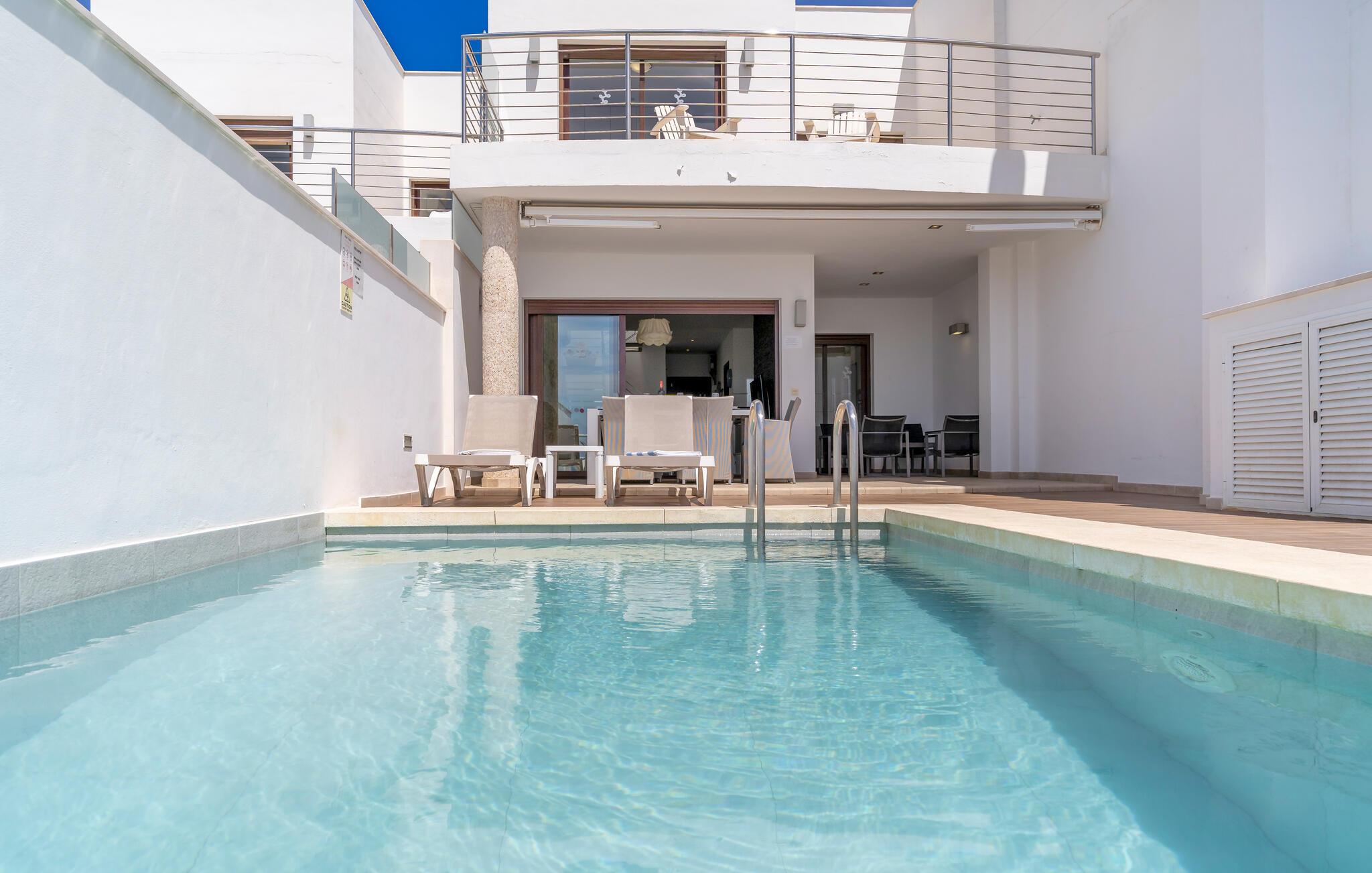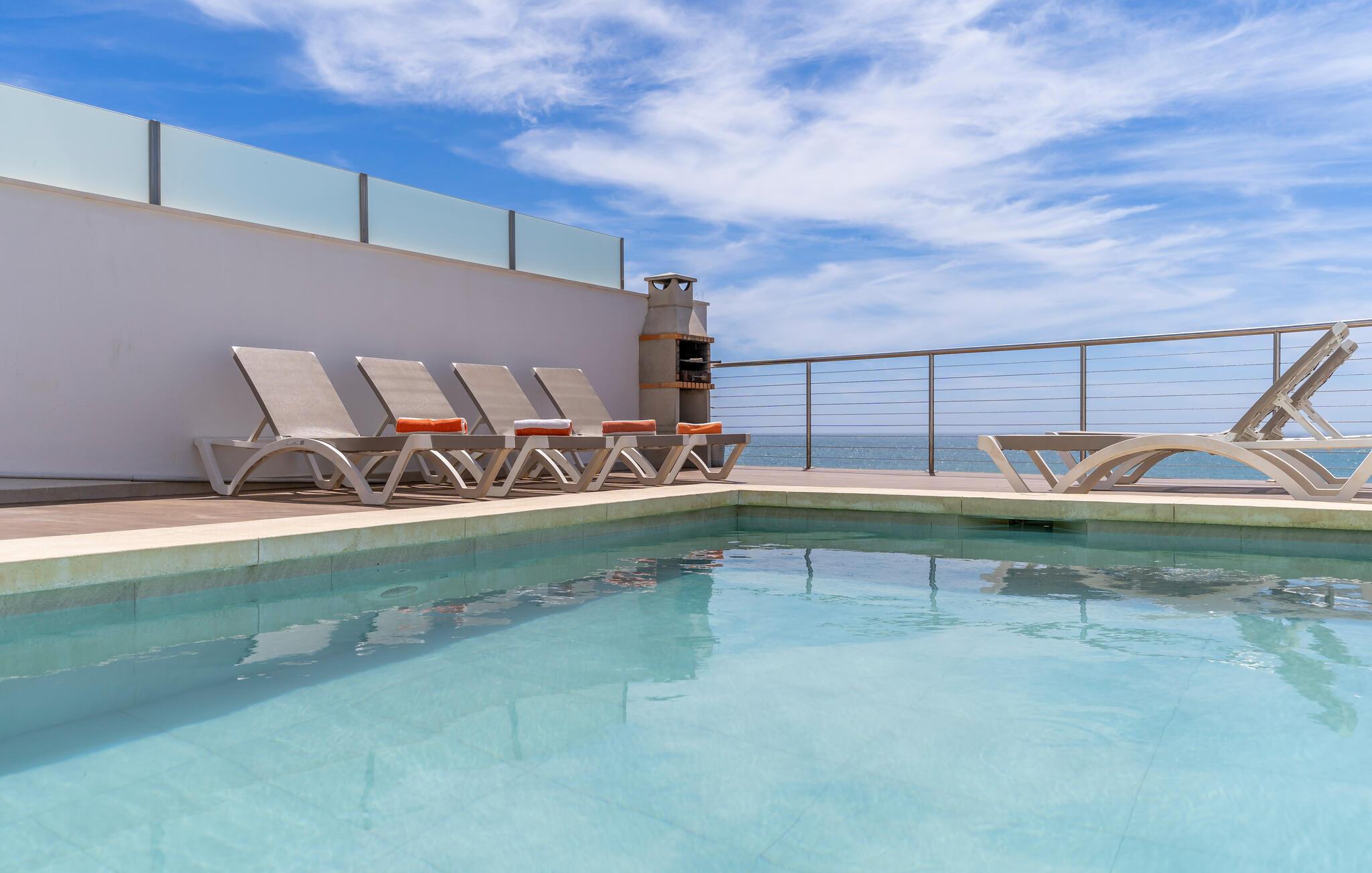 Takket være den brede skyvedøren i glass kommer du enkelt ut på den romslige terrassen, hvor du kan nyte en fortryllende utsikt over havet. Her kan du starte dagen med ferskpresset appelsinjuice, forfriske deg i det lille private bassenget og slappe av i de komfortable solsengene. En grill er tilgjengelig for koselige kvelder med vin og levende lys.