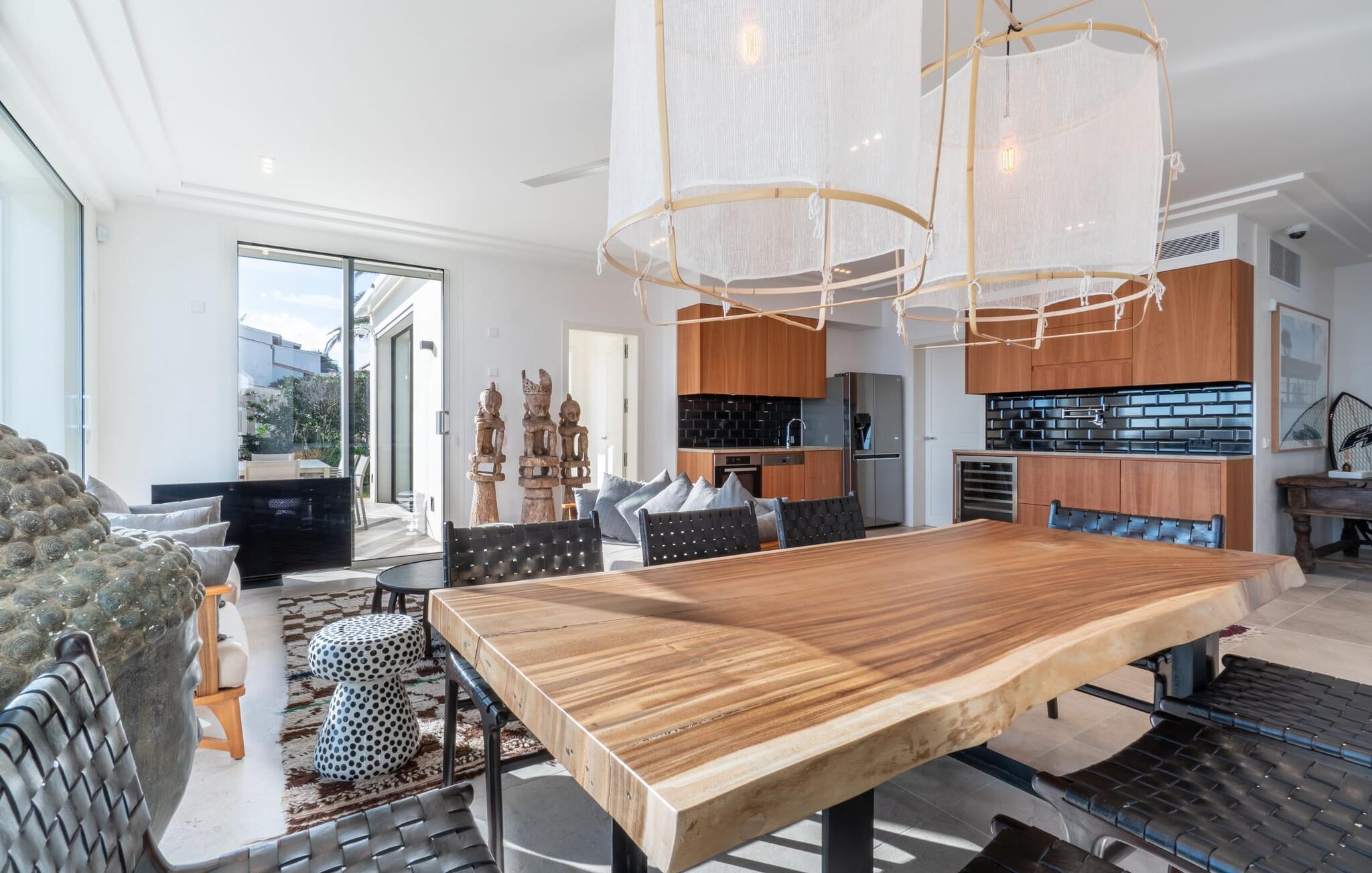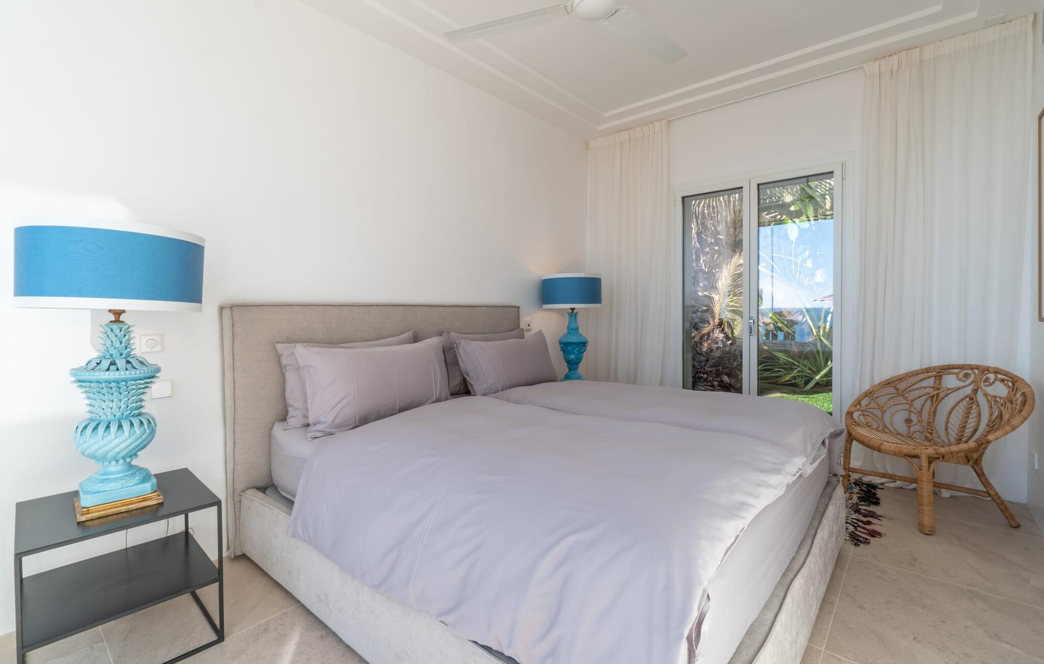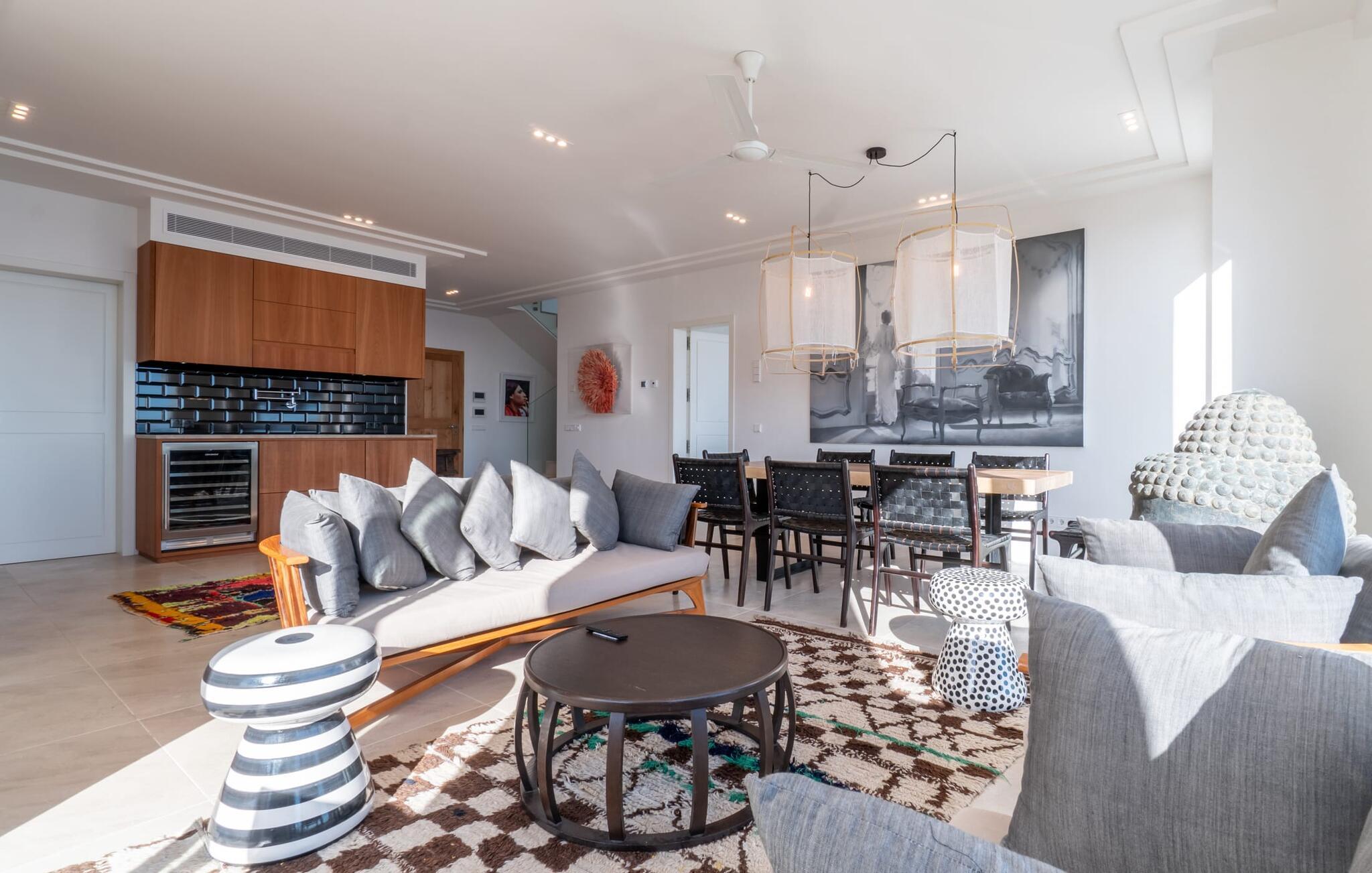 Også innvendig er den skinnende hvite villaen et ekte drømmehjem, stilfullt og individuelt designet og møblert. Vinduene som går fra gulv til tak i nesten alle rom gir utsikt over havet på den ene siden og slipper lyset inn på den andre siden, noe som gjør det fantastisk lyst overalt. Møblene og innredningen er av høy kvalitet og er satt sammen med en god sans for interiørdesign. Naturfarger er for eksempel dyktig kombinert med fargerikt tilbehør og tradisjonell balinesisk steinkunst. I første etasje er det et stort rom som rommer stue og spisestue med åpen planløsning og et elegant kjøkken. Til høyre og venstre for dette ligger et smakfullt designet soverom med havutsikt, hvert med sitt eget romslige en-suite bad med dusj fra gulv til tak og elegante marmordetaljer. Ytterligere to like vakre soverom og bad med utgang til takterrassen ligger i øverste etasje. Fra Villa Tortuga kan du nyte direkte utsikt over Middelhavet: huset med sine store vindusfronter ligger sørvendt på en hagetomt med et evighetsbasseng rett ved vannet. Du kan enkelt gjøre innkjøp i Porto Cristo, som ligger bare ca. 4,5 km unna, via veien, som er hørbar avhengig av vindretningen. Cala Anguila-bukten ligger bare ca. 1,6 km unna.
