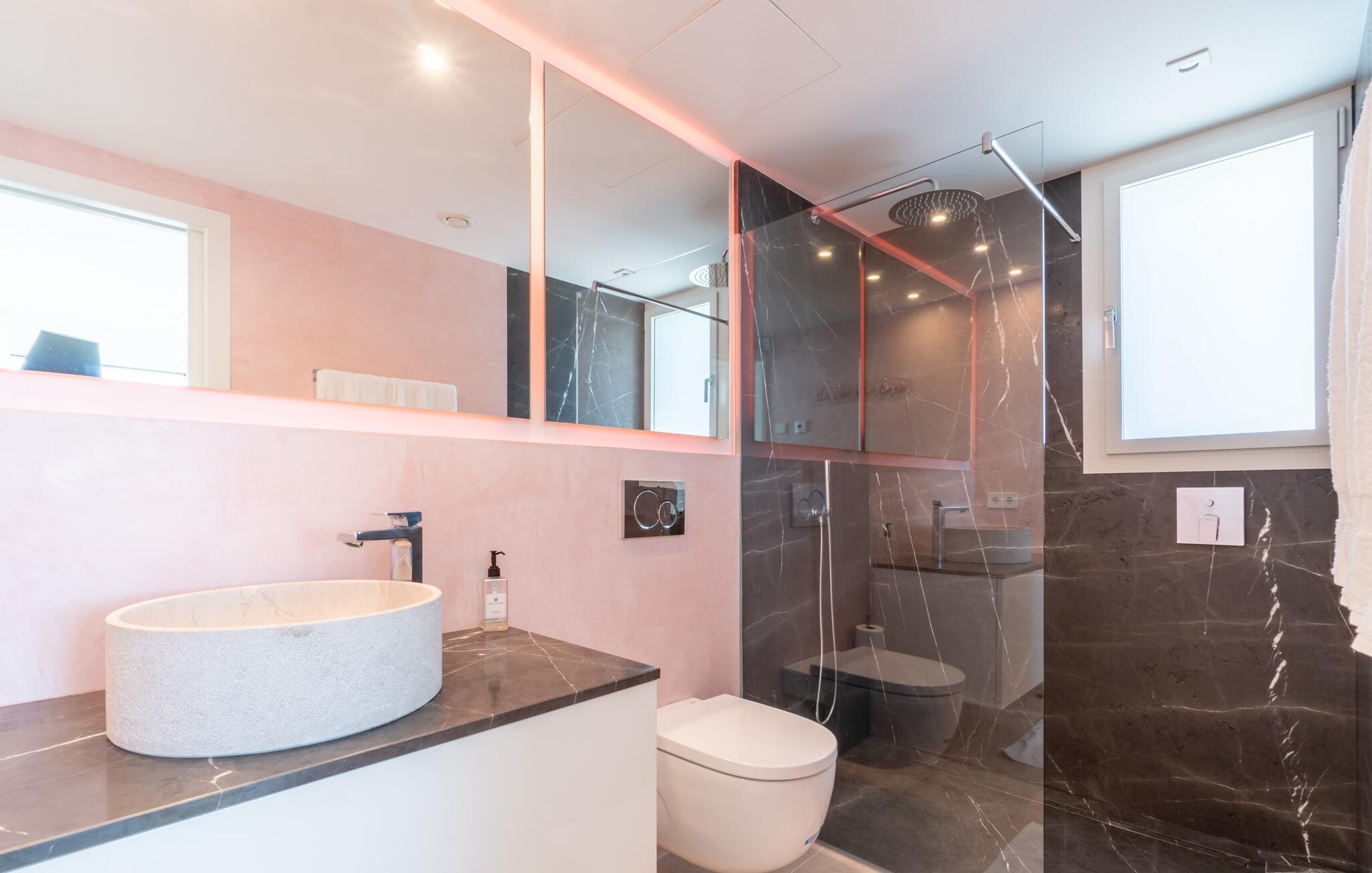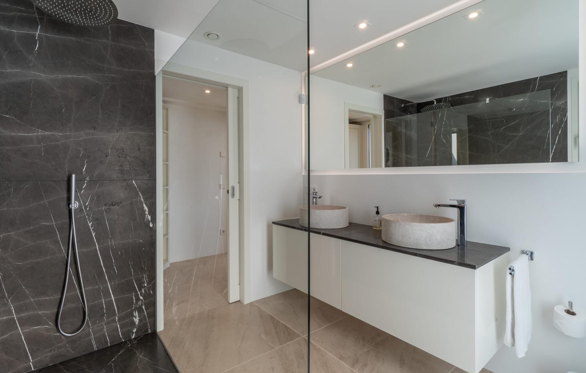En ferie med wow-effekt: Den moderne Villa Tortuga har en solrik, sørvendt beliggenhet i et elegant boligområde nær Porto Cristo på Mallorcas østkyst, og tilbyr plass til opptil åtte personer og en unik utsikt: Fra huset og eiendommen har du direkte utsikt over havet. Enten du slapper av på terrassen beskyttet av markiser eller på takterrassen med glassrekkverk, om du forfrisker deg i det oppvarmede evighetsbassenget laget av balinesiske steiner, der du virkelig kan trene takket være motstrømsanlegget, eller om du rusler over de velstelte plenene i hagen, hvorfra noen steintrapper fører ned til vannet, hvis du lar blikket vandre, vil du alltid se det dypblå Middelhavet hvis du lar blikket vandre. Leiebilen din kan parkeres på gaten foran huset.