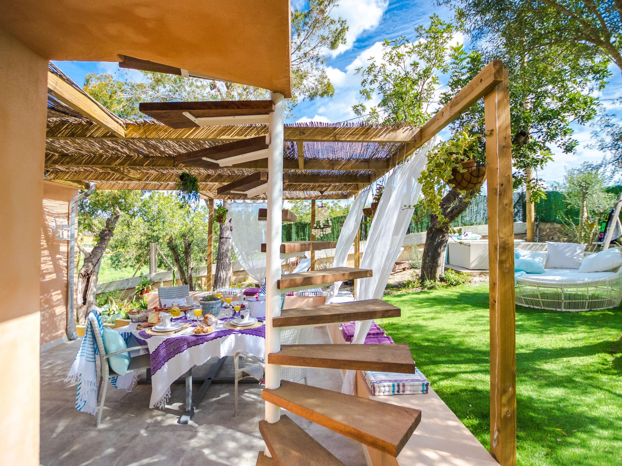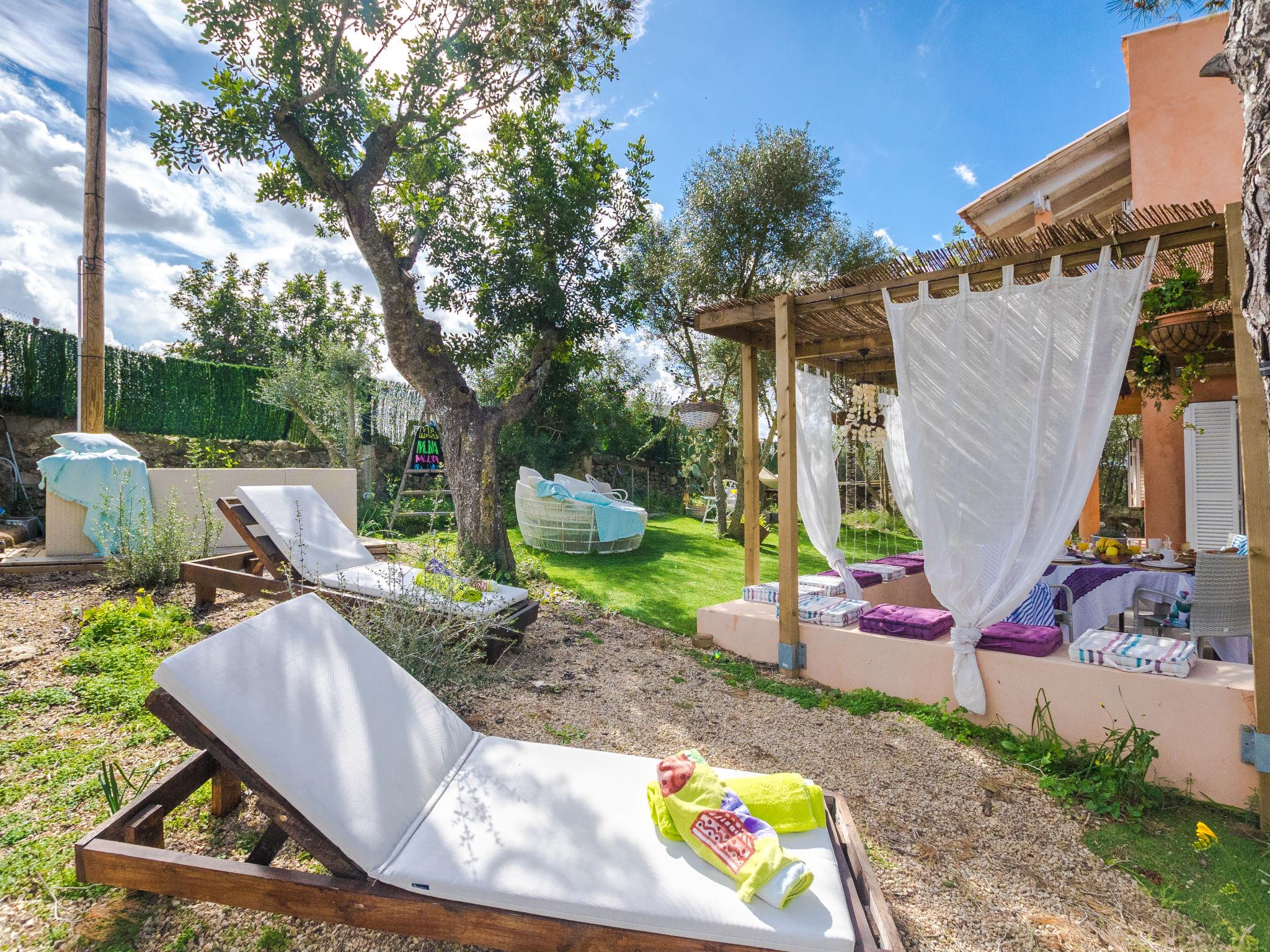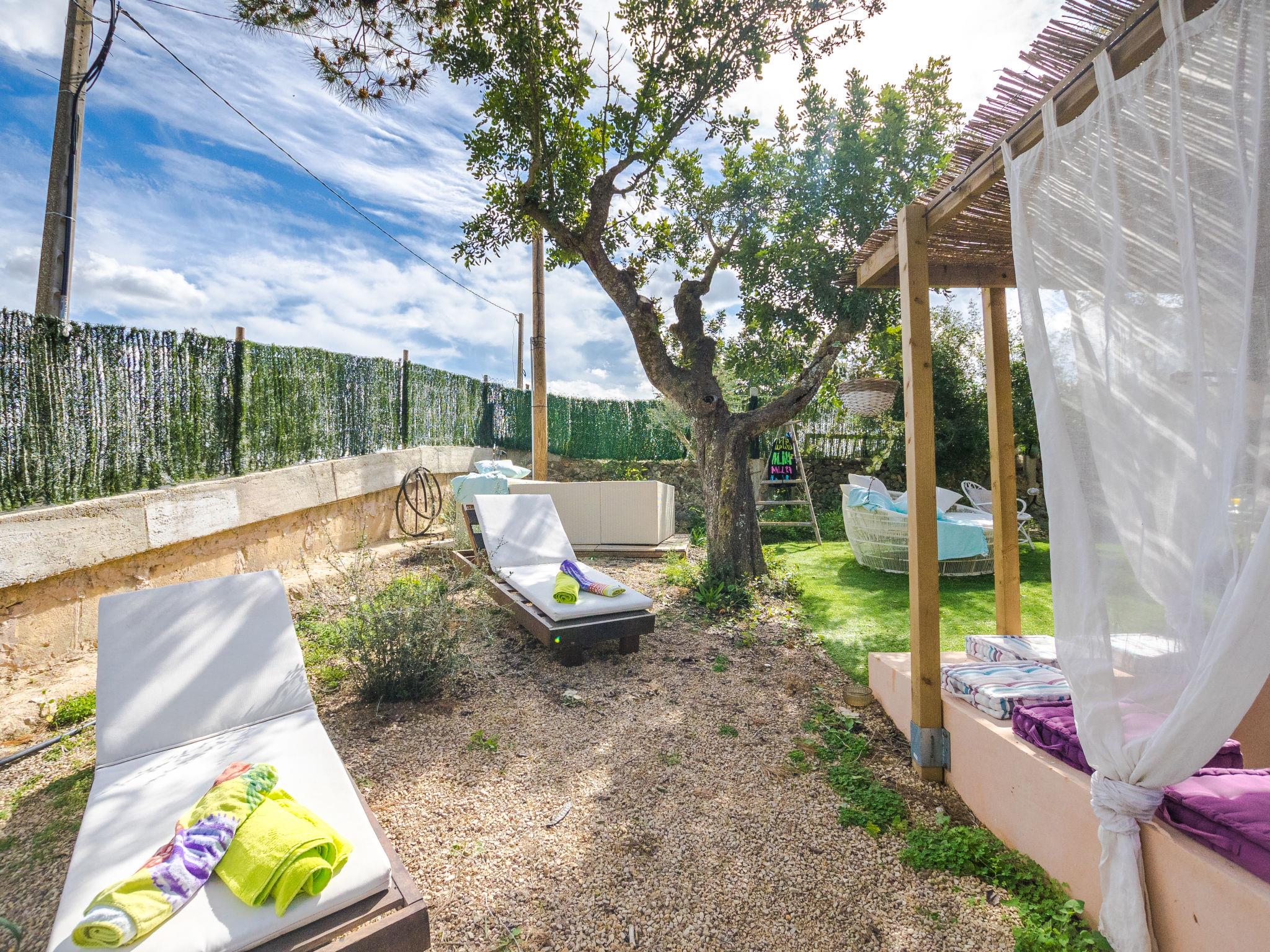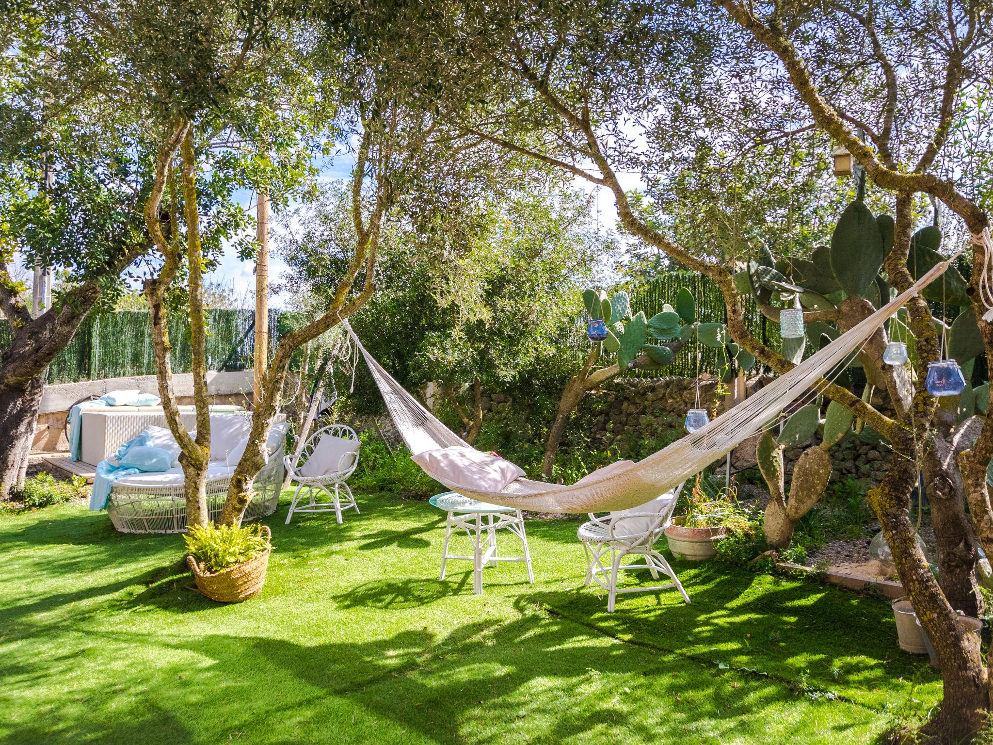 Villafranca de Bonany: Very beautiful, comfortable farm estate "Can Marc", 2 storeys, renovated in 2018, surrounded by meadows. Outside the resort, 950 m from the centre of Villafranca, in a quiet position on top of a hill, 24 km from the sea, 24 km from the beach, in the woods. Private: natural state property with wildlife garden and trees, beautiful garden to relax. Outdoor shower, hot tub, patio, arbour, garden furniture, barbecue. In the house: internet access, WiFi, storage room for bicycles, washing machine. Steep motor access. Parking at the house on the premises. Shop 950 m, supermarket 980 m, restaurant 900 m, bar 800 m, bakery 800 m, 10 minute walk to the centre, bus stop 900 m, sandy beach "Portocristo" 24 km, rocky beach "Cala Manacor" 24 km. Sports harbour 24 km, marina 24 km, golf course (18 hole) 31 km. Nearby attractions: Cala Magrana, Cala Mendia, Cala Romantic 23 km, Cala Varques 22 km, Manacor Ciudad 9.5 km. Please note: car recommended. Suitable for families, suitable for seniors. Object suitable for 2 adults groups of teenagers on request only. Loading and unloading of baggage is possible at the holiday house. Animals in the neighbourhood. Airfield 37 km from the property.