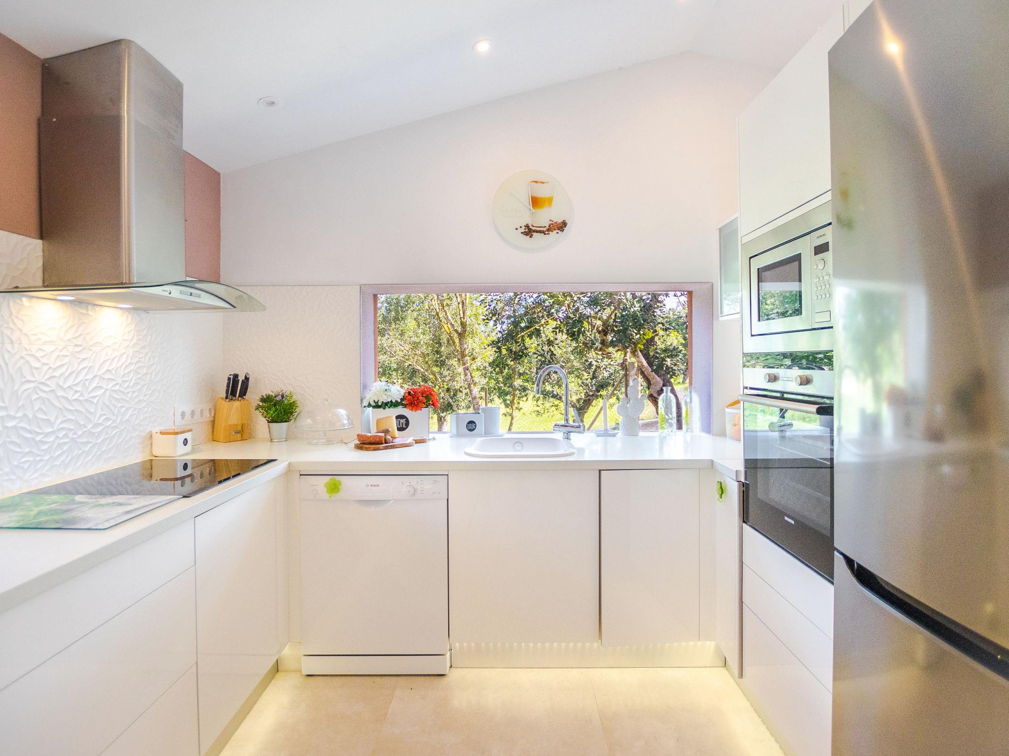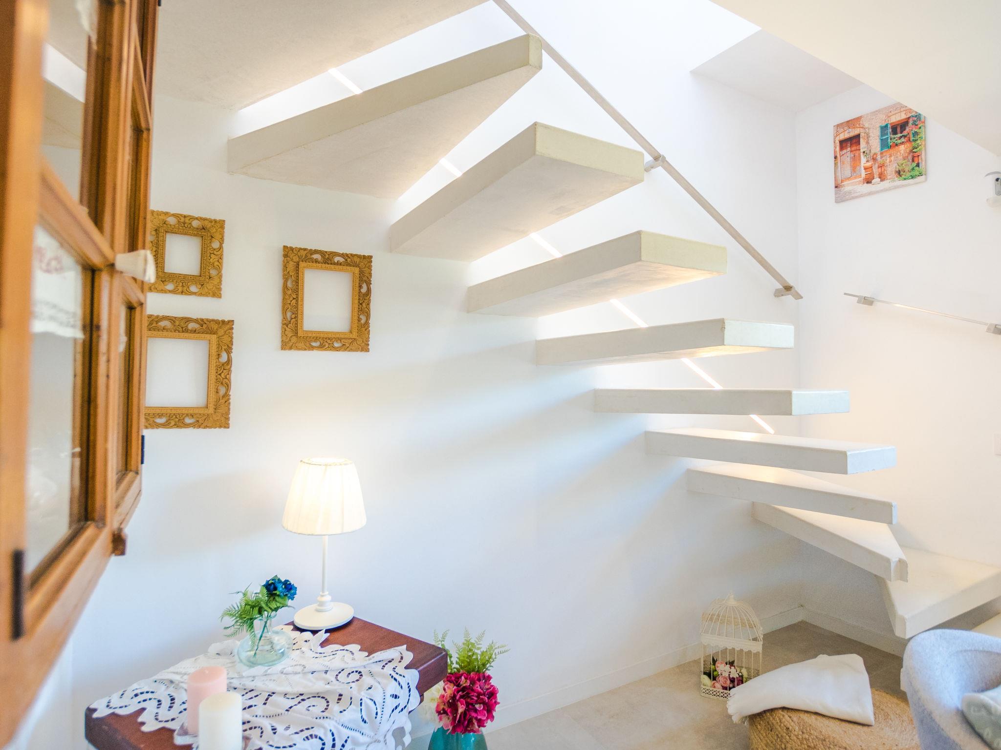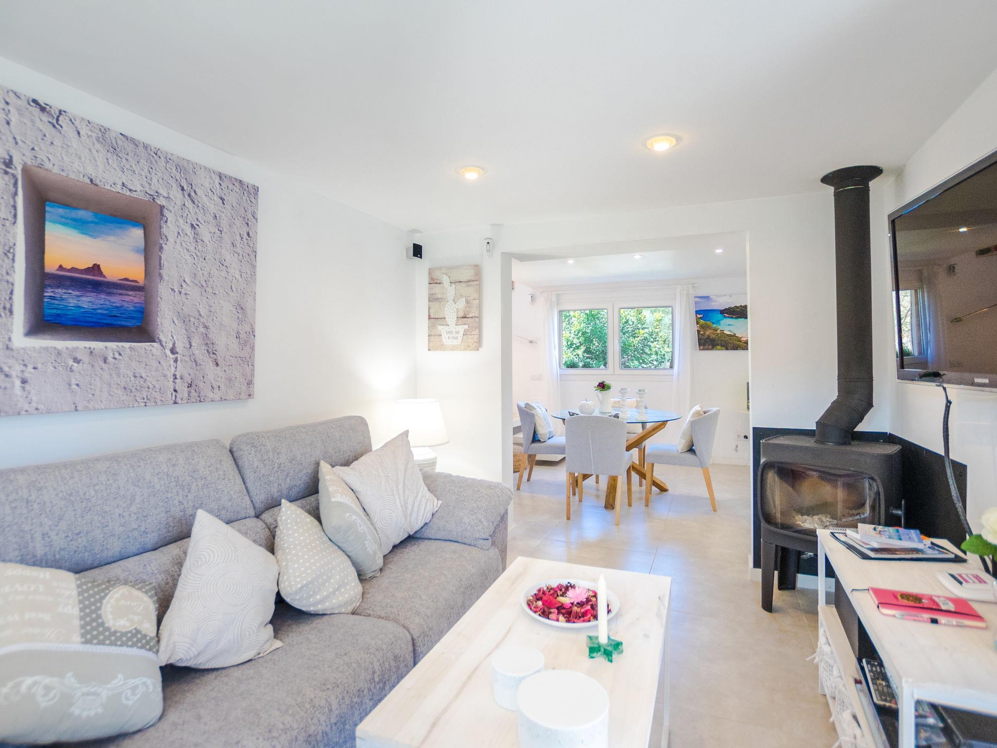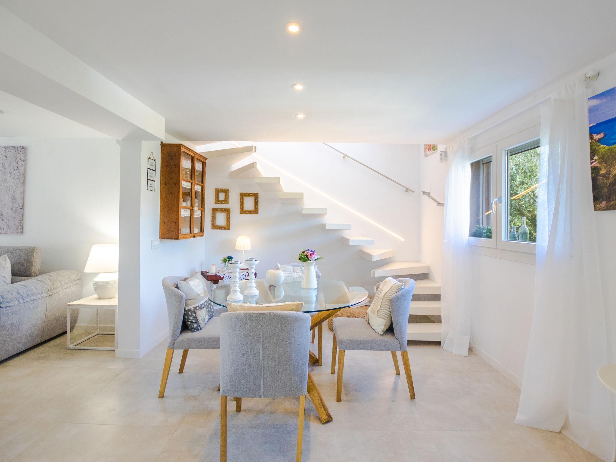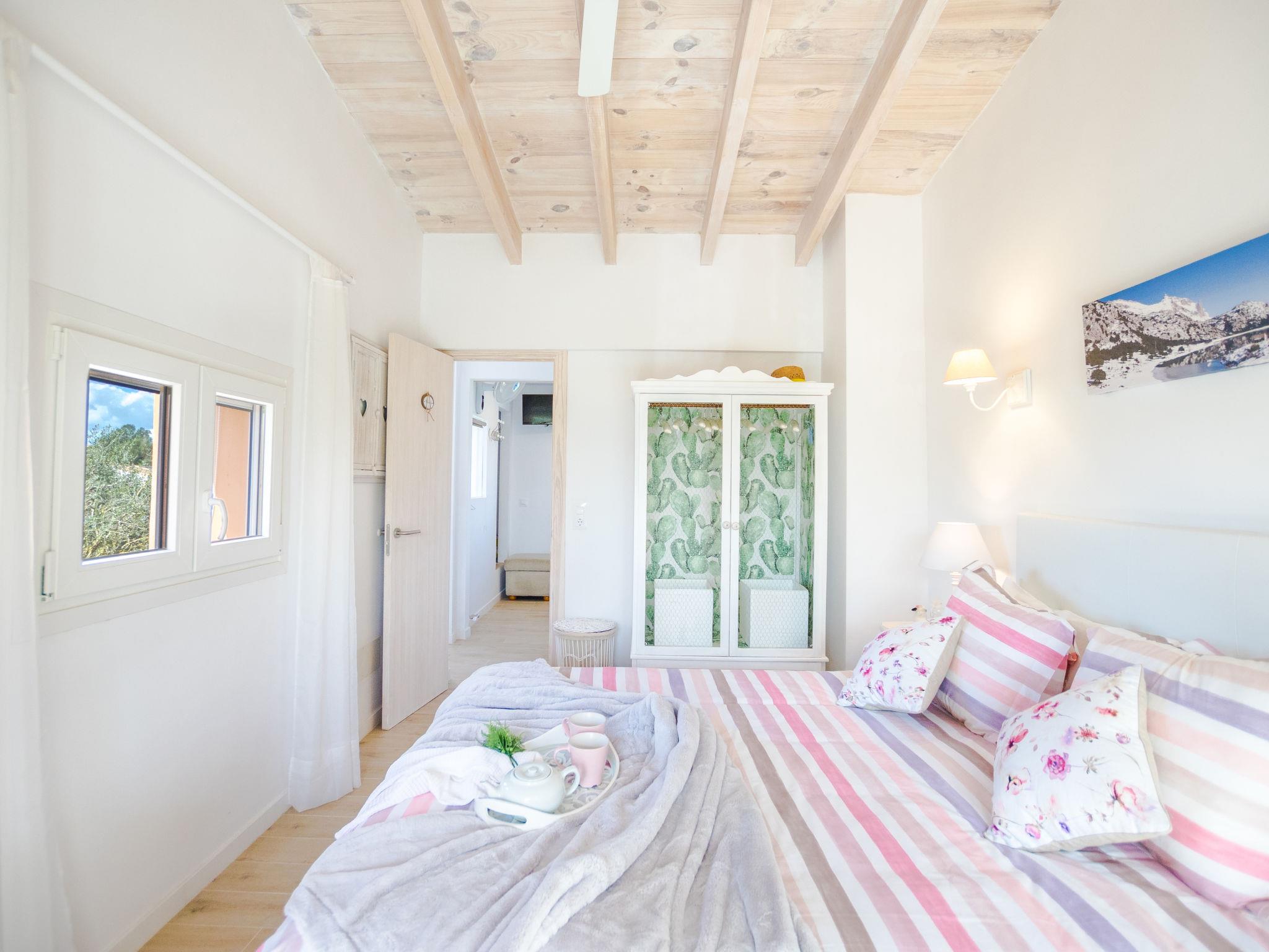 "Can Marc", 3-room house 80 m2 on 2 levels. Object suitable for 2 adults. Fully renovated, very cosy and romantic furnishings: open living/dining room with sliding door, panoramic window with open-hearth fireplace, TV, international TV channels, flat screen, air conditioning and forced-air heating. Exit to the patio, to the swimming pool. Open kitchen (oven, dishwasher, 3 ceramic glass hob hotplates, toaster, kettle, microwave, freezer, electric coffee machine). Exit to the patio. Bath/shower/WC. Upper floor: 1 double bedroom with sliding door with 1 french bed (150 cm), air conditioning, fan and forced-air heating. Exit to the balcony. 1 double bedroom with panoramic window with 1 french bed (135 cm), fan. Bath/shower/WC. Balcony, patio, porch. Terrace furniture, balcony furniture, barbecue, deck chairs. View of the mountains and the countryside. Facilities: washing machine, iron, mosquito net, hair dryer. Internet (WiFi, free). Parking (fenced). Suitable for families. Maximum 1 pet/ dog allowed. ETV9259 // Reg. Nr.: ESFCTU00000702900033314000000000000000000000ETV/92597