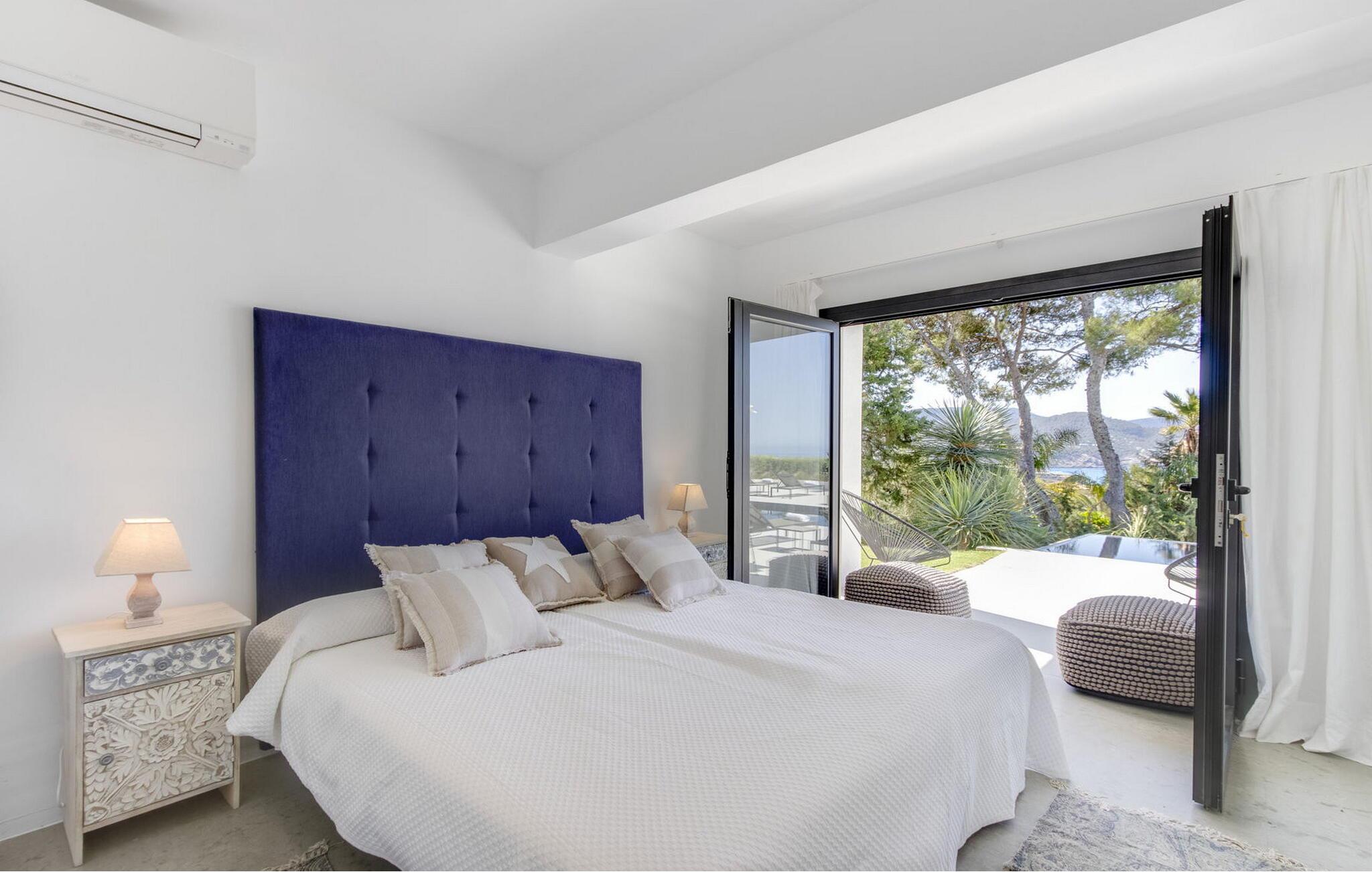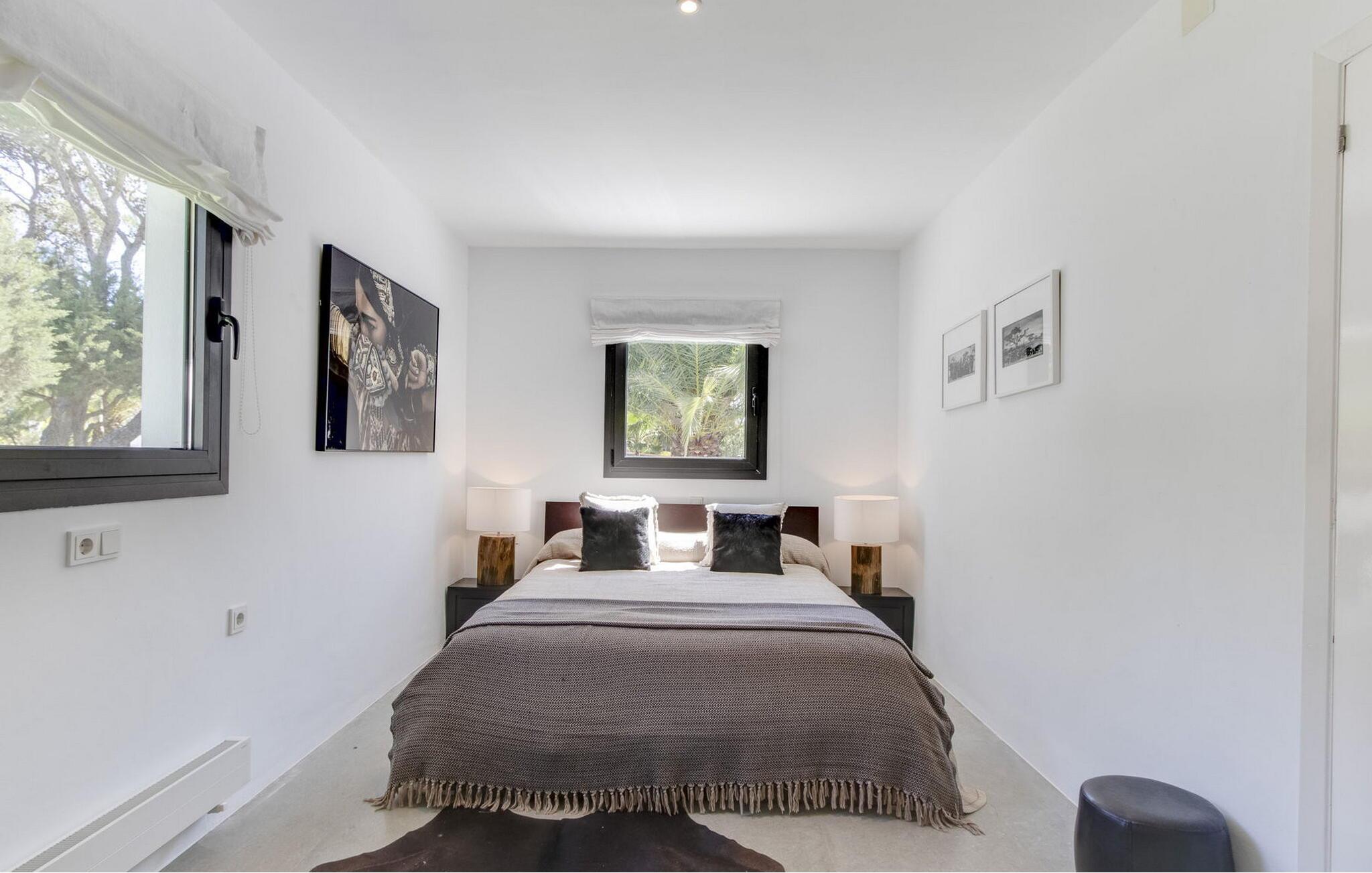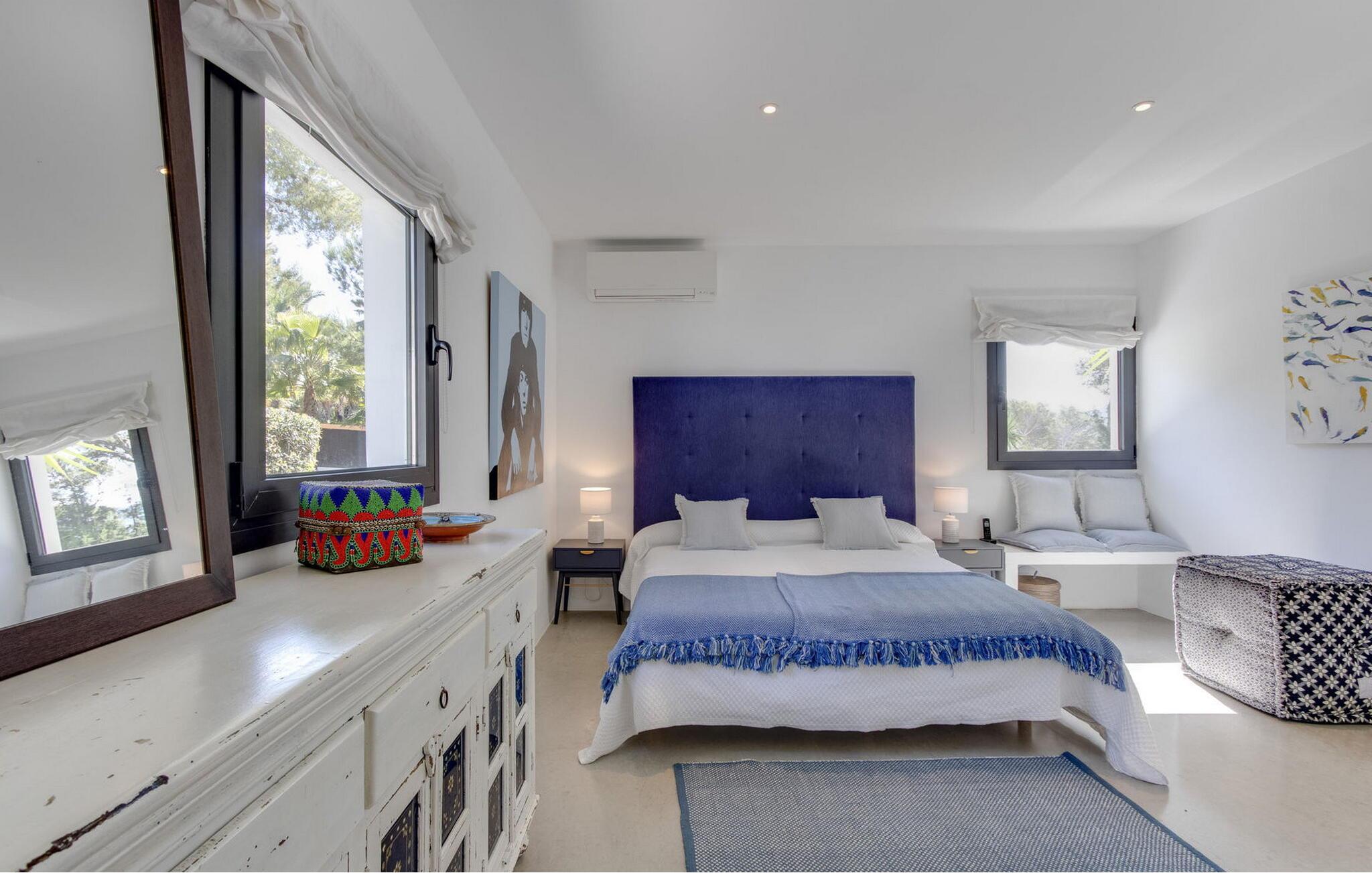 Hovedsoverommet er romslig og ligger i første etasje med spektakulær utsikt over Es Vedrá. Det har et designerbadekar ved siden av sengen, og badet har dusj og separat toalett, mens soverommet med dobbeltseng i første etasje har direkte utgang til bassengterrassen med utsikt over havet og Es Vedrá. Det har eget bad med dusj. Soverommet med dobbeltseng i første etasje, ved siden av soverom 2, har utsikt over hagen og utgang til terrassen. Det har eget bad med dusj. Det er et soverom med dobbeltseng i nærheten av kjøkkenet og gangen, med eget bad og 2 soverom i annekset med dobbeltsenger. De deler bad. Det fullt utstyrte kjøkkenet har en Nespresso-kaffemaskin, og villaen har 2 uteserveringer på verandaen og i hagen, en 50-tommers TV, Apple TV, et Sonos-lydanlegg, 100 MB fiberoptisk internett, Wi-Fi og klimaanlegg i soverommene (varmt og kaldt). Fasilitetene inkluderer et sikkerhetssystem, vaskemaskin, tørketrommel og strykebrett. Svømmebassenget har et saltkloreringssystem, og den store hagen har en plen som er ideell for barn, en grill og parkering for flere biler.