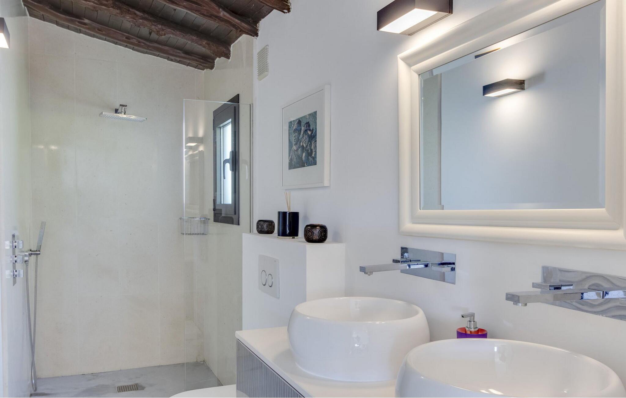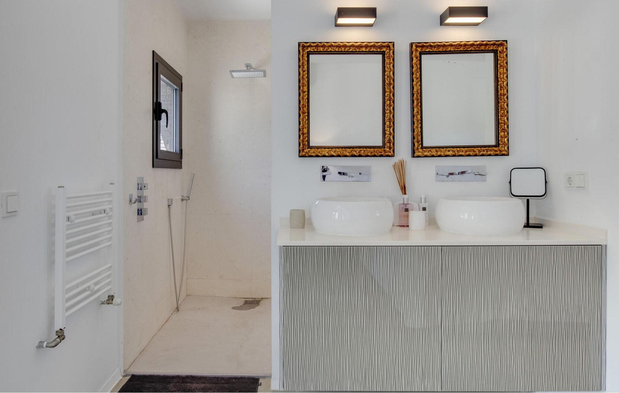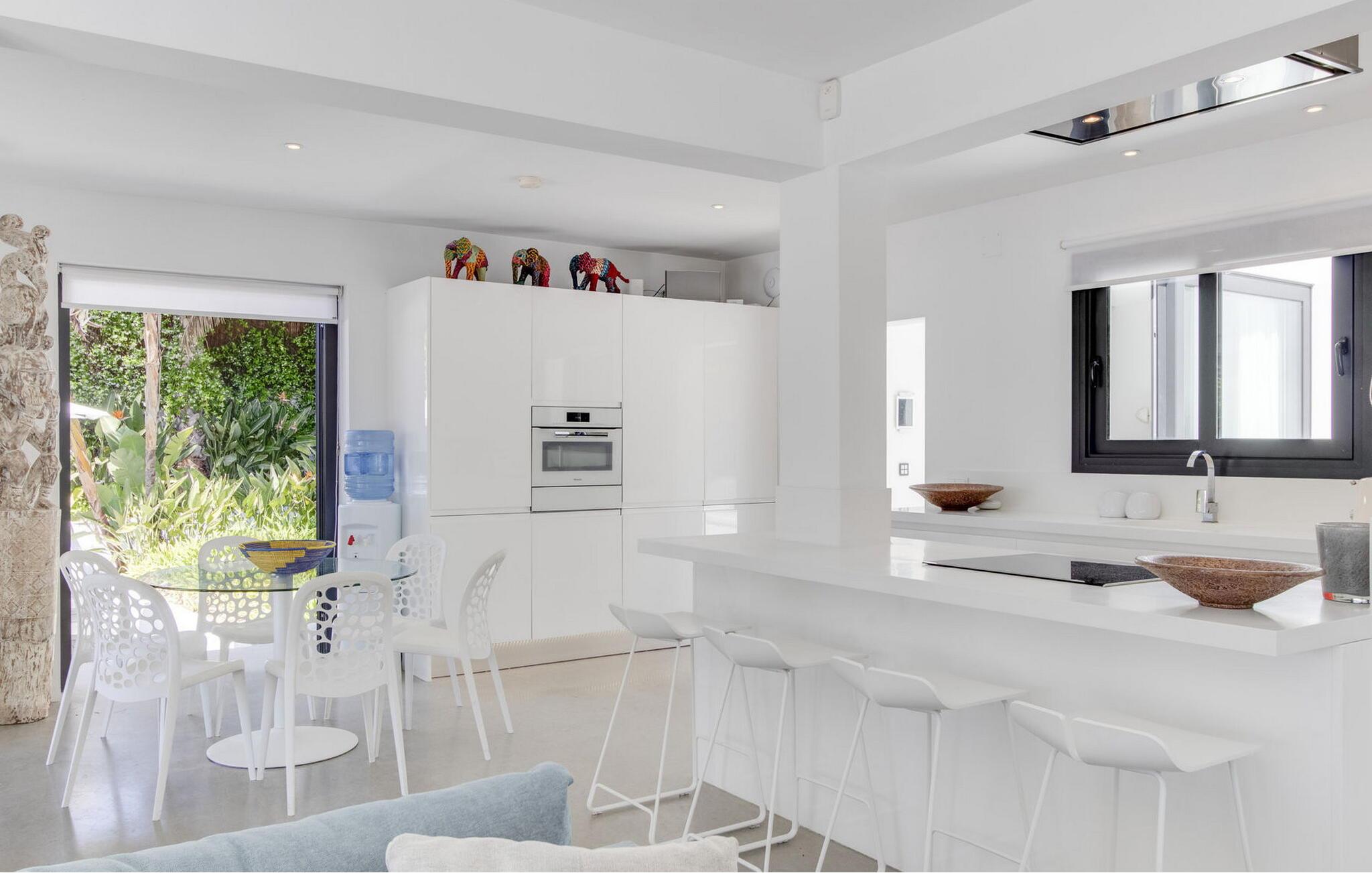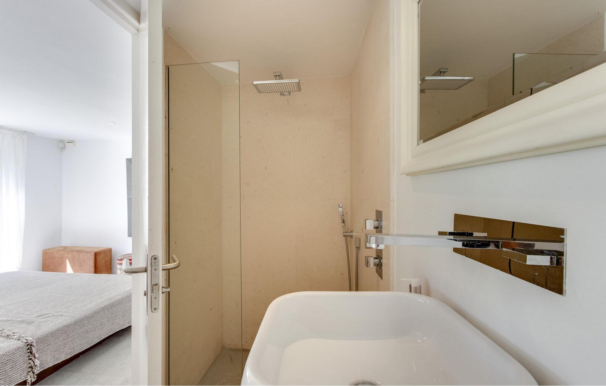 Hovedsoverommet er romslig og ligger i første etasje med spektakulær utsikt over Es Vedrá. Det har et designerbadekar ved siden av sengen, og badet har dusj og separat toalett, mens soverommet med dobbeltseng i første etasje har direkte utgang til bassengterrassen med utsikt over havet og Es Vedrá. Det har eget bad med dusj. Soverommet med dobbeltseng i første etasje, ved siden av soverom 2, har utsikt over hagen og utgang til terrassen. Det har eget bad med dusj. Det er et soverom med dobbeltseng i nærheten av kjøkkenet og gangen, med eget bad og 2 soverom i annekset med dobbeltsenger. De deler bad. Det fullt utstyrte kjøkkenet har en Nespresso-kaffemaskin, og villaen har 2 uteserveringer på verandaen og i hagen, en 50-tommers TV, Apple TV, et Sonos-lydanlegg, 100 MB fiberoptisk internett, Wi-Fi og klimaanlegg i soverommene (varmt og kaldt). Fasilitetene inkluderer et sikkerhetssystem, vaskemaskin, tørketrommel og strykebrett. Svømmebassenget har et saltkloreringssystem, og den store hagen har en plen som er ideell for barn, en grill og parkering for flere biler.