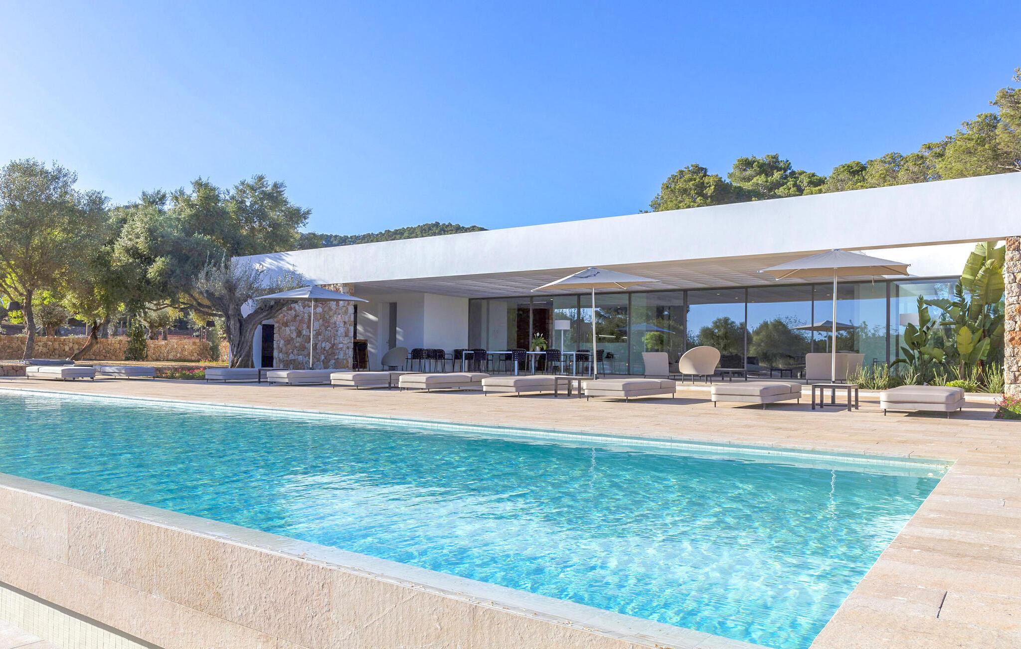 Stort evighetsbasseng med solsenger og parasoller. Sofakrok, utendørs spiseplass og kullgrill.