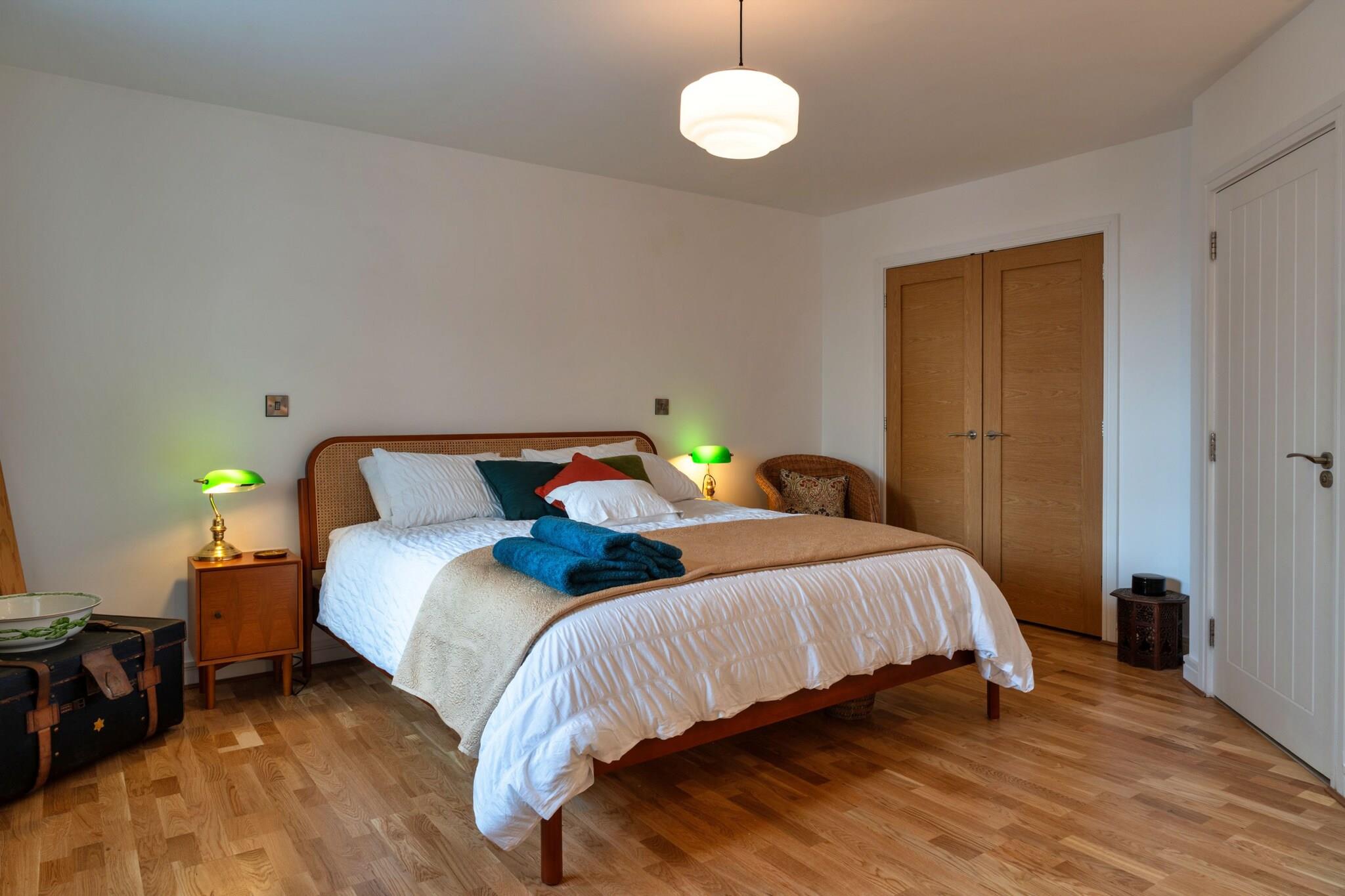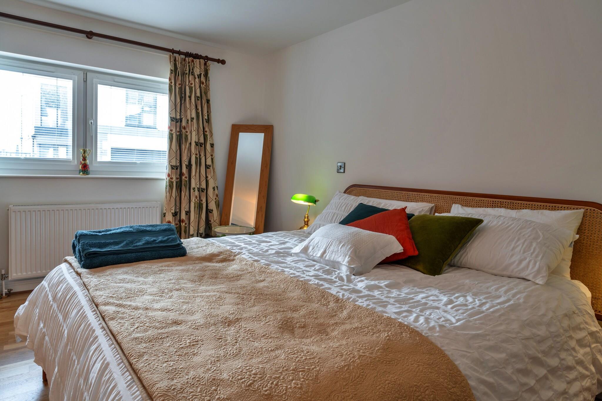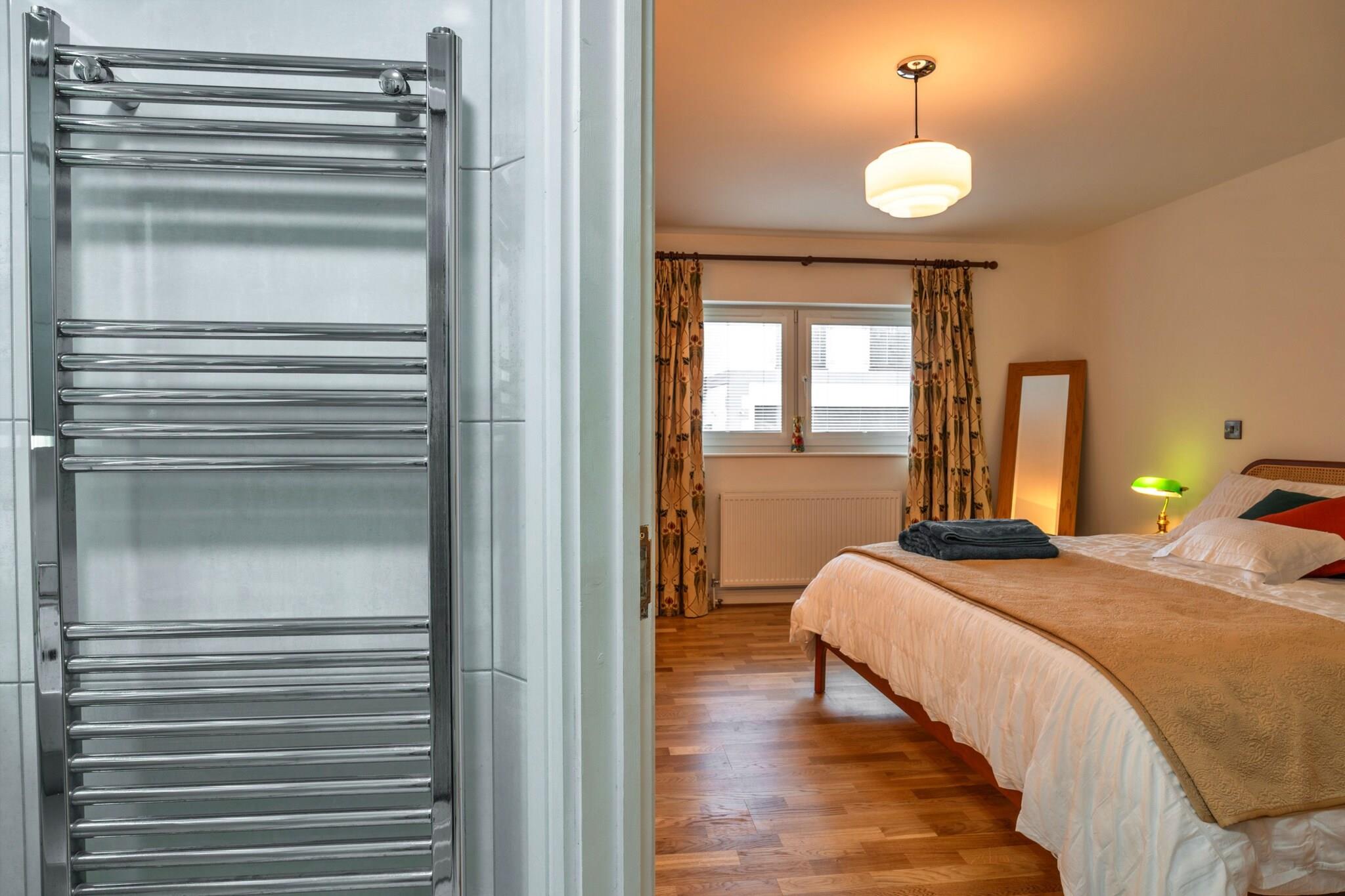 Første etasje: (soveværelse(enkeltseng, enkeltseng), soveværelse(king size dobbeltseng), Sovrum med badrum(king size dobbeltseng, badekar), bad(dusj), bad(toalett), Internett-tilgang) i 2. etasje: (åpent kjøkken(vannkoker, brødrister, stekovn, mikrobølgeovn, oppvaskmaskin, kjøleskap med fryser, ), Stue/spisestue(TV, spisebord, sittehjørne)) tørketrommel, vaskemaskin, oppvarming(sentral), terrasse, parkering, strykejern