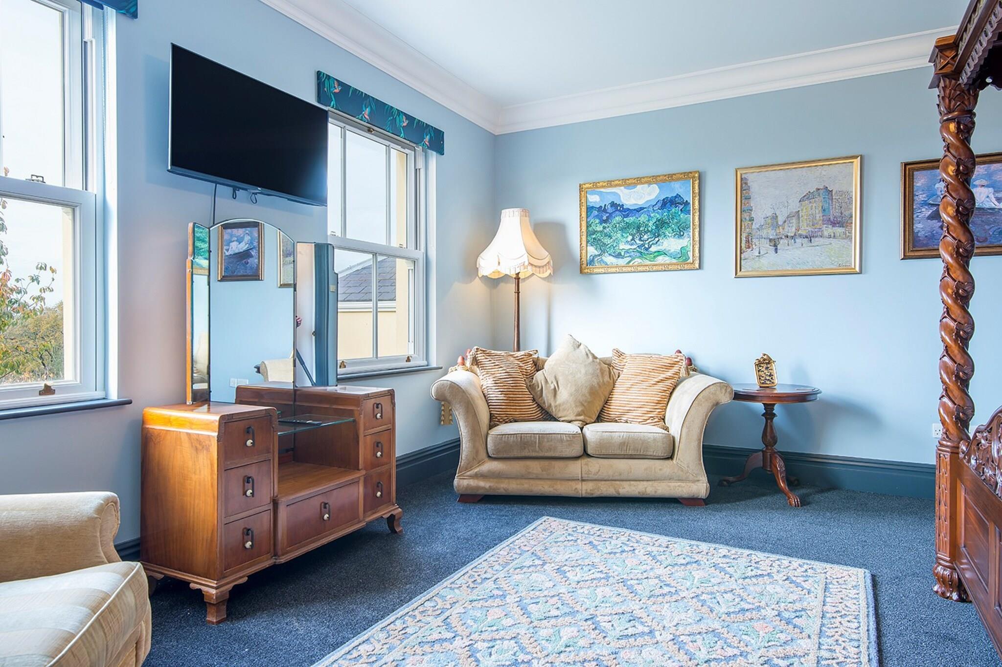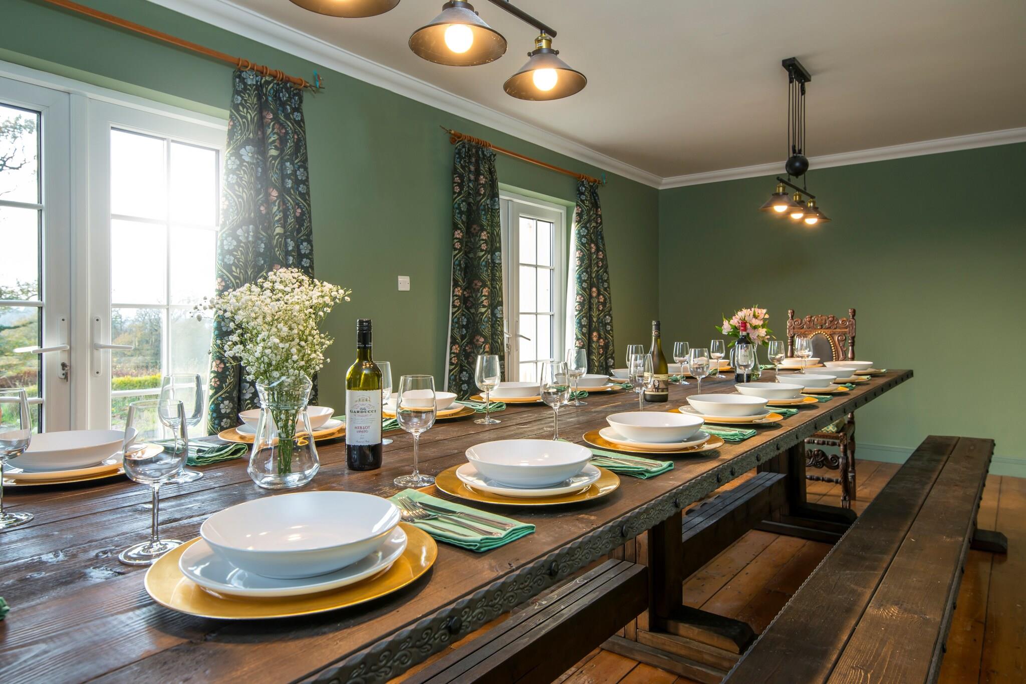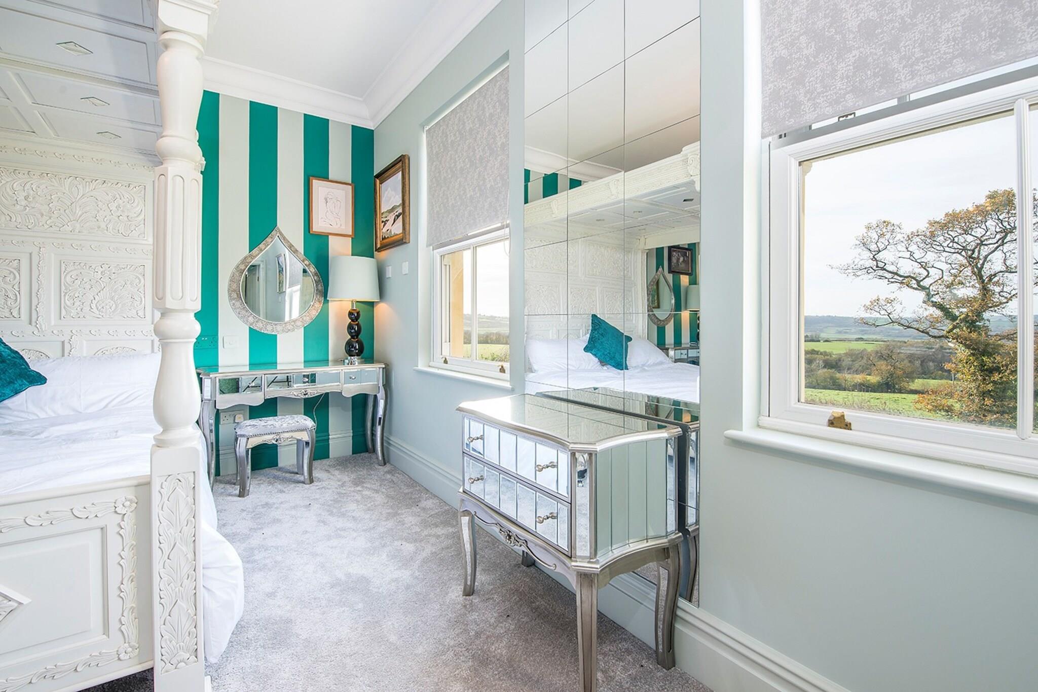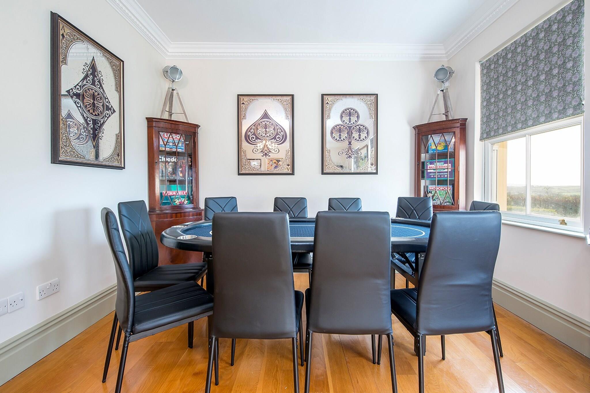 Dette majestetiske herskapshuset i georgiansk stil i Carmarthen tilbyr den ultimate luksusferien for store grupper og familier. Denne storslåtte eiendommen ble nylig renovert i 2025, og kombinerer historisk sjarm med moderne bekvemmeligheter, med et innendørs svømmebasseng, badstue, dampbad, privat kino og spillrom. Med overnatting for opptil 24 gjester, er det perfekt for familiegjenforeninger, spesielle feiringer eller en uforglemmelig ferie med venner. Eiendommen ligger innenfor 1,8 hektar med vakkert anlagte hager, og kan skilte med fantastisk panoramautsikt over Lower Towy Valley. Hovedhuset tilbyr ni luksuriøse soverom over to fløyer, hver oppkalt etter de ikoniske fossene til Brecon Beacons. Et tilpasset anneks gir ekstra overnatting, ideelt for gjester med mobilitetsbehov. Leisure Wing er et fristed for avslapning, og tilbyr et 12m x 6m innendørsbasseng, oppvarmede solsenger, et 6-personers boblebad og et familievennlig område med bordtennisbord og stor TV. Den vidstrakte eiendommen har også et flerbruksområde for pickleball eller fotball, samt et lekeområde for piratskip for yngre gjester. Innvendig finner du et kjøkken i familiestil, et andre mindre kjøkken for store grupper og en elegant spisestue med plass til opptil 24 gjester. For underholdning er det et spillrom, musikkrom, biljardrom og til og med en jukeboks med en discoball for å danse hele natten. Med gjennomtenkte fasiliteter som en elbil-lader og kjæledyrvennlige alternativer (opptil to hunder tillatt), sikrer denne luksuriøse eiendommen at oppholdet ditt er like komfortabelt og praktisk som det er minneverdig. Enten du slapper av ved bassenget, utforsker hagen eller nyter et vell av underholdningsalternativer, lover denne eiendommen en uforglemmelig opplevelse i hjertet av Wales.
