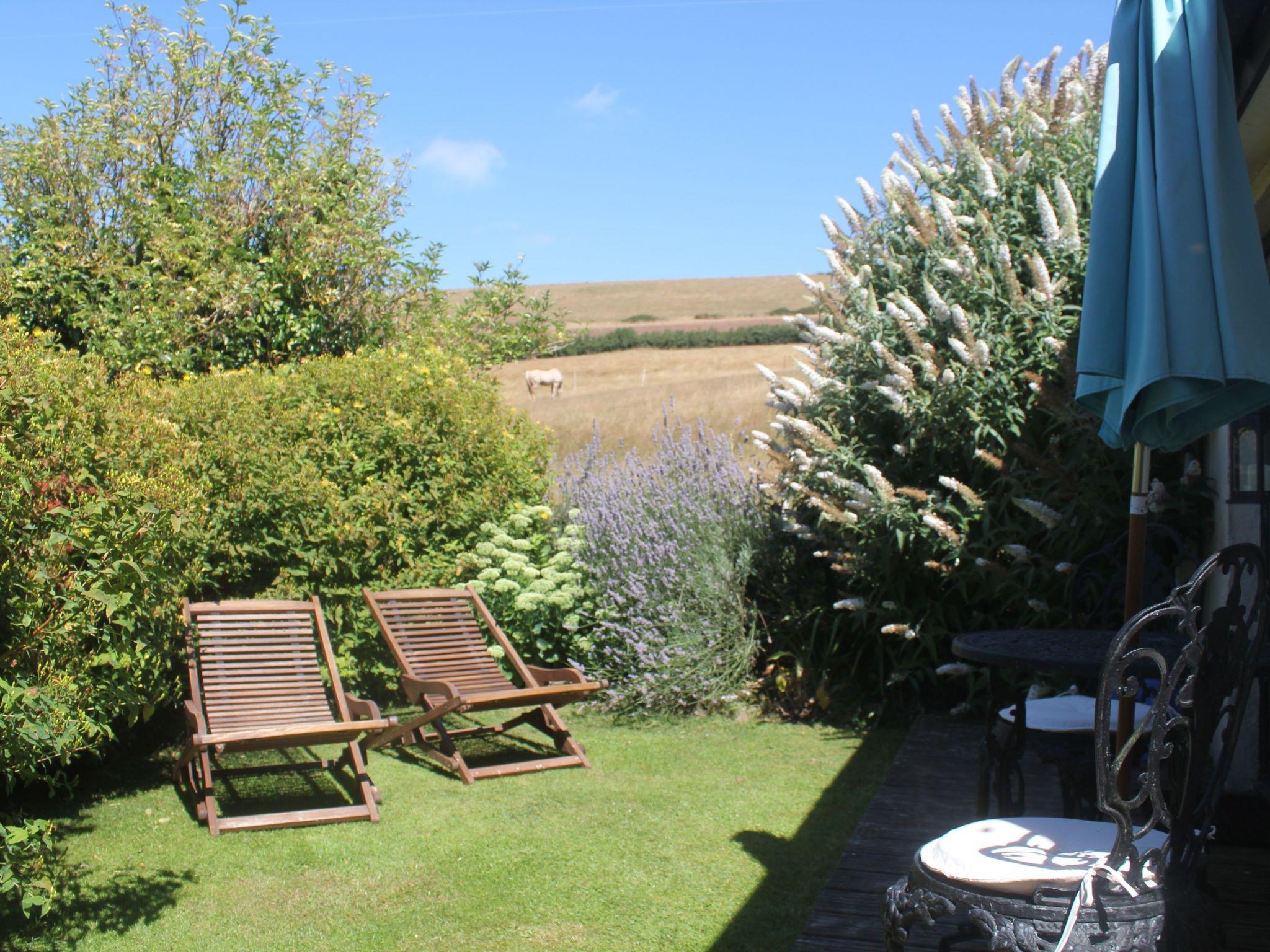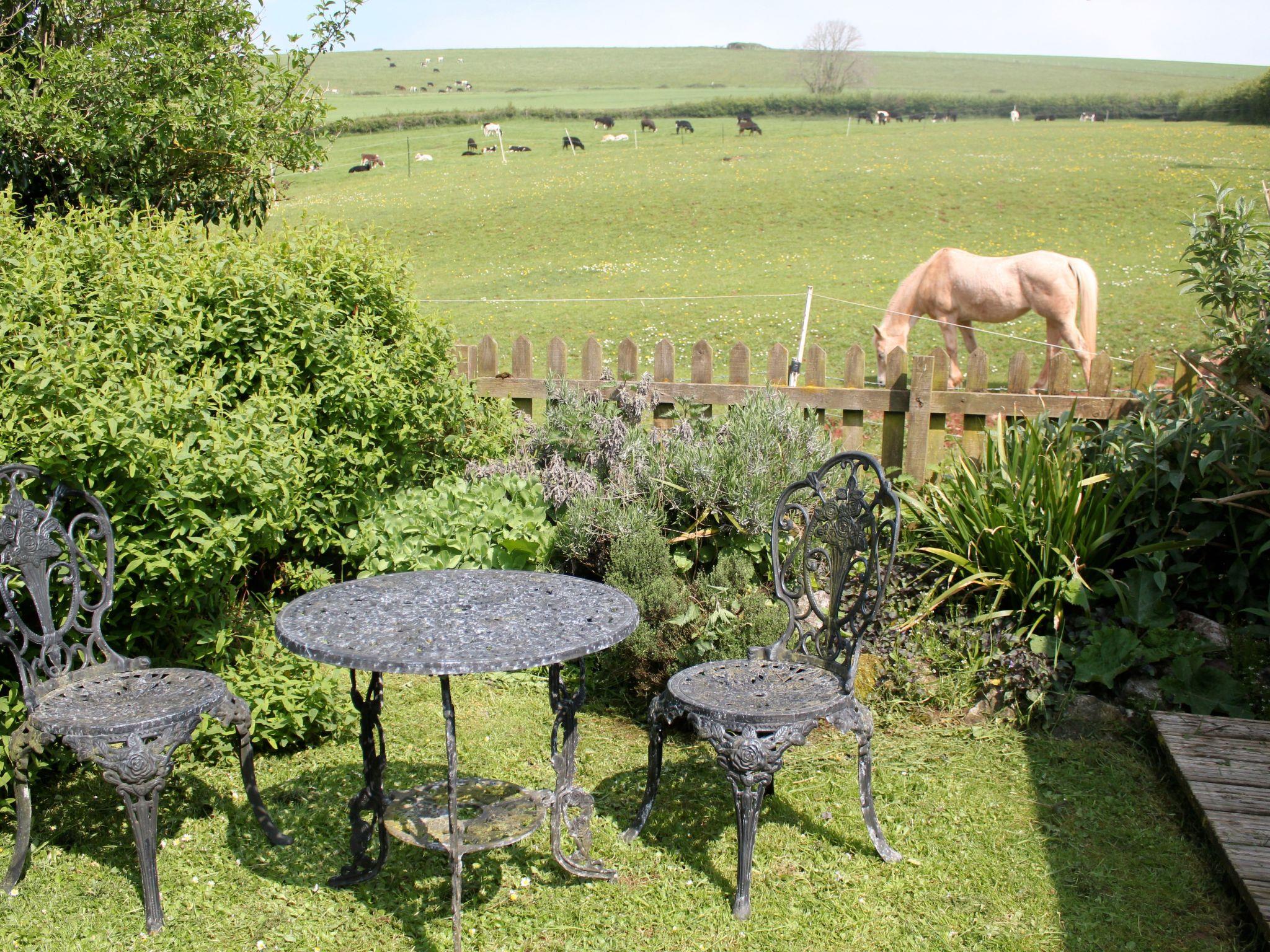The entrance is through the private gates to the courtyard where there is parking for one car. Walk through the wicket gate and into the small private garden which overlooks beautiful pasture fields and across to the moor.