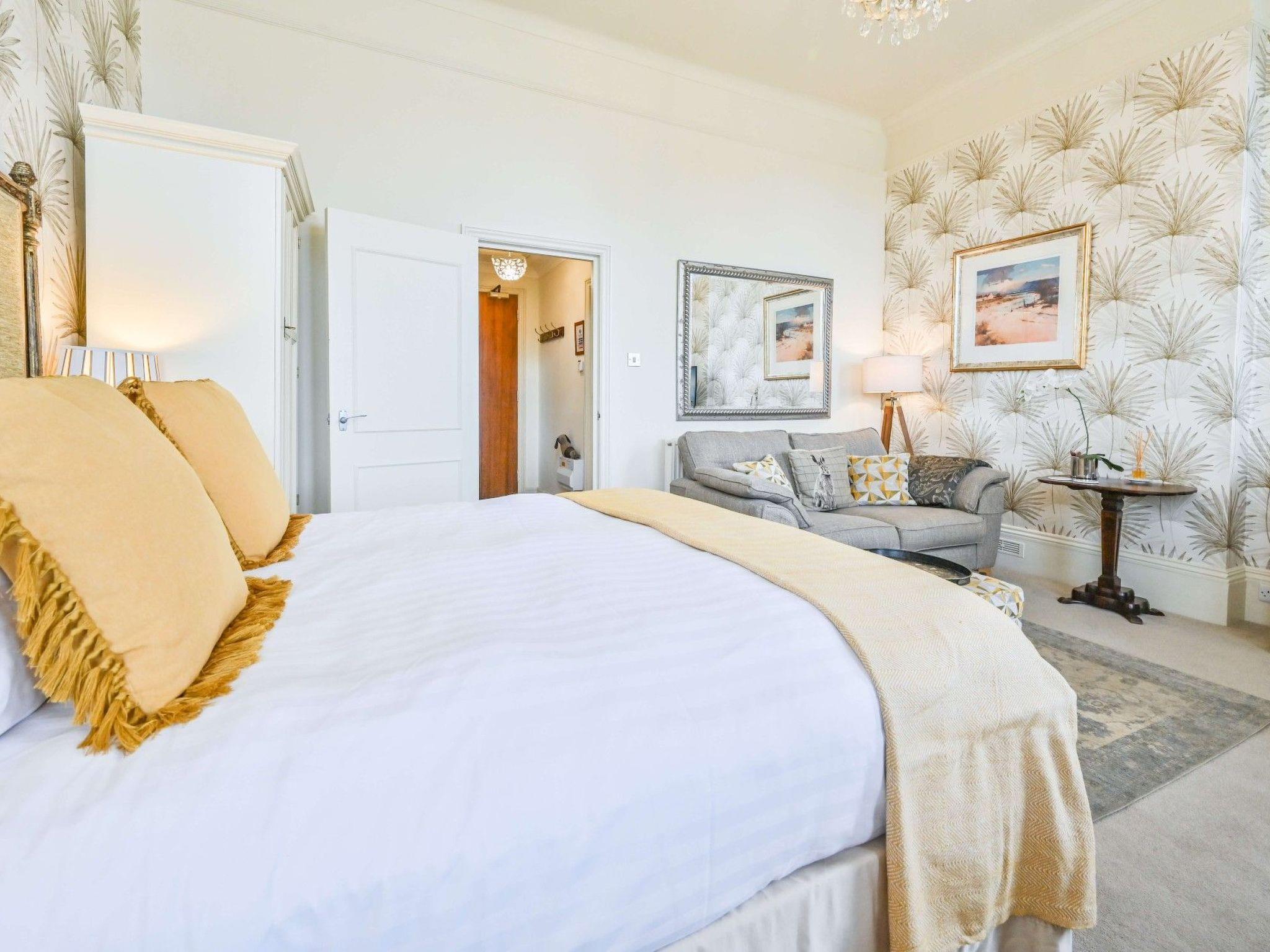 With more than 31 square meters of space, the apartment is surprisingly spacious and it benefits from a large bay window with distant sea glimpses. There is a luxury king sized bed (5 foot width) and a wardrobe. All bedding and towels are included in the rate and for guests staying for more than seven nights we undertake a complimentary bedding and towel change as well as a light clean. The apartment also features a seating area with a sofa and side tables as well as a dining table and chairs where guests can also work if on business. Free super-fast WIFI is included in the rate. In addition, the apartment has a separate kitchen which has an electric oven with a four plate electric hob. There is also a microwave, coffee maker, dishwasher and a fridge. We supply guests with a complimentary welcome pack of teas, coffees and milk etc. The property has a communal laundry room (at garden level) with coin operated washers and dryers. We supply guests with complimentary detergent. There are ironing facilities here too Finally, there is a shower room with electric shower, wash basin and toilet.