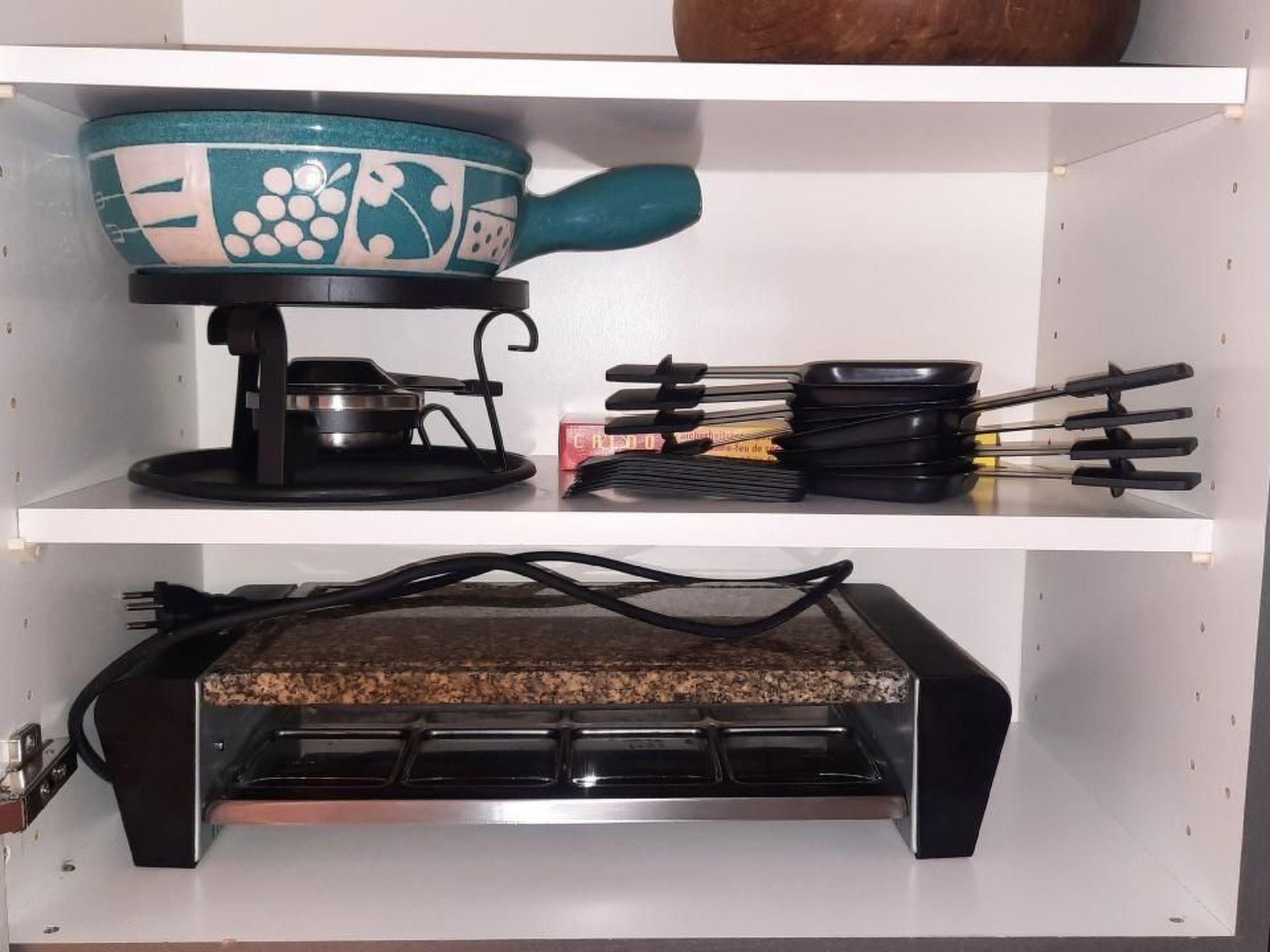 Other kitchen equipment (kitchen1): Fondue and raclette set, free Delizio coffee capsules, ground coffee, sugar, salt, pepper, vinegar, oil, wok pan, everything a household needs.