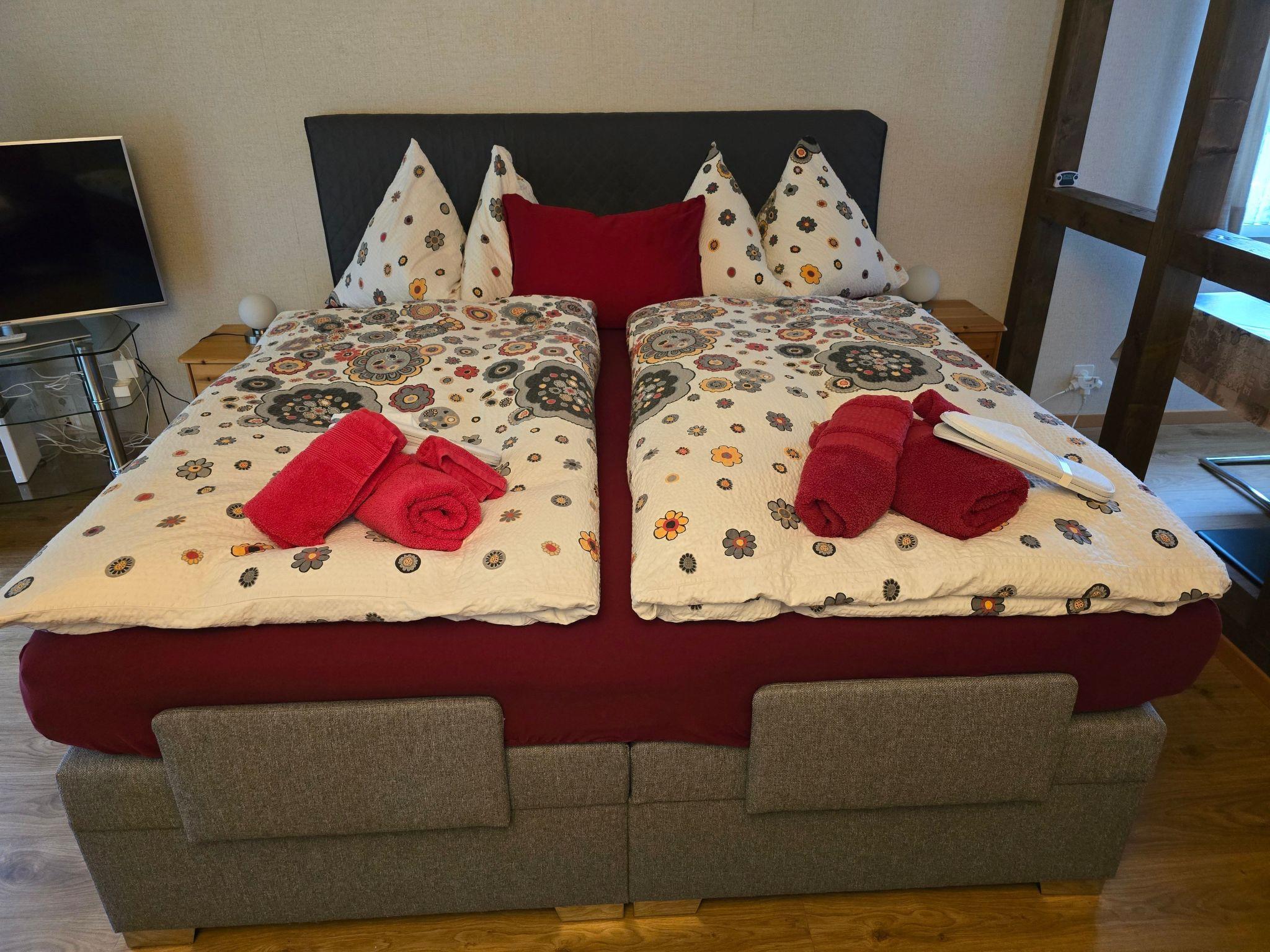 Inside, a spacious and lovingly furnished one-bedroom flat designed for up to two people awaits you. The living room and bedroom feature a new box-spring bed (from 2024), which promises unrivalled sleeping comfort, and a new corner upholstered suite (also from 2024). A large smart flat-screen TV, Wi-Fi and an open-plan kitchen with modern amenities such as a dishwasher, fridge with freezer compartment, oven, coffee machine, toaster, microwave and a 4-ring electric hob round off the offer. There is also a cosy dining area and a bathroom with shower/WC.
