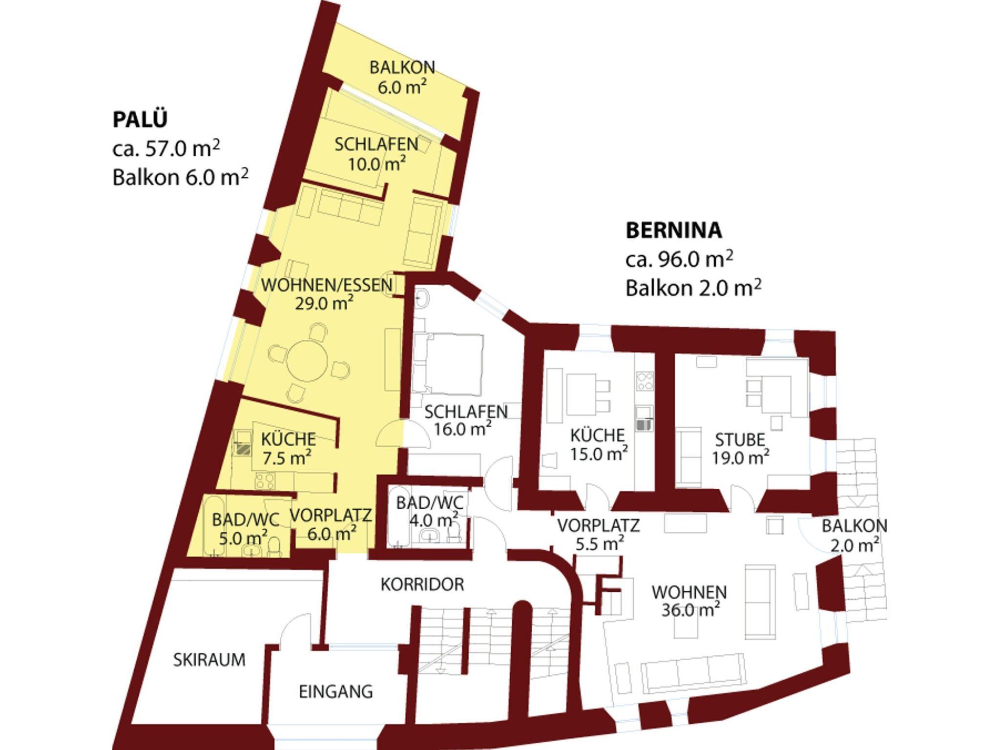 The 2½-room apartment Palü is located on the ground floor of the historic Chesa Michel and offers a cozy home for up to 4 people on 57 m2 (normal occupancy 2). The apartment is decorated in a traditional Engadine style and partly furnished with antique furniture.