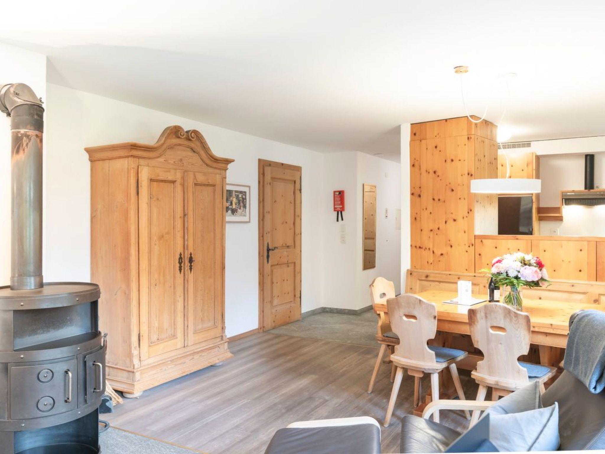 The open-plan living and dining area has a Swiss stone pine kitchen with a stove, oven, dishwasher, large fridge and Nespresso machine. A Swedish stove provides cosy warmth. Two additional beds are available in the living area.