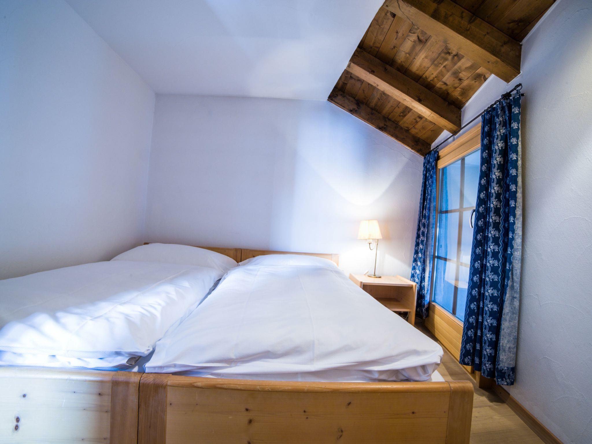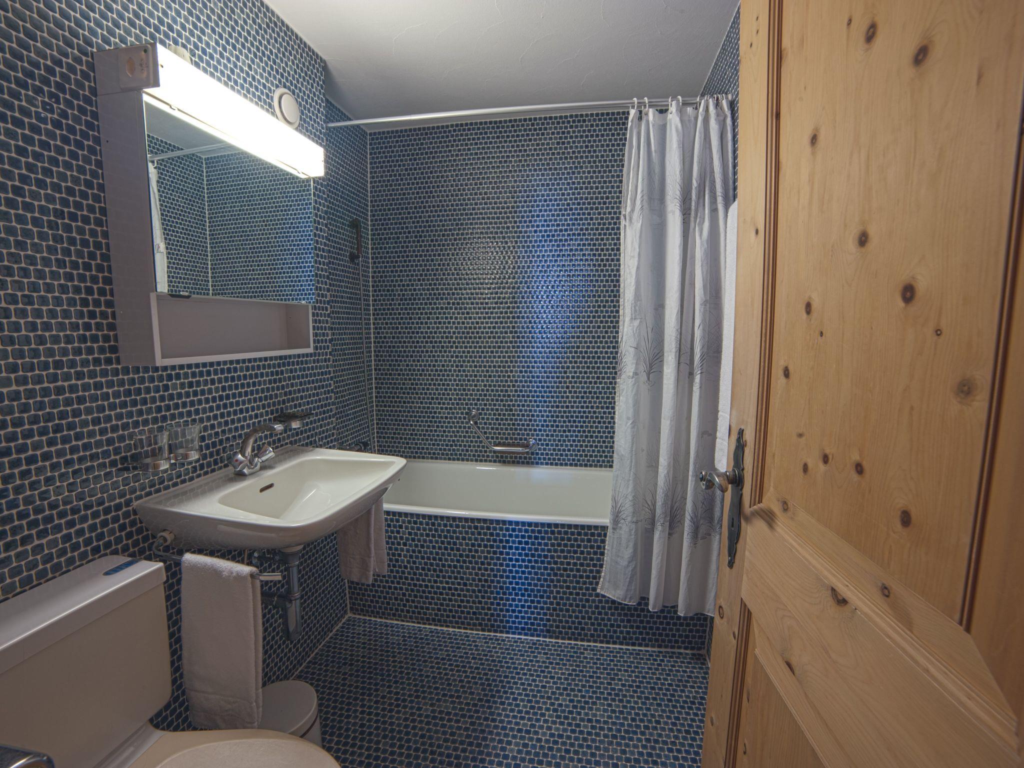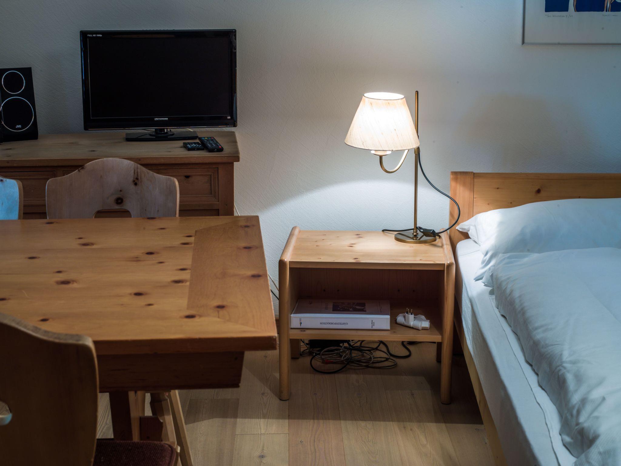 The apartment Roseg has an open living and dining area with a Swiss pine kitchen, equipped with a large refrigerator, oven, dishwasher and Nespresso machine. A Swedish stove provides a cozy atmosphere. Two additional beds are available in the living area. The separate bedroom is equipped with two single beds. The bathroom has a bathtub with shower attachment, toilet and sink.